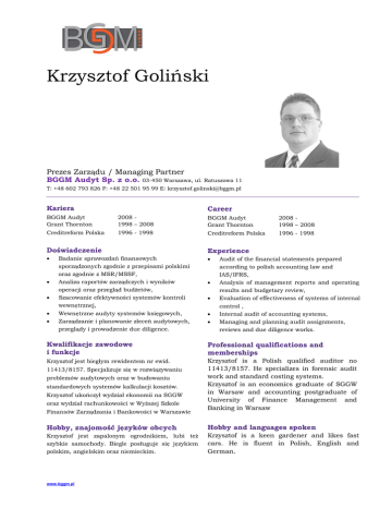 Krzysztof Goliński Prezes Zarządu / Managing Partner BGGM Audyt Sp. z o.o. 03-450 Warszawa, ul. Ratuszowa 11 T: +48 602 793 826 F: +48 22 501 95 99 E: [email protected] Kariera Career BGGM Audyt Grant Thornton 2008 1998 – 2008 BGGM Audyt Grant Thornton 2008 1998 – 2008 Creditreform Polska 1996 - 1998 Creditreform Polska 1996 - 1998 Doświadczenie Experience Badanie sprawozdań finansowych sporządzonych zgodnie z przepisami polskimi oraz zgodnie z MSR/MSSF, Analiza raportów zarządczych i wyników operacji oraz przegląd budżetów, Szacowanie efektywności systemów kontroli wewnętrznej, Wewnętrzne audyty systemów księgowych, Zarządzanie i planowanie zleceń audytowych, przeglądy i prowadzenie due diligence. Audit of the financial statements prepared according to polish accounting law and IAS/IFRS, Analysis of management reports and operating results and budgetary review, Evaluation of effectiveness of systems of internal control , Internal audit of accounting systems, Managing and planning audit assignments, reviews and due diligence works. Kwalifikacje zawodowe i funkcje Professional qualifications and memberships Krzysztof jest biegłym rewidentem nr ewid. Krzysztof is a Polish qualified auditor no 11413/8157. He specializes in forensic audit work and standard costing systems. Krzysztof is an economics graduate of SGGW in Warsaw and accounting postgraduate of University of Finance Management and Banking in Warsaw 11413/8157. Specjalizuje się w rozwiązywaniu problemów audytowych oraz w budowaniu standardowych systemów kalkulacji kosztów. Krzysztof ukończył wydział ekonomii na SGGW oraz wydział rachunkowości w Wyższej Szkole Finansów Zarządzania i Bankowości w Warszawie Hobby, znajomość języków obcych Hobby and languages spoken Krzysztof jest zapalonym ogrodnikiem, lubi też szybkie samochody. Biegle posługuje się językiem polskim, angielskim oraz niemieckim. Krzysztof is a keen gardener and likes fast cars. He is fluent in Polish, English and German. www.bggm.pl
