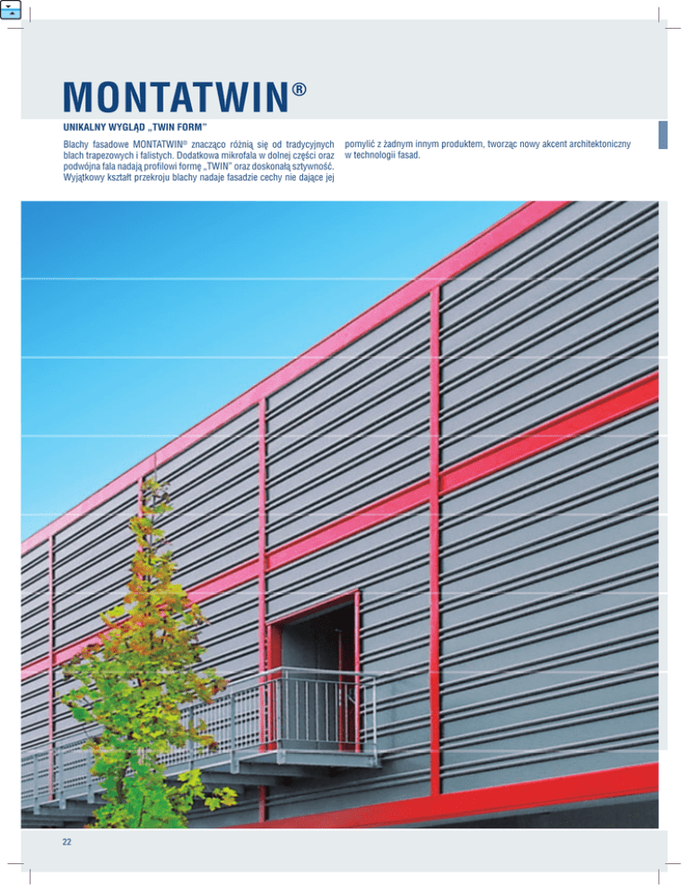 MONTATWIN ® UNIKALNY WYGLĄD „TWIN FORM” Blachy fasadowe MONTATWIN® znacząco różnią się od tradycyjnych blach trapezowych i falistych. Dodatkowa mikrofala w dolnej części oraz podwójna fala nadają profilowi formę „TWIN” oraz doskonałą sztywność. Wyjątkowy kształt przekroju blachy nadaje fasadzie cechy nie dające jej 22 pomylić z żadnym innym produktem, tworząc nowy akcent architektoniczny w technologii fasad. MT 33/333 MT 33/333 A 1.00 0.80 0.70 PROFIL PERFORACJA GRUBOŚĆ mm BLACHY FASADOWE ALUMINIOWE I STALOWE Widoczne mocowanie, lico z mikrofalą, na zamówienie z perforacją Ø=3 mm / rozstaw 5.5 mm STAL kg/m2 7.00 8.00 10.00 ALU 2.75 3.44 kg/m2 DXF www.montana-ag.ch Broszura szczegółowa Informacje techniczne DXF Tabele obciążeń Zalecenia montażowe Wzornik kolorów CD-ROM 23