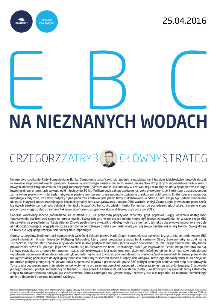 25.04.2016 Kwietniowe spotkanie Rady Europejskiego Banku Centralnego zakończyło się zgodnie z oczekiwaniami brakiem jakichkolwiek nowych decyzji w zakresie stóp procentowych i programu luzowania ilościowego. Poznaliśmy za to szereg szczegółów dotyczących zaprezentowanych w marcu nowych środków. Program zakupu obligacji korporacyjnych (CSPP) zostanie uruchomiony w czerwcu tego roku. Będzie dotyczył papierów o ratingu inwestycyjnym, o terminach wykupu od 6 miesięcy do 30 lat. Możliwe będą zakupy zarówno na rynku pierwotnym, jak i wtórnym, z zastrzeżeniem, że na rynku pierwotnym nie będą nabywane papiery emitowane przez podmioty związane z sektorem publicznym. Emitentem nie może być instytucja kredytowa, zaś skup dotyczy tylko papierów emitowanych przez firmy zlokalizowane w Strefie Euro. Mogą być jednak skupowane obligacje instytucji ubezpieczeniowych. Jako maksymalny limit zaangażowania ustalono 70% wartości emisji. Zakupy będą prowadzone przez sześć krajowych banków centralnych: belgijski, niemiecki, hiszpański, francuski, włoski i fiński. Komunikat po posiedzeniu głosi także, iż ujemne stopy procentowe mogą zostać utrzymane także po zakończeniu programów skupu aktywów czyli poza rok 2017. Podczas konferencji mocno podkreślano, że działania EBC już przynoszą pozytywne rezultaty, gdyż poprawie uległy wskaźniki dostępności finansowania dla firm, zaś popyt na kredyt wzrósł. Łyżką dziegciu w tej beczce miodu mogły być jednak zapewnienia, że w razie czego EBC nie zawaha się przed intensyfikacją działań. Znowu padły słowa o wszelkich dostępnych instrumentach, tak jakby obserwowana poprawa nie była aż tak przekonywująca. Wygląda na to, że szef banku centralnego Strefy Euro nadal wierzy w siłę słowa bardziej niż w siłę faktów. Swoją drogą, te fakty nie wyglądają rzeczywiście szczególnie imponująco. Oprócz szczegółów implementacji ogłoszonych wcześniej działań, prezes Mario Draghi sporo miejsca poświęcił krytyce, jaką ostatnio wobec EBC zgłosił niemiecki minister finansów Wolfgang Schaeuble, który uznał prowadzaną przez bank centralny Strefy Euro politykę za zbyt luźną. To rzadkość, aby minister finansów wzywał do zacieśniania polityki monetarnej, można wręcz powiedzieć, że role uległy odwróceniu. Aby bronić prowadzonej przez EBC polityki, jego szef powołał się na niezależność banku centralnego, traktując wypowiedzi Schaeublego jako atak na nią. I znowu paradoks, bo z reguły ten argument pada, gdy krytykowana jest nadmierna restrykcyjność. Jeżeli jednak minister finansów poddaje pod wątpliwość nadmierną akomodacyjność polityki monetarnej, to jest to coś, co powinno dawać do myślenia. Szef niemieckich finansów przez wiele lat wyróżniał się podejściem do dyscypliny finansów publicznych spośród swoich europejskich kolegów. Teraz jego niepokój budzi to, co dzieje się po stronie polityki pieniężnej. Na pewno duża niepewność wynika z prowadzenia przez EBC polityki ujemnych nominalnych stóp procentowych. To sytuacja bez precedensu i nie wiadomo, jak wpłynie na organizm europejskiej gospodarki, zwłaszcza że jest on tak zróżnicowany. Stosowanie jednego szablonu polityki monetarnej do Niemiec i Grecji przez kilkanaście lat od powstania Strefy Euro skończyło się spektakularną katastrofą. A była to konwencjonalna polityka. Jak zróżnicowana Europa zareaguje na ujemne stopy? Niestety, nie wie tego nikt, co niepokoi niemieckiego ministra finansów i powinno niepokoić każdego. Niniejszy dokument jest jedynie materiałem informacyjnym do użytku odbiorcy. Nie powinien być rozumiany jako materiał o charakterze doradczym lub jako podstawa do podejmowania decyzji inwestycyjnych. Nie powinien też być rozumiany jako rekomendacja inwestycyjna. Wszystkie opinie i prognozy przedstawione w tym opracowaniu są jedynie wyrazem opinii autorów w dniu publikacji i mogą ulec zmianie bez zapowiedzi. Skarbiec TFI SA nie ponosi odpowiedzialności za jakiekolwiek decyzje inwestycyjne podjęte na podstawie niniejszego opracowania. Wymagane prawem informacje dotyczące subfunduszy, w tym o czynnikach ryzyka inwestycyjnego znajdują się w prospekcie informacyjnym SKARBIEC FIO i Kluczowych Informacjach dla Klientów, dostępnych w siedzibie SKARBIEC TFI SA w serwisie skarbiec.pl i w sieci sprzedaży. Subfundusze nie gwarantują osiągnięcia określonego celu i wyniku inwestycyjnego, a uczestnik ponosi ryzyko utraty części wpłaconych środków.