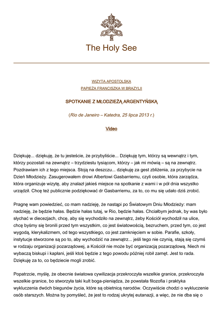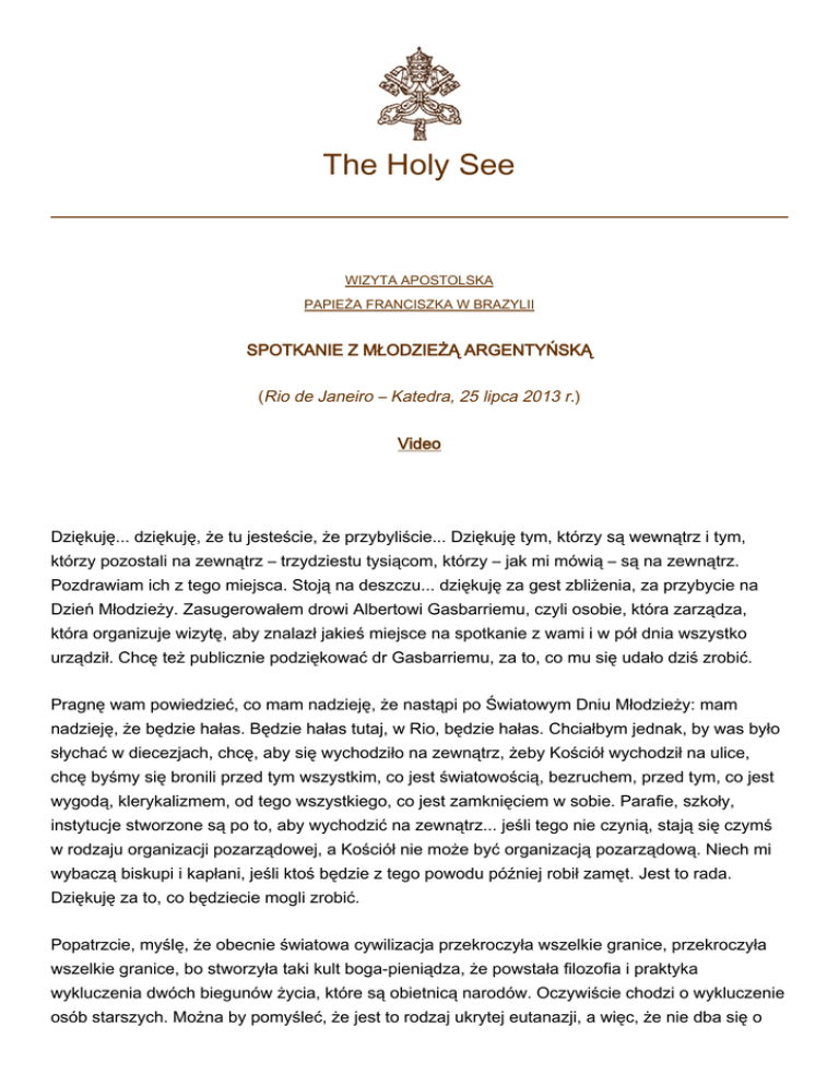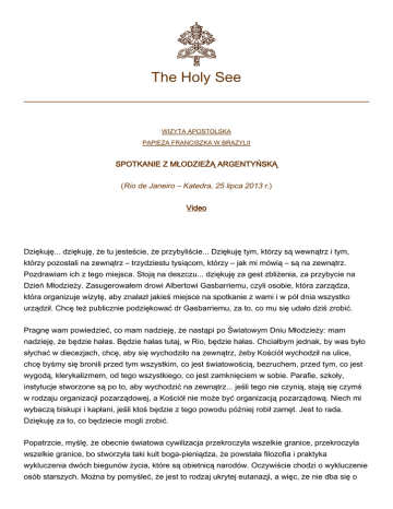 The Holy See WIZYTA APOSTOLSKA PAPIEŻA FRANCISZKA W BRAZYLII SPOTKANIE Z MŁODZIEŻĄ ARGENTYŃSKĄ (Rio de Janeiro – Katedra, 25 lipca 2013 r.) Video Dziękuję... dziękuję, że tu jesteście, że przybyliście... Dziękuję tym, którzy są wewnątrz i tym, którzy pozostali na zewnątrz – trzydziestu tysiącom, którzy – jak mi mówią – są na zewnątrz. Pozdrawiam ich z tego miejsca. Stoją na deszczu... dziękuję za gest zbliżenia, za przybycie na Dzień Młodzieży. Zasugerowałem drowi Albertowi Gasbarriemu, czyli osobie, która zarządza, która organizuje wizytę, aby znalazł jakieś miejsce na spotkanie z wami i w pół dnia wszystko urządził. Chcę też publicznie podziękować dr Gasbarriemu, za to, co mu się udało dziś zrobić. Pragnę wam powiedzieć, co mam nadzieję, że nastąpi po Światowym Dniu Młodzieży: mam nadzieję, że będzie hałas. Będzie hałas tutaj, w Rio, będzie hałas. Chciałbym jednak, by was było słychać w diecezjach, chcę, aby się wychodziło na zewnątrz, żeby Kościół wychodził na ulice, chcę byśmy się bronili przed tym wszystkim, co jest światowością, bezruchem, przed tym, co jest wygodą, klerykalizmem, od tego wszystkiego, co jest zamknięciem w sobie. Parafie, szkoły, instytucje stworzone są po to, aby wychodzić na zewnątrz... jeśli tego nie czynią, stają się czymś w rodzaju organizacji pozarządowej, a Kościół nie może być organizacją pozarządową. Niech mi wybaczą biskupi i kapłani, jeśli ktoś będzie z tego powodu później robił zamęt. Jest to rada. Dziękuję za to, co będziecie mogli zrobić. Popatrzcie, myślę, że obecnie światowa cywilizacja przekroczyła wszelkie granice, przekroczyła wszelkie granice, bo stworzyła taki kult boga-pieniądza, że powstała filozofia i praktyka wykluczenia dwóch biegunów życia, które są obietnicą narodów. Oczywiście chodzi o wykluczenie osób starszych. Można by pomyśleć, że jest to rodzaj ukrytej eutanazji, a więc, że nie dba się o 2 osoby starsze. Ale jest też eutanazja kulturowa, bo nie pozwala się im mówić, nie pozwala się im działać. I wykluczenie młodzieży. Odsetek młodych ludzi bez pracy, bezrobotnych jest bardzo wysoki i mamy pokolenie, które nie doświadczyło godności zdobytej przez pracę. Ta cywilizacja doprowadziła nas do wykluczenia dwóch szczytów, które są naszą przyszłością. A więc młodzi: powinni się wybijać, pokazywać, co potrafią. Młodzi muszą iść walczyć o wartości, walczyć o te wartości. Natomiast osoby starsze powinny otworzyć usta, otworzyć usta i nas uczyć! Przekażcie nam mądrość narodów! Ludzi starszych w Argentynie proszę z całego serca: nie przestawajcie być bogactwem kulturowym naszego narodu, bogactwem przekazującym sprawiedliwość, historię, wartości, przekazującym pamięć narodu. A was proszę: nie walczcie ze starszymi: pozwólcie im mówić, wysłuchajcie ich i idźcie naprzód. Ale wiedzcie, że w tej chwili wy, młodzi, i osoby starsze, jesteście skazani na ten sam los: wykluczenie. Nie dajcie się wykluczyć. To jasne! Myślę, że o to właśnie musicie zabiegać. Wiara w Jezusa Chrystusa to nie bagatela, to sprawa bardzo poważna. Zgorszeniem jest to, że Bóg przyszedł, aby być jednym z nas. Zgorszeniem jest to, że umarł na krzyżu. To zgorszenie: zgorszenie krzyża. Krzyż nadal budzi zgorszenie. Ale jest to jedyna pewna droga: droga krzyża, droga Jezusa, droga Wcielenia Jezusa. Proszę, nie róbcie koktajlu z wiary w Jezusa Chrystusa. Jest koktajl pomarańczowy, jabłkowy, bananowy, ale proszę, nie pijcie "koktajlu" z wiary. Wiara jest całością, nie można jej miksować. Jest to wiara w Jezusa. Jest to wiara w Syna Bożego, który stał się człowiekiem, który mnie umiłował i umarł za mnie. Tak więc: niech was usłyszą; dbajcie o krańcowe elementy społeczności, jakimi są starsi i młodzież. Nie dajcie się wykluczyć i niech ludzie starsi nie będą wykluczani. Po drugie: nie „rozdrabniajcie” wiary w Jezusa Chrystusa. Błogosławieństwa. Ojcze, co mamy zrobić? Czytajcie Błogosławieństwa, to ci dobrze zrobi. Jeśli chcesz wiedzieć, co konkretnie należy robić, przeczytaj 25 rozdział św. Mateusza, będący zbiorem zasad, według których będziemy sądzeni. Te dwa teksty wyznaczą wam plan działania: Błogosławieństwa i Mateusz 25. Nie trzeba czytać niczego innego. Proszę was o to z całego serca. Dobrze, dziękuję wam za tę bliskość. Przykro mi, że jesteście oddzieleni, ale powiem wam jedno. Ja czasami doświadczam, jakie to nieprzyjemne być „w klatce”. Wyznaję to z serca i was rozumiem. Chciałbym być bliżej was, ale rozumiem, że względy bezpieczeństwa powodują, że nie jest to możliwe. Dziękuję za przybycie, dziękuję za modlitwy za mnie. Proszę was o nie z całego serca, bo bardzo potrzebuję waszych modlitw, bardzo ich potrzebuję. Dziękuję za nie. Cóż, chcę udzielić wam błogosławieństwa, a następnie pobłogosławimy obraz Matki Bożej, który będzie pielgrzymował po całej Republice... i krzyż świętego Franciszka, które będą pielgrzymowały w duchu misyjnym. Pamiętajcie: niech was będzie słychać, troszczcie się o dwa istotne elementy życia, dwa ważne elementy historii narodów, którymi są ludzie starsi i młodzież i nie rozdrabniajcie wiary. A teraz pomódlmy się, będziemy błogosławić obraz Matki Bożej, a następnie udzielę wam błogosławieństwa. Powstańmy na błogosławieństwo, ale najpierw chcę jeszcze podziękować za wypowiedziane słowa arcybiskupowi Arancedo, bo mu jak prawdziwy prostak nie podziękowałem. Tak więc dziękuję za twoje słowa! 3 Na zakończenie Papież Franciszek przeżegnał się, odmówił „Zdrowaś Maryjo” i następującą modlitwę: Panie, Ty dałeś nam swoją Matkę, aby nam towarzyszyła, Aby o nas się troszczyła i chroniła nas na naszej drodze, w naszym sercu, w naszej wierze. Aby czyniła 