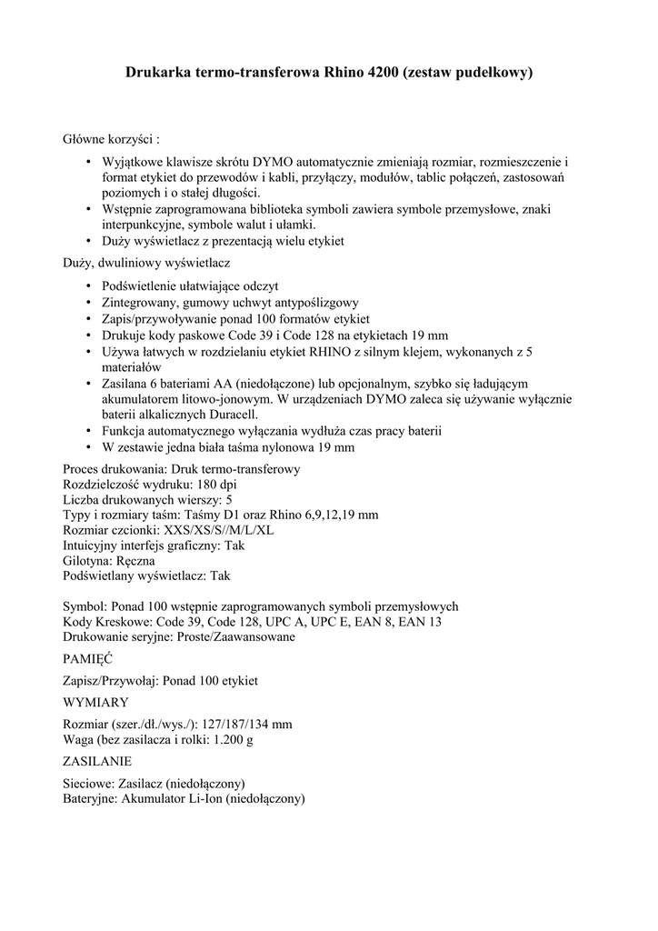 Drukarka termo-transferowa Rhino 4200 (zestaw pudełkowy) Główne korzyści : • Wyjątkowe klawisze skrótu DYMO automatycznie zmieniają rozmiar, rozmieszczenie i format etykiet do przewodów i kabli, przyłączy, modułów, tablic połączeń, zastosowań poziomych i o stałej długości. • Wstępnie zaprogramowana biblioteka symboli zawiera symbole przemysłowe, znaki interpunkcyjne, symbole walut i ułamki. • Duży wyświetlacz z prezentacją wielu etykiet Duży, dwuliniowy wyświetlacz Podświetlenie ułatwiające odczyt Zintegrowany, gumowy uchwyt antypoślizgowy Zapis/przywoływanie ponad 100 formatów etykiet Drukuje kody paskowe Code 39 i Code 128 na etykietach 19 mm Używa łatwych w rozdzielaniu etykiet RHINO z silnym klejem, wykonanych z 5 materiałów • Zasilana 6 bateriami AA (niedołączone) lub opcjonalnym, szybko się ładującym akumulatorem litowo-jonowym. W urządzeniach DYMO zaleca się używanie wyłącznie baterii alkalicznych Duracell. • Funkcja automatycznego wyłączania wydłuża czas pracy baterii • W zestawie jedna biała taśma nylonowa 19 mm • • • • • Proces drukowania: Druk termo-transferowy Rozdzielczość wydruku: 180 dpi Liczba drukowanych wierszy: 5 Typy i rozmiary taśm: Taśmy D1 oraz Rhino 6,9,12,19 mm Rozmiar czcionki: XXS/XS/S//M/L/XL Intuicyjny interfejs graficzny: Tak Gilotyna: Ręczna Podświetlany wyświetlacz: Tak Symbol: Ponad 100 wstępnie zaprogramowanych symboli przemysłowych Kody Kreskowe: Code 39, Code 128, UPC A, UPC E, EAN 8, EAN 13 Drukowanie seryjne: Proste/Zaawansowane PAMIĘĆ Zapisz/Przywołaj: Ponad 100 etykiet WYMIARY Rozmiar (szer./dł./wys./): 127/187/134 mm Waga (bez zasilacza i rolki: 1.200 g ZASILANIE Sieciowe: Zasilacz (niedołączony) Bateryjne: Akumulator Li-Ion (niedołączony)
