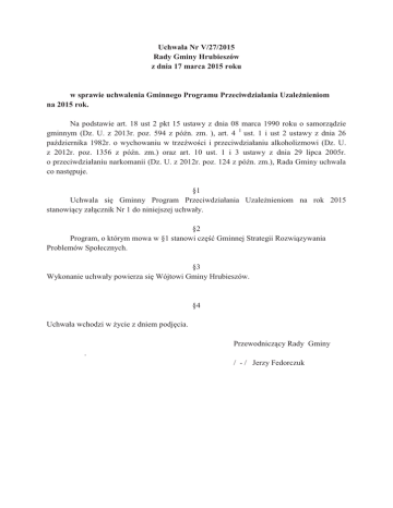 Uchwała Nr V/27/2015 Rady Gminy Hrubieszów z dnia 17 marca 2015 roku w sprawie uchwalenia Gminnego Programu Przeciwdziałania Uzależnieniom na 2015 rok. Na podstawie art. 18 ust 2 pkt 15 ustawy z dnia 08 marca 1990 roku o samorządzie gminnym (Dz. U. z 2013r. poz. 594 z późn. zm. ), art. 4 1 ust. 1 i ust 2 ustawy z dnia 26 października 1982r. o wychowaniu w trzeźwości i przeciwdziałaniu alkoholizmowi (Dz. U. z 2012r. poz. 1356 z późn. zm.) oraz art. 10 ust. 1 i 3 ustawy z dnia 29 lipca 2005r. o przeciwdziałaniu narkomanii (Dz. U. z 2012r. poz. 124 z późn. zm.), Rada Gminy uchwala co następuje. §1 Uchwala się Gminny Program Przeciwdziałania Uzależnieniom na rok 2015 stanowiący załącznik Nr 1 do niniejszej uchwały. §2 Program, o którym mowa w §1 stanowi część Gminnej Strategii Rozwiązywania Problemów Społecznych. §3 Wykonanie uchwały powierza się Wójtowi Gminy Hrubieszów. §4 Uchwała wchodzi w życie z dniem podjęcia. Przewodniczący Rady Gminy . / - / Jerzy Fedorczuk Załącznik Nr 1 Do Uchwały Nr V/27/2015 Rady Gminy Hrubieszów z dnia 17 marca 2015 roku GMINNY PROGRAM PRZECIWDZIAŁANIA UZALEŻNIENIOM NA ROK 2015 Hrubieszów,10 luty 2015r. Podstawy prawne Obowiązek corocznego uchwalania gminnego programu przeciwdziałania uzależnieniom wynika z art. 4 ust. 2 ustawy z dnia 26 października 1982 r. o wychowaniu w trzeźwości i przeciwdziałaniu alkoholizmowi (Dz. U. z 2007r Nr 70, poz. 473 ze zm.). Gminny program Przeciwdziałania Uzależnieniom stanowi element Gminnej Strategii Rozwiązywania Problemów Społecznych przyjętej uchwałą Nr XXXVII/205/2014 Rady Gminy Hrubieszów z dnia 30 czerwca 2014 roku, w której określono kierunki działań na rzecz profilaktyki przeciwdziałania uzależnieniom, jakie powinny być podejmowane i realizowane. Ponadto w Gminnym Programie Przeciwdziałania Uzależnieniom zaplanowano również środki finansowe na realizację zadań w zakresie przeciwdziałania narkomanii, jako zadania własne, zgodnie z ustawą o przeciwdziałaniu narkomanii (Dz. U. z 2005r. Nr 179, poz. 1485). Realizacją Gminnego Programu Przeciwdziałania Uzależnieniom zajmuje się Gminny Ośrodek Pomocy Społecznej w Hrubieszowie przy współpracy Gminnej Komisji Rozwiązywania Problemów Alkoholowych, w której składzie działają wykwalifikowane osoby przygotowane do pracy na rzecz tworzenia koalicji trzeźwości na terenie gminy Hrubieszów. Koordynatorem realizacji programu jest pełnomocnik Wójta ds. rozwiązywania problemów alkoholowych. Rozdział I Diagnoza problemu uzależnień na terenie Gminy Hrubieszów Diagnoza problemu uzależnień została przeprowadzona na podstawie badania zrealizowanego przez Stowarzyszenie Producentów i Dziennikarzy Radiowych „Młodzi i substancje psychoaktywne” w 2014 roku. Jakkolwiek problem palenia papierosów i zażywania substancji psychoaktywnych jest w opinii publicznej problemem uświadomionym, to nadal w niektórych grupach społecznych to negatywne zjawisko wydaje się być niedostrzegalne. Najczęściej pierwsze spożycie alkoholu wśród uczniów szkół podstawowych odbywa się z namowy dorosłych, także rodziców. Spożywanie alkoholu przez młodzież może powodować różne problemy zdrowotne, wychowawcze, ale także społeczne, które bez odpowiedniej profilaktyki będą przybierały na sile. Przedmiotem analizy m.in. była weryfikacja przekonań i wiedzy o szkodliwości substancji psychoaktywnych. Poza tym skupiono się na pomiarze natężenia zjawiska używania substancji psychoaktywnych oraz problemie dostępności tych substancji wśród badanej młodzieży. Przeprowadzenie badania na dużej liczbie respondentów pozwoliło na diagnozę zjawiska w wymiarze ogólnopolskim, jak również wymiarze lokalnym i gminnym. Wyniki pochodzą z badania ankietowego przeprowadzonego wśród uczniów szkół podstawowych oraz uczniów szkół gimnazjalnych. Uczniowie szkół podstawowych zgodnie twierdzą, że palenie papierosów jest uzależniające. Na duże ryzyko związane z nałogowym paleniem papierosów wskazuje 89 % chłopców i 90% dziewcząt, natomiast w szkole podstawowej co trzeci uczeń wskazuje na duże ryzyko. Po pierwszego papierosa sięga 15 % uczniów i 6% uczennic szkoły podstawowej . Z kolei spośród uczniów szkół gimnazjalnych po papierosa sięga już 35% chłopców i 33% dziewcząt. Badani najczęściej sięgają po papierosa w wieku 11-12 lat czyli w momencie kończenia edukacji na poziomie szkoły podstawowej oraz w wieku 12-13 lat w momencie nauki na poziomie szkoły gimnazjalnej. Co dziesiąty chłopak – uczeń szkoły gimnazjalnej sięga po co najmniej po jednego papierosa dziennie , co dwudziesty mniej niż raz w tygodniu. Spośród dziewczynek codziennie po papierosa sięga co dwunasta uczennica gimnazjum a co czternasta pali okazjonalnie. W naszej gminie niepalenie deklaruje 50% chłopców i 100 % dziewcząt. Porównując odpowiedzi badanych na pytanie o częstotliwość palenia papierosów z pytaniem o opinię na temat powszechności tego zjawiska wśród rówieśników badanych uczniów, można powiedzieć , że opinia o tym, że rówieśnicy palą papierosy jest bardziej powszechna niż samo palenie papierosów przez respondentów. Dotyczy to zarówno uczniów szkoły podstawowej, jak i gimnazjum. Spośród uczniów szkoły podstawowej pali papierosy 5% chłopców i 2% dziewcząt. Co jedenasty uczeń szkoły podstawowej i co trzeci uczeń gimnazjum jest przekonany, że spośród jego rówieśników przynajmniej połowa pali papierosy przynajmniej raz w miesiącu. Badani uczniowie szkół podstawowych najczęściej wykazują się brakiem wiedzy na temat składu poszczególnych alkoholi. Spośród badanych zaledwie 33% chłopców i 29% dziewcząt wskazało, że alkohol, który znajduje się w piwie, winie i wódce to ten sam związek chemiczny. Poza tym, wykazują się także brakiem wiedzy na temat szkodliwości alkoholu spożywanego okazjonalnie, jak i