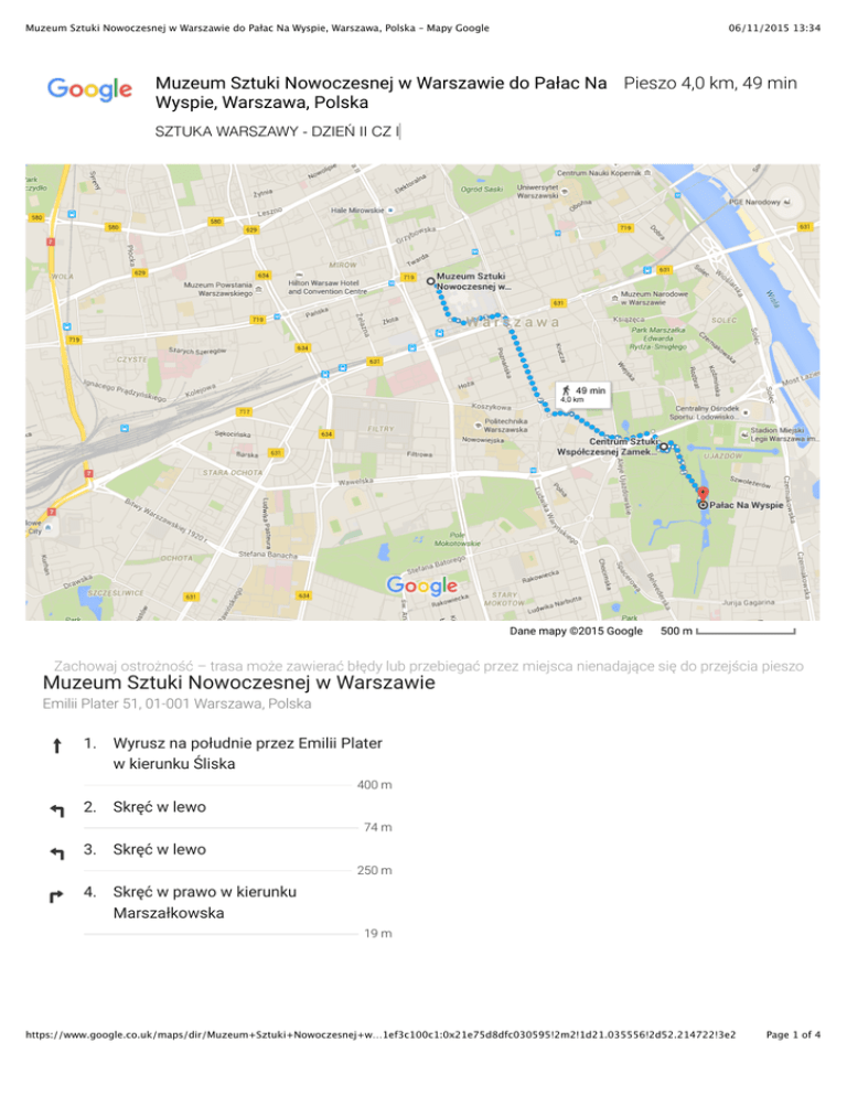 Muzeum Sztuki Nowoczesnej w Warszawie do Pałac Na Wyspie, Warszawa, Polska – Mapy Google 06/11/2015 13:34 Muzeum Sztuki Nowoczesnej w Warszawie do Pałac Na Pieszo 4,0 km, 49 min Wyspie, Warszawa, Polska SZTUKA WARSZAWY - DZIEŃ II CZ I Dane mapy ©2015 Google 500 m Zachowaj ostrożność – trasa może zawierać błędy lub przebiegać przez miejsca nienadające się do przejścia pieszo Muzeum Sztuki Nowoczesnej w Warszawie Emilii Plater 51, 01-001 Warszawa, Polska 1. Wyrusz na południe przez Emilii Plater w kierunku Śliska 400 m 2. Skręć w lewo 74 m 3. Skręć w lewo 250 m 4. Skręć w prawo w kierunku Marszałkowska 19 m https://www.google.co.uk/maps/dir/Muzeum+Sztuki+Nowoczesnej+w…1ef3c100c1:0x21e75d8dfc030595!2m2!1d21.035556!2d52.214722!3e2 Page 1 of 4 Muzeum Sztuki Nowoczesnej w Warszawie do Pałac Na Wyspie, Warszawa, Polska – Mapy Google 5. 06/11/2015 13:34 Skręć w lewo w kierunku Marszałkowska Skorzystaj ze schodów 140 m 6. Skorzystaj z przejścia podziemnego Skorzystaj ze schodów 140 m 7. Skręć w prawo w Marszałkowska 700 m 8. Skręć w lewo w kierunku Marszałkowska 31 m 9. Skręć w prawo w Marszałkowska 160 m 10. Skręć w lewo w kierunku Koszykowa 190 m 11. Kontynuuj wzdłuż Koszykowa 350 m 12. Skręć łagodnie w lewo w kierunku Jazdów 87 m 13. Skręć łagodnie w prawo w Aleje Ujazdowskie 29 m 14. Skręć łagodnie w lewo w kierunku Jazdów 290 m 15. Skręć w prawo w Jazdów 100 m 16. Skręć w lewo, pozostając na Jazdów 23 m 17. Skręć w prawo, pozostając na Jazdów Miejsce docelowe będzie po lewej stronie 43 m 38 min (3,0 km) Centrum Sztuki Współczesnej Zamek Ujazdowski Jazdów 2, 00-467 Warszawa, Polska 18. Wyrusz na południe przez Jazdów 27 m https://www.google.co.uk/maps/dir/Muzeum+Sztuki+Nowoczesnej+w…1ef3c100c1:0x21e75d8dfc030595!2m2!1d21.035556!2d52.214722!3e2 Page 2 of 4 Muzeum Sztuki Nowoczesnej w Warszawie do Pałac Na Wyspie, Warszawa, Polska – Mapy Google 19. 06/11/2015 13:34 Skręć w lewo w kierunku aleja Tomasza Hopfera 69 m 20. Skręć w lewo w kierunku aleja Tomasza Hopfera 43 m 21. Skręć w prawo w kierunku aleja Tomasza Hopfera 5m 22. Skręć w lewo w kierunku aleja Tomasza Hopfera Skorzystaj ze schodów 70 m 23. Skręć w lewo w kierunku aleja Tomasza Hopfera Skorzystaj ze schodów 44 m 24. Skręć w prawo w kierunku aleja Tomasza Hopfera 64 m 25. Skręć łagodnie w lewo w kierunku aleja Tomasza Hopfera 69 m 26. Skręć w lewo w kierunku aleja Tomasza Hopfera 37 m 27. Skręć w prawo w aleja Tomasza Hopfera 87 m 28. Skręć w lewo 23 m 29. Skręć w prawo 290 m 30. Skręć w lewo 55 m 31. Skręć w lewo Miejsce docelowe będzie po prawej stronie 29 m 12 min (900 m) Pałac Na Wyspie https://www.google.co.uk/maps/dir/Muzeum+Sztuki+Nowoczesnej+w…1ef3c100c1:0x21e75d8dfc030595!2m2!1d21.035556!2d52.214722!3e2 Page 3 of 4 Muzeum Sztuki Nowoczesnej w Warszawie do Pałac Na Wyspie, Warszawa, Polska – Mapy Google 06/11/2015 13:34 Te wskazówki służą tylko do planowania podróży. Faktyczna trasa może być inna ze względu na roboty drogowe, korki, warunki pogodowe lub inne zdarzenia – należy wziąć te czynniki pod uwagę. Należy przestrzegać wszystkich znaków i informacji podanych na trasie. https://www.google.co.uk/maps/dir/Muzeum+Sztuki+Nowoczesnej+w…1ef3c100c1:0x21e75d8dfc030595!2m2!1d21.035556!2d52.214722!3e2 Page 4 of 4