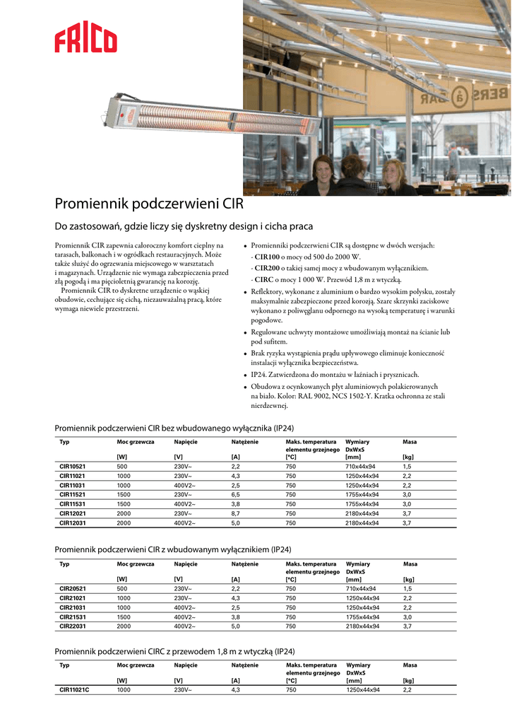 Promienniki Promiennik podczerwieni CIR Do zastosowań, gdzie liczy się dyskretny design i cicha praca Promiennik CIR zapewnia całoroczny komfort cieplny na tarasach, balkonach i w ogródkach restauracyjnych. Może także służyć do ogrzewania miejscowego w warsztatach i magazynach. Urządzenie nie wymaga zabezpieczenia przed złą pogodą i ma pięcioletnią gwarancję na korozję. Promiennik CIR to dyskretne urządzenie o wąskiej obudowie, cechujące się cichą, niezauważalną pracą, które wymaga niewiele przestrzeni. • Promienniki podczerwieni CIR są dostępne w dwóch wersjach: - CIR100 o mocy od 500 do 2000 W. - CIR200 o takiej samej mocy z wbudowanym wyłącznikiem. - CIRC o mocy 1 000 W. Przewód 1,8 m z wtyczką. • Reflektory, wykonane z aluminium o bardzo wysokim połysku, zostały maksymalnie zabezpieczone przed korozją. Szare skrzynki zaciskowe wykonano z poliwęglanu odpornego na wysoką temperaturę i warunki pogodowe. • Regulowane uchwyty montażowe umożliwiają montaż na ścianie lub pod sufitem. • Brak ryzyka wystąpienia prądu upływowego eliminuje konieczność instalacji wyłącznika bezpieczeństwa. • IP24. Zatwierdzona do montażu w łaźniach i prysznicach. • Obudowa z ocynkowanych płyt aluminiowych polakierowanych na biało. Kolor: RAL 9002, NCS 1502-Y. Kratka ochronna ze stali nierdzewnej. Promiennik podczerwieni CIR bez wbudowanego wyłącznika (IP24) Typ Moc grzewcza [W] [V] CIR10521 500 230V~ Napięcie Natężenie Masa [A] Maks. temperatura Wymiary elementu grzejnego DxWxS [°C] [mm] 2,2 750 1,5 710x44x94 [kg] CIR11021 1000 230V~ 4,3 750 1250x44x94 2,2 CIR11031 1000 400V2~ 2,5 750 1250x44x94 2,2 CIR11521 1500 230V~ 6,5 750 1755x44x94 3,0 CIR11531 1500 400V2~ 3,8 750 1755x44x94 3,0 CIR12021 2000 230V~ 8,7 750 2180x44x94 3,7 CIR12031 2000 400V2~ 5,0 750 2180x44x94 3,7 Wymiary DxWxS [mm] Masa 710x44x94 1,5 Promiennik podczerwieni CIR z wbudowanym wyłącznikiem (IP24) Typ Moc grzewcza [W] [V] [A] Maks. temperatura elementu grzejnego [°C] CIR20521 500 230V~ 2,2 750 Napięcie Natężenie [kg] CIR21021 1000 230V~ 4,3 750 1250x44x94 2,2 CIR21031 1000 400V2~ 2,5 750 1250x44x94 2,2 CIR21531 1500 400V2~ 3,8 750 1755x44x94 3,0 CIR22031 2000 400V2~ 5,0 750 2180x44x94 3,7 Wymiary DxWxS [mm] Masa 1250x44x94 2,2 Promiennik podczerwieni CIRC z przewodem 1,8 m z wtyczką (IP24) Typ Moc grzewcza [W] [V] [A] Maks. temperatura elementu grzejnego [°C] CIR11021C 1000 230V~ 4,3 750 Napięcie Natężenie [kg] Otwarta przestrzeń Wysokość montażu Minimalne odległości 150 2–2,5 m 2–2,5 m 150 300 700 1800 Materiał łatwopalny Wymiary A [mm] B*¹ [mm] BMIN*² [mm] CIR105/205 710 500 300 CIR110/210 1250 900 600 CIR115/215 1755 1200 800 CIR120/220 2180 1500 1000 * ) Zalecenie *2) Minimalne odległości między wspornikami 1 Montaż Przyłącze Promiennik CIR montuje się poziomo na suficie lub na ścianie za pomocą dostarczonych uchwytów montażowych. W celu uzyskania optymalnego komfortu, promiennik można nachylić. Do montażu pod kątem na suficie nie można użyć standardowych uchwytów, ponieważ odległość będzie mniejsza od odległości minimalnej. Promiennik CIR można także podwiesić na lince. Model CIR11021C jest wyposażony w przewód 1,8 m z wtyczką do podłączenia do uziemionego gniazda elektrycznego. Inne modele są przeznaczone tylko do montażu stacjonarnego. Promienniki mogą być łączone szeregowo. Akcesoria Typ Opis WxSxG [mm] CIRT Bezstopniowy regulator mocy 155x87x43 CBT Programator elektroniczny 155x87x43 ERP Regulator ogrzewania elektrycznego 157x93x40 Dodatkowe informacje i opcje zawiera sekcja „Sterowanie”. kW 4h 4h 2h 2h 1h 1/2 1h h CIRT CIRT 12 CBT CBT ERP