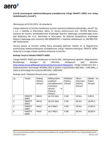 Cennik promocyjnej telekomunikacyjnej przedpłaconej Usługi PAKIETY AERO oraz Usług dodatkowych („Cennik”). Obowiązuje od 23.03.2015r. do odwołania. Usługi wskazane w Cenniku świadczone są przez operatora telekomunikacyjnego „Aero2” Sp. z o.o. z siedzibą w Warszawie, adres: Al. Stanów Zjednoczonych 61A 04-028 Warszawa, wpisaną do rejestru przedsiębiorców Krajowego Rejestru Sądowego prowadzonego przez Sąd Rejonowy dla m.st. Warszawy w Warszawie, XII Wydział Gospodarczy Krajowego Rejestru Sądowego pod numerem KRS 0000305767, o kapitale zakładowym 11 100 000 PLN, NIP 7010123529. Wyrazy pisane w Cenniku wielką literą posiadają definicje nadane im w Regulaminie promocyjnej telekomunikacyjnej przedpłaconej Usługi Telekomunikacyjnej PAKIETY AERO, chyba że co innego zostało wyraźnie wskazane w Cenniku. Rodzaje Taryf w Usłudze PAKIETY AERO Usługa PAKIETY AERO jest świadczona na Karcie SIM, udostępnianej zgodnie z Regulaminem Bezpłatnego Dostępu do Internetu dostępnym pod adresem http://www.aero2.pl/BezplatnyInternet/Zamow-karte/Regulamin. Usługa świadczona jest z wykorzystaniem technologii WCDMA (3G) w paśmie częstotliwości 900 MHz i 2100 MHz, a także w technologii 2G w paśmie 900 MHz i 1800 MHz Rodzaje taryf i Pakietów Danych wraz z opłatami Lp. Taryfa Rodzaj Pakietu Danych 1. PAKIETY AERO PAKIETY AERO PAKIETY AERO PAKIETY AERO 2. 3. 4. Wielkość Pakietu Danych Okres Ważności Pakietu Danych Opłata za Pakiet Danych Mini3 Maksymalna prędkość (przepływność) transmisji danych w Pakiecie Danych do 512 kb/s 3 GB 30 dni 5,00 zł Mini5 do 512 kb/s 5 GB 60 dni 10,00 zł Max3 do 3 Mb/s 3 GB 30 dni 15,00 zł Max5 do 3 Mb/s 5 GB 60 dni 20,00 zł Cennik promocyjnej telekomunikacyjnej przedpłaconej Usługi PAKIETY AERO oraz Usług dodatkowych20150323.docx Strona 1/2 Opłaty za usługi dodatkowe: Nazwa usługi dodatkowej Opłata Opłata za E-Fakturę udostępnianą na e-koncie Abonenta po 0 zł uiszczeniu (zaksięgowaniu) opłaty za Pakiet Danych Papierowa Faktura aktywowana na zamówienie Abonenta 200,00 zł (jednorazowa opłata aktywacyjna) Opłata za wydanie duplikatu lub wymianę Karty SIM* 35,00 zł *Wymiana karty SIM uwzględnia koszty wysyłki. Wydanie nowej karty SIM następuje na koszt Abonenta, jeśli powód wymiany nie wynika ze strony Operatora. Opłata nie jest pobierana w przypadku uzyskania duplikatu Karty SIM zgodnie z Regulaminem Bezpłatnego Dostępu do Internetu dostępnym pod adresem http://www.aero2.pl/BezplatnyInternet/Zamowkarte/Regulamin. Operator świadczy Usługę PAKIETY AERO w oparciu o standardowe Karty SIM z możliwością wyłamania do formatu microSIM. Informacje dodatkowe Zarządzanie przez Abonenta swoimi usługami (m.in. sprawdzenie stanu Pakietu Danych, zakup Pakietu Danych, pobranie E-faktury) możliwe jest poprzez wybór odpowiedniej opcji po zalogowaniu przez stronę internetową do własnego konta w Elektronicznym Biurze Obsługi Klienta [E-BOK] na stronie http://moje.aero2.pl Zużycie Pakietu Danych, rozliczane jest za faktyczne zużycie danych z dokładnością do 1 bajta. Widoczny w Elektronicznym Biurze Obsługi Klienta [E-BOK] stan zużycia Pakietu Danych, nie uwzględnia danych zużytych przez ostatnie 30 minut korzystania z Usług PAKIETY AERO. Podawana wartość zużycia jest zaokrąglana w górę do 1 MB (megabajt). Wszystkie opłaty podane w Cenniku zawierają podatek VAT. Cennik promocyjnej telekomunikacyjnej przedpłaconej Usługi PAKIETY AERO oraz Usług dodatkowych20150323.docx Strona 2/2