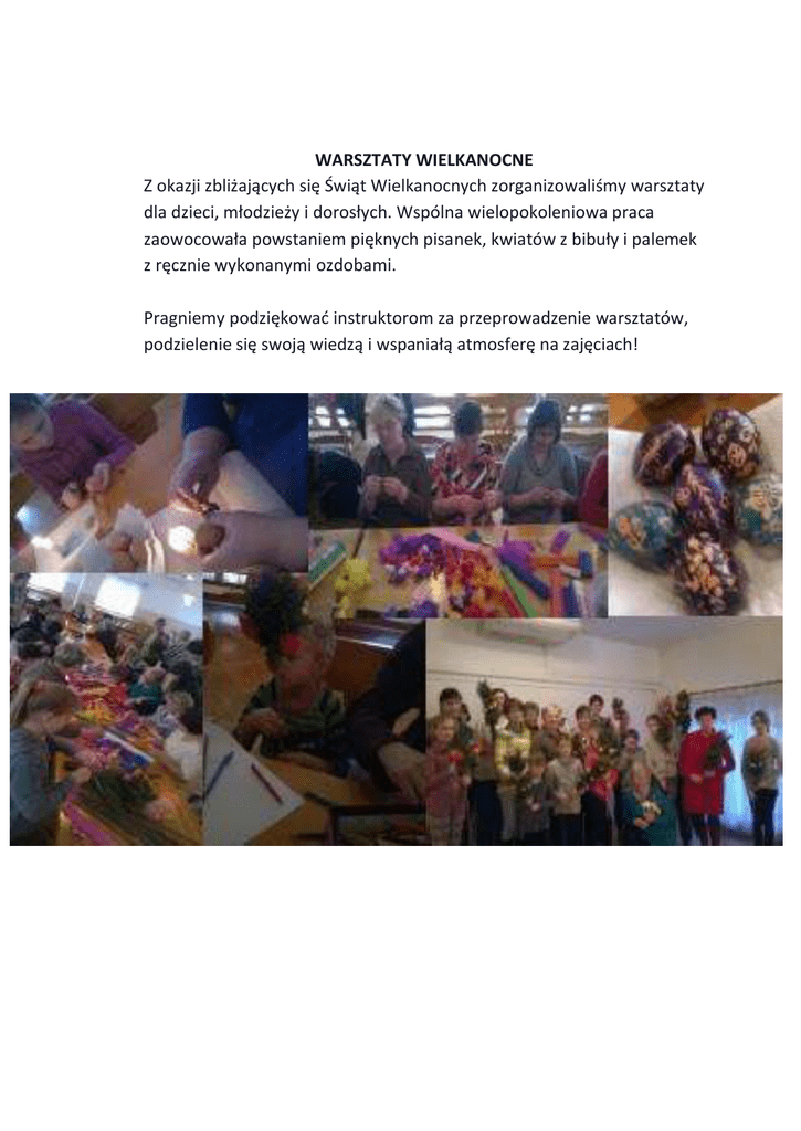 WARSZTATY WIELKANOCNE Z okazji zbliżających się Świąt Wielkanocnych zorganizowaliśmy warsztaty dla dzieci, młodzieży i dorosłych. Wspólna wielopokoleniowa praca zaowocowała powstaniem pięknych pisanek, kwiatów z bibuły i palemek z ręcznie wykonanymi ozdobami. Pragniemy podziękować instruktorom za przeprowadzenie warsztatów, podzielenie się swoją wiedzą i wspaniałą atmosferę na zajęciach!