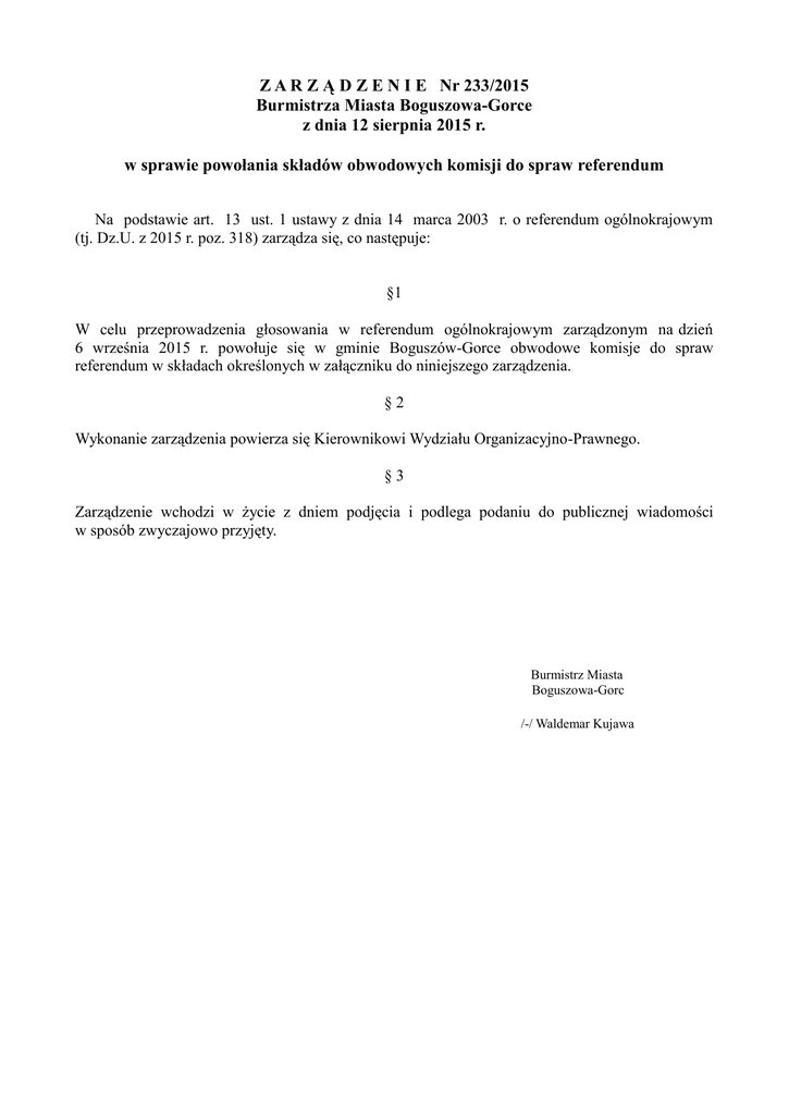 ZARZ Ą DZENIE Nr 233/2015 Burmistrza Miasta Boguszowa
