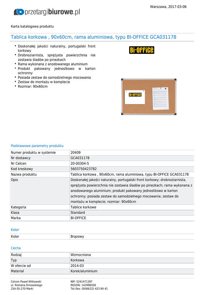 Warszawa, 2017-03-06 Karta katalogowa produktu Tablica korkowa , 90x60cm, rama aluminiowa, typu BI-OFFICE GCA031178 Doskonałej jakości naturalny, portugalski front korkowy Drobnoziarnista, sprężysta powierzchnia nie zostawia śladów po pinezkach Rama wykonana z anodowanego aluminium Produkt pakowany jednostkowo w karton ochronny Posiada zestaw do samodzielnego mocowania Zestaw do montażu w komplecie Rozmiar: 90x60cm Podstawowe parametry produktu Numer produktu w systemie 20409 Nr dostawcy GCA031178 Nr Celcen 20-00304-5 Kod kreskowy 5603750423782 Nazwa produktu Tablica korkowa , 90x60cm, rama aluminiowa, typu BI-OFFICE GCA031178 Opis Doskonałej jakości naturalny, portugalski front korkowy; drobnoziarnista, sprężysta powierzchnia nie zostawia śladów po pinezkach; rama wykonana z anodowanego aluminium; produkt pakowany jednostkowo w karton ochronny; posiada zestaw do samodzielnego mocowania; zestaw do montażu w komplecie; rozmiar: 90x60cm Kategoria Tablice korkowe Klasa Standard Marka BI-OFFICE Kolor Kolor Brązowy Cecha Rodzaj Wzmocniona Typ Korkowa W ofercie od 2014-03 Materiał Korek/aluminium Celcen Paweł Witkowski ul. Romana Dmowskiego 25A 05-270 Marki NIP: 5241471287 REGON: 142996558 Tel./fax: (0048/22) 423 84 41 Warszawa, 2017-03-06 Karta katalogowa produktu cd. Tablica korkowa , 90x60cm, rama aluminiowa, typu BI-OFFICE GCA031178 Produkt Tablica Wymiary Wymiary (mm) 900x600 Certyfikaty Hit Hit Nowy produkt w ofercie Standard Wspólny słownik zamówień CPV 30192170-3 Tablice ogłoszeń Zamiennik Zamiennik GCA031170 Jesteśmy przekonani, że z pomocą przetargibiurowe.pl usprawnicie Państwo własne procesy biznesowe związane ze żmudnym poszukiwaniem odpowiadających Państwu produktów oraz opracowaniem specyfikacjii zapytań ofertowych. Serdecznie zapraszamy do wspópracy Zespół, PrzetargiBiurowe.pl Celcen Paweł Witkowski ul. Romana Dmowskiego 25A 05-270 Marki NIP: 5241471287 REGON: 142996558 Tel./fax: (0048/22) 423 84 41