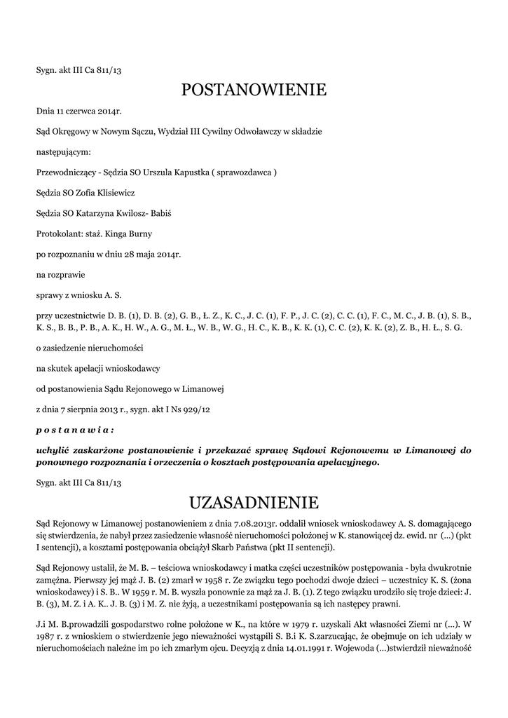 Sygn. akt III Ca 811/13 POSTANOWIENIE Dnia 11 czerwca 2014r. Sąd Okręgowy w Nowym Sączu, Wydział III Cywilny Odwoławczy w składzie następującym: Przewodniczący - Sędzia SO Urszula Kapustka ( sprawozdawca ) Sędzia SO Zofia Klisiewicz Sędzia SO Katarzyna Kwilosz- Babiś Protokolant: staż. Kinga Burny po rozpoznaniu w dniu 28 maja 2014r. na rozprawie sprawy z wniosku A. S. przy uczestnictwie D. B. (1), D. B. (2), G. B., Ł. Z., K. C., J. C. (1), F. P., J. C. (2), C. C. (1), F. C., M. C., J. B. (1), S. B., K. S., B. B., P. B., A. K., H. W., A. G., M. Ł., W. B., W. G., H. C., K. B., K. K. (1), C. C. (2), K. K. (2), Z. B., H. Ł., S. G. o zasiedzenie nieruchomości na skutek apelacji wnioskodawcy od postanowienia Sądu Rejonowego w Limanowej z dnia 7 sierpnia 2013 r., sygn. akt I Ns 929/12 postanawia: uchylić zaskarżone postanowienie i przekazać sprawę Sądowi Rejonowemu w Limanowej do ponownego rozpoznania i orzeczenia o kosztach postępowania apelacyjnego. Sygn. akt III Ca 811/13 UZASADNIENIE Sąd Rejonowy w Limanowej postanowieniem z dnia 7.08.2013r. oddalił wniosek wnioskodawcy A. S. domagającego się stwierdzenia, że nabył przez zasiedzenie własność nieruchomości położonej w K. stanowiącej dz. ewid. nr (...) (pkt I sentencji), a kosztami postępowania obciążył Skarb Państwa (pkt II sentencji). Sąd Rejonowy ustalił, że M. B. – teściowa wnioskodawcy i matka części uczestników postępowania - była dwukrotnie zamężna. Pierwszy jej mąż J. B. (2) zmarł w 1958 r. Ze związku tego pochodzi dwoje dzieci – uczestnicy K. S. (żona wnioskodawcy) i S. B.. W 1959 r. M. B. wyszła ponownie za mąż za J. B. (1). Z tego związku urodziło się troje dzieci: J. B. (3), M. Z. i A. K.. J. B. (3) i M. Z. nie żyją, a uczestnikami postępowania są ich następcy prawni. J.i M. B.prowadzili gospodarstwo rolne położone w K., na które w 1979 r. uzyskali Akt własności Ziemi nr (...). W 1987 r. z wnioskiem o stwierdzenie jego nieważności wystąpili S. B.i K. S.zarzucając, że obejmuje on ich udziały w nieruchomościach należne im po ich zmarłym ojcu. Decyzją z dnia 14.01.1991 r. Wojewoda (...)stwierdził nieważność wymienionego Aktu Własności Ziemi nakazując Urzędowi Miasta i Gminy w M.przekazanie sprawy do rozpoznania Sądowi Rejonowemu w Limanowej. Sprawa ta nie zakończyła się orzeczeniem Sądu. W latach 70 – tych ubiegłego wieku M. i J. B. (1) rozpoczęli na dz. ewid. nr (...) budowę domu. Po zakończeniu budowy domu przeprowadzili się do niego wraz z dziećmi. Dzieci usamodzielniając się stopniowo opuszczały dom rodzinny. J. B. (1) zmarł w 1994 r. We wskazanym domu pozostała M. B. z synem J. i jego rodziną. J. B. (3) zmarł w 2000 r. Od tego czasu w domu wzniesionym przez M. i J. B. (1) zamieszkuje M. B. oraz żona zmarłego J. D. B. wraz z dziećmi. K. S. wyszła za mąż w 1980 r. za A. S.. Początkowo mieszkali oni w hotelu robotniczym w N., ale następnie przeprowadzili się do domu rodzinnego K. S.. W połowie lat 80 – tych ubiegłego wieku zaczęli tuż obok domu rodzinnego, na dz. ewid. nr (...), budowę domu. Do domu tego wprowadzili się w 1988 r. i mieszkają w nim do chwili obecnej. Ponieważ na skutek uchylenia AWZ nr (...) własność gospodarstwa była nieuregulowana, w kwietniu 2010 r. S. B.wniósł do Sądu wniosek o stwierdzenie, że on, siostra K. S., matka M. B.i ojczym J. B. (1)nabyli w trybie ustawy z dnia 26.10.1971 r. o uregulowaniu własności gospodarstw rolnych własność poszczególnych działek wchodzących w skład gospodarstwa rolnego. Działka ewid. nr (...)miała według wniosku przypaść na rzecz K. S.. W trakcie tego postępowania wnioskodawca zmienił żądanie wniosku domagając się stwierdzenia, że własność wszystkich działek objętych wnioskiem nabyła przez zasiedzenie z dniem 1.01.2001 r. M. B.. Postanowieniem z dnia 4.11.2011 r., sygn. akt I Ns 320/10, Sąd Rejonowy w Limanowej stwierdził, że M. B.nabyła z dniem 1.01.2001 r. przez zasiedzenie własność działek objętych wnioskiem, za wyjątkiem dz. ewid. nr (...), w stosunku do której wniosek oddalił. Po zakończeniu postępowania o zasiedzenie stan faktyczny sprawy nie uległ zmianie. Działki rolne nadal pozostają nieużywane. Na dz. ewid. nr (...) stoją dwa domy – w jednym z nich mieszka M. B. z synową i dziećmi zmarłego syna, a w drugim wnioskodawca z żoną. Sąd Rejonowy uznał, iż wnioskodawca nie wykazał, że pozostawał w okresie czasu niezbędnym do nabycia własności nieruchomości przez zasiedzenie samoistnym posiadaczem przedmiotu wniosku. Podniósł, że wnioskodawca pomija fakt, iż na działce objętej wnioskiem położony jest budynek wzniesiony przez jego teściową, w którym ta do chwili obecnej mieszka wraz z członkami swojej rodziny. Sąd wskazał też, że w sprawie I Ns 320/10 nikt nie kwestionował, że za właściciela całego gospodarstwa przez szereg lat była uważana M. B. i wynikiem tego była zmiana żądania wniosku. Sąd Rejonowy podał, że oddalenie wniosku w sprawie I Ns 320/10 odnośnie dz. ewid. nr (...) było spowodowane wyłącznie charakterem tej działki, a mianowicie faktem iż stoją na niej dwa domy wzniesione przez różne rodziny oraz brakiem dowodów wystarczających do stwierdzenia, że konkretna osoba (bądź osoby) była samoistnym posiadaczem tej działki. Sąd I instancji uznał, że wystarczających dowodów w celu wyjaśnienia tej kwestii nie zebrano także w niniejszym postepowaniu. Sąd Rejonowy wskazywał na niekonsekwentne stanowisko samego wnioskodawcy, który domagał się zasiedzenia całej działki nr (...), a jednocześnie twierdził, czuł się współwłaścicielem tej działki, że teściową w pewnym sensie uważał za właściciela, że przekazywał jej pieniądze na podatek należny od tej nieruchomości. W konsekwencji wobec braku przesłanek z art. 172 k.c. i art. 336 k.c. do stwierdzenia nabycia przez wnioskodawcę w drodze zasiedzenia 