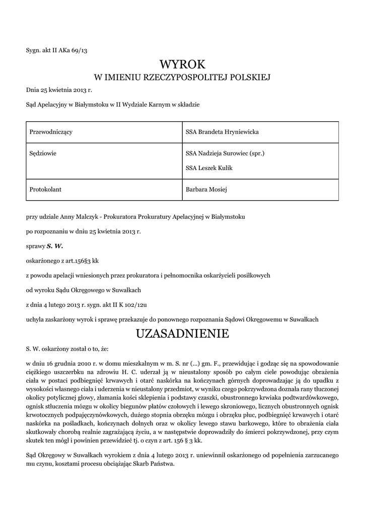 Sygn. akt II AKa 69/13 WYROK W IMIENIU RZECZYPOSPOLITEJ POLSKIEJ Dnia 25 kwietnia 2013 r. Sąd Apelacyjny w Białymstoku w II Wydziale Karnym w składzie Przewodniczący SSA Brandeta Hryniewicka Sędziowie SSA Nadzieja Surowiec (spr.) SSA Leszek Kulik Protokolant Barbara Mosiej przy udziale Anny Malczyk - Prokuratora Prokuratury Apelacyjnej w Białymstoku po rozpoznaniu w dniu 25 kwietnia 2013 r. sprawy S. W. oskarżonego z art.156§3 kk z powodu apelacji wniesionych przez prokuratora i pełnomocnika oskarżycieli posiłkowych od wyroku Sądu Okręgowego w Suwałkach z dnia 4 lutego 2013 r. sygn. akt II K 102/12u uchyla zaskarżony wyrok i sprawę przekazuje do ponownego rozpoznania Sądowi Okręgowemu w Suwałkach UZASADNIENIE S. W. oskarżony został o to, że: w dniu 16 grudnia 2010 r. w domu mieszkalnym w m. S. nr (...) gm. F., przewidując i godząc się na spowodowanie ciężkiego uszczerbku na zdrowiu H. C. uderzał ją w nieustalony sposób po całym ciele powodując obrażenia ciała w postaci podbiegnięć krwawych i otarć naskórka na kończynach górnych doprowadzając ją do upadku z wysokości własnego ciała i uderzenia w nieustalony przedmiot, w wyniku czego pokrzywdzona doznała rany tłuczonej okolicy potylicznej głowy, złamania kości sklepienia i podstawy czaszki, obustronnego krwiaka podtwardówkowego, ognisk stłuczenia mózgu w okolicy biegunów płatów czołowych i lewego skroniowego, licznych obustronnych ognisk krwotocznych podpajęczynówkowych, dużego stopnia obrzęku mózgu i obrzęku płuc, podbiegnięć krwawych i otarć naskórka na pośladkach, kończynach dolnych oraz w okolicy lewego stawu barkowego, które to obrażenia ciała skutkowały chorobą realnie zagrażającą życiu, a w następstwie doprowadziły do śmierci pokrzywdzonej, przy czym skutek ten mógł i powinien przewidzieć tj. o czyn z art. 156 § 3 kk. Sąd Okręgowy w Suwałkach wyrokiem z dnia 4 lutego 2013 r. uniewinnił oskarżonego od popełnienia zarzucanego mu czynu, kosztami procesu obciążając Skarb Państwa. Apelację od powyższego wyroku wywiódł prokurator i pełnomocnik oskarżycieli posiłkowych. Prokurator zaskarżając wyrok w całości na niekorzyść oskarżonego w oparciu o art. 427§2kpk i 438 pkt 2i 3kpk wyrokowi zarzucił: błąd w ustaleniach faktycznych przyjętych za podstawę orzeczenia połączony z rażącą obrazą art. kpk, art. 424§1 pkt 1kpk, wynikający z pobieżnej, niepełnej i nietrafnej oceny materiału dowodowego, a w szczególności: - zeznań świadków H. B., L. D., M. O., D. B., K. B. i T. O. jednoznacznie wykluczających wiarygodność całości wyjaśnień oskarżonego, które to dowody w połączeniu z oględzinami zwłok, miejsca ich ujawnienia oraz opiniami biegłych z zakresu medycyny ustalających, że pokrzywdzona miała na kończynach obrażenia charakterystyczne dla obrony, opinii biegłych z zakresu badania śladów biologicznych wskazują, że oskarżony świadomie usuwał ślady powstałe na skutek uszkodzenia ciała pokrzywdzonej oraz kreował fakty mające na celu wykluczenie go z kręgu osób podejrzanych, - całkowitym zanegowaniu zeznań świadka technika policji T. O., który stwierdził, że pokrzywdzona posiadała makijaż zrobiony nie swoją ręką mający zamaskować powstający u niej wylew pod oczodołami oraz w zbieżności z nimi zeznaniami M. O., która jednoznacznie zeznała, że matka nie malowała sobie powiek, - braku poczynienia ustaleń odnośnie mechanizmu powstania, rozwoju, zmiany zabarwienia i nasycenia krwiaka w okolicy oczodołu pokrzywdzonej, - spekulacji odnośnie możliwości posprzątania przez pokrzywdzoną mieszkania, wyniesienia w nieznane miejsce pościeli i przedmiotów tamujących krwawienie, w sytuacji, gdy pokrzywdzona doznała kilkunastocentymetrowego złamania kości czaszki, otwartej rany głowy i towarzyszący temu oczywisty ból i krwawienie wykluczały podjęcie tego typu działań zwłaszcza, że pokrzywdzona nawet nie założyła sobie opatrunku na głowę i nigdzie nie znaleziono śladów przedmiotów służących do zrobienia jakichkolwiek opatrunków, który starałaby się sobie zrobić gdyby miała zdolności psychofizyczne w tym zakresie, - bezpodstawnym, w pełni sprzecznym ze zgromadzonym materiałem dowodowym uznaniem, że oskarżony S. W. zawsze był człowiekiem spokojnym i nigdy nie reagował agresją pomimo, że zeznania świadków M. A., H. B. i M. O. opisującej swoją rozmowę z żoną oskarżonego są jednoznacznie przeciwne ustaleniu w tym zakresie poczynionemu przez sąd, wynikającemu z zeznań osób, które widziały oskarżonego jeden raz przez bardzo krótki okres czasu lub z uwagi na uwarunkowania środowiskowe i znajomość z oskarżonym ewidentnie uchylały się od złożenia zeznań, które to dowody tworząc zamknięty krąg poszlak jednoznacznie wskazujących na sprawstwo oskarżonego, ocenione prawidłowo przez pryzmat art. 7kpk, tj. zasad prawidłowego rozumowania oraz wskazań wiedzy i doświadczenia życiowego każą zająć odmienne stanowisko co do winy oskarżonego i wykluczyć wersję przyjętą przez sąd, że oskarżony jedynie nie udzielił pomocy kobiecie, która sama się przewróciła i doznała obrażeń czaszki skutkujących jej zgonem. Na zasadzie art. 427§1 i 2kpk i art. 437kpk wniósł o uchylenie zaskarżonego wyroku w całości i przekazanie sprawy do ponownego rozpoznania Sądowi Okręgowemu w Suwałkach. Pełnomocnik oskarżycieli posiłkowych zaskarżył wyrok w całości i na podstawie art. 427§1 i 2kpk i 438 pkt 2 i 3kpk zaskarżonemu wyrokowi zarzucił: - naruszenie przepisów postępowania, tj. art. 398kpk, poprzez nie przyjęcie do rozpoznania w sprawie zarzutu z art. 162§1k.k., pomimo jego wniesienia przez prokuratora, - błąd w ustaleniach faktycznych, przyjętych za podstawę rozstrzygnięcia, mający wpływ na treść orzeczenia, a polegający na przyjęciu, że pomimo poważnych obrażeń ciała stwierdzonych u 