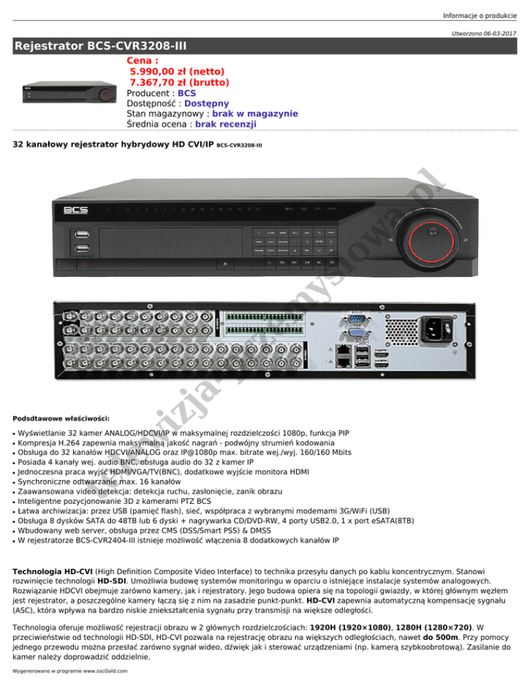 Informacje o produkcie Utworzono 06-03-2017 Rejestrator BCS-CVR3208-III Cena : 5.990,00 zł (netto) 7.367,70 zł (brutto) Producent : BCS Dostępność : Dostępny Stan magazynowy : brak w magazynie Średnia ocena : brak recenzji BCS-CVR3208-III Podsdtawowe właściwości: ● ● ● ● ● ● ● ● ● ● Wyświetlanie 32 kamer ANALOG/HDCVI/IP w maksymalnej rozdzielczości 1080p, funkcja PIP Kompresja H.264 zapewnia maksymalną jakość nagrań - podwójny strumień kodowania Obsługa do 32 kanałów HDCVI/ANALOG oraz IP@1080p max. bitrate wej./wyj. 160/160 Mbits Posiada 4 kanały wej. audio BNC, obsługa audio do 32 z kamer IP Jednoczesna praca wyjść HDMI/VGA/TV(BNC), dodatkowe wyjście monitora HDMI Synchroniczne odtwarzanie max. 16 kanałów Zaawansowana video detekcja: detekcja ruchu, zasłonięcie, zanik obrazu Inteligentne pozycjonowanie 3D z kamerami PTZ BCS Łatwa archiwizacja: przez USB (pamięć flash), sieć, współpraca z wybranymi modemami 3G/WiFi (USB) Obsługa 8 dysków SATA do 48TB lub 6 dyski + nagrywarka CD/DVD-RW, 4 porty USB2.0, 1 x port eSATA(8TB) Wbudowany web server, obsługa przez CMS (DSS/Smart PSS) & DMSS W rejestratorze BCS-CVR2404-III istnieje możliwość włączenia 8 dodatkowych kanałów IP le ● te ● w iz ja -p r ze m ys lo w a. pl 32 kanałowy rejestrator hybrydowy HD CVI/IP Technologia HD-CVI (High Definition Composite Video Interface) to technika przesyłu danych po kablu koncentrycznym. Stanowi rozwinięcie technologii HD-SDI. Umożliwia budowę systemów monitoringu w oparciu o istniejące instalacje systemów analogowych. Rozwiązanie HDCVI obejmuje zarówno kamery, jak i rejestratory. Jego budowa opiera się na topologii gwiazdy, w której głównym węzłem jest rejestrator, a poszczególne kamery łączą się z nim na zasadzie punkt-punkt. HD-CVI zapewnia automatyczną kompensację sygnału (ASC), która wpływa na bardzo niskie zniekształcenia sygnału przy transmisji na większe odległości. Technologia oferuje możliwość rejestracji obrazu w 2 głównych rozdzielczościach: 1920H (1920×1080), 1280H (1280×720). W przeciwieństwie od technologii HD-SDI, HD-CVI pozwala na rejestrację obrazu na większych odległościach, nawet do 500m. Przy pomocy jednego przewodu można przesłać zarówno sygnał wideo, dźwięk jak i sterować urządzeniami (np. kamerą szybkoobrotową). Zasilanie do kamer należy doprowadzić oddzielnie. Wygenerowano w programie www.oscGold.com -p r ze m ys lo w a. pl Rys.3 Technologia HD-CVI. Specyfikacja techniczna System System operacyjny Funkcjonalność systemu Kontrola systemu Wideo / Wyświetlanie Standard Wideo Ilość wejść wideo HDCVI,IP Wyjścia monitorowe Rozdzielczości wyświetlania Podział na wyjściach Sekwencja obrazu le Maski prywatności OSD Audio te Wejście Wyjście Dwukierunkowa komunikacja Nagrywanie Kompresja Video/Audio w iz ja Procesor Rozdzielczość nagrywania BCS-CVR2408-III/3208-III Wbudowany wysoko wydajny procesor LINUX Funkcja Pentaplex: Obraz na żywo, Nagrywanie, Odtwarzanie, Archiwizacja i Zdalny dostęp Panel, Mysz, Klawiatura, Sieć PAL 24/32 2 HDMI, 1 VGA, 1 TV/BNC(75Ω) 1920×1080, 1280 ×1024, 1280×720, 1024×768 1/4/8/9/16/25/36 w zależności od wersji kanałowej Tak 4 definiowalne strefy prywatności na kanał Nazwa kamery, Czas, Zanik sygnału, Blokada kamery, Detekcja ruchu, Nagrywanie 4 kanały wej. audio BNC(200-2000mV10KΩ), obsługa audio do 24/32 z kamer IP 1 kanał wyj. audio BNC(200-3000mV, 5KΩ), HDMI Interkom 1 wej./wyj. audio H.264 / G.711 Główny Strumień: ANALOG 960H 25kl/s / Kamery HDCVI :1080P(1~12kl/s) 960H/D1/HD1/2CIF/CIF(1~25kl/s) kanały(1,9,17,25)-CVR3208 kanały (1,9,17)-cvr2408 (1~25kl/s) / Kamery IP : @1080p Extra Strumień: Kamery analogowe : 25kl/s@CIF/QCIF Kamery IP : 25kl/s@D1/CIF/QCIF Zajętość pasma 48~4096Kb/s na kanał, Max. sumaryczny biterate wej./wyj. 160/160 Mbits Tryb nagrywania Manualny, Terminarz (Ciągłe; MD - Detekcja video, w tym : detekcja ruchu, zakrycie kamery, zanik sygnału), Stop Priorytet nagrywania Manualne >Detekcja ruchu>Ciągłe Interwał nagrań 1~60 min. (domyślnie: 60 min.), Pre-nagrywanie: 1~30 sek.(HDCVI), 1~5 sek.(IP), Post-nagrywanie: 10~300 sek. Wideo detekcja i Alarm Wyzwalanie zdarzeń Nagrywanie, PTZ, Trasa, E-mail, FTP, Buzzer i komunikat na ekranie Detekcja ruchu Strefy: 396 (22x18) Zanik sygnału, zakrycie kamery tak Wejścia/Wyjścia alarmowe 16 wejść / 6 wyjścia Odtwarzanie i Archiwizacja Odtwarzanie nagrań 1/4/8/16 Tryb wyszukiwania Czas/Data, Detekcja Ruchu i Zaawansowane wyszukiwanie (co do sekundy) Funkcje odtwarzania Play, Pauza, Stop, Do Tyłu, Szybki play, Wolny play, Następny plik, Poprzedni plik, Następna kamera, Poprzednia kamera, Pełny ekran, Powtórzenie, Pętla, Archiwizacja, Cyfrowe powiększenie Archiwizacja danych Pendrive / USB HDD / USB CD / Sieć / Wew. CD/DVD-RW Sieć Interfejs 2xPort RJ-45 (10/100M/1000M) Obsługiwane protokoły HTTP, TCP/IP, IPv4/IPv6, UPNP, RTSP, UDP, SMTP, NTP, DHCP, DNS, IP Filtr, PPPOE, DDNS, FTP Zdalne sterowanie Monitor, PTZ , Odtwarzanie, Ustawienia, Ściąganie plików, Przeglądanie logów Dysk Dysk Twardy 8 x SATA, 8 x HHD max. 48TB lub 6 x HDD + nagrywarka CD/DVD-RW, możliwość podłączenia 4 HDD(po 2TB) przez port eSATA Zarzadzanie dysku Monitorowanie dysku, SMART, Powielanie Dodatkowe interfejsy USB 4 porty Informacje o produkcie RS485 PTZ RS232 1 port eSATA 1 port Pozostałe Zasilanie AC100-240V / 50/60Hz Pobór prądu 40W bez HDD Warunki środowiskowe -10°C ~+55°C / 10~90%RH / 86~106kpa Wymiary 2U, 440mm×460mm×89mm(W×D×H) Waga 6kg bez HDD Korzyści z zastosowania technologii HD-CVI: ● ● ● ● ze m ys lo w a. ● Łatwość tworzenia systemów wizyjnych oraz ich rozbudowa. Wysoka jakość obrazu (720p, 1080p). Modulacja analogowa - wolny od przesłuchów i nieskompresowany sygnał. Automatyczna kompensacja i długi zasięg transmisji. Transmisja odbywać się może na dużym dystansie (na odległości do 500m z