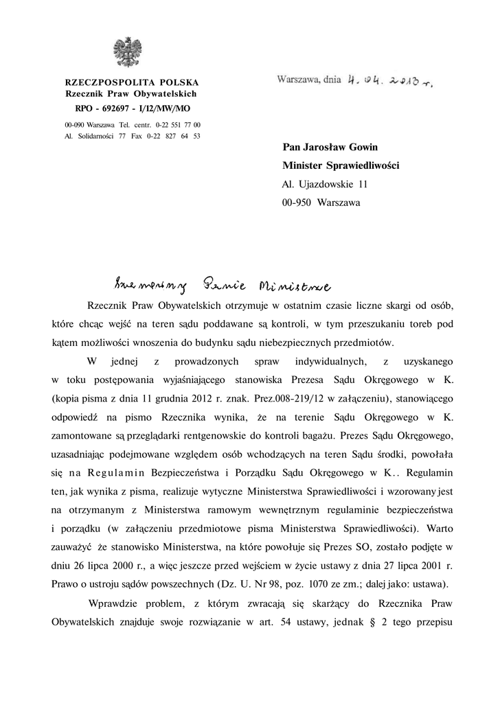 RZECZPOSPOLITA POLSKA Rzecznik Praw Obywatelskich RPO - 692697 - I/12/MW/MO 00-090 Warszawa Tel. centr. 0-22 551 77 00 Al. Solidarności 77 Fax 0-22 827 64 53 Pan Jarosław Gowin Minister Sprawiedliwości Al. Ujazdowskie 11 00-950 Warszawa Rzecznik Praw Obywatelskich otrzymuje w ostatnim czasie liczne skargi od osób, które chcąc wejść na teren sądu poddawane są kontroli, w tym przeszukaniu toreb pod kątem możliwości wnoszenia do budynku sądu niebezpiecznych przedmiotów. W jednej z prowadzonych w toku postępowania wyjaśniającego spraw indywidualnych, stanowiska Prezesa z uzyskanego Sądu Okręgowego w K. (kopia pisma z dnia 11 grudnia 2012 r. znak. Prez.008-219/12 w załączeniu), stanowiącego odpowiedź na pismo Rzecznika wynika, że na terenie Sądu Okręgowego w K. zamontowane są przeglądarki rentgenowskie do kontroli bagażu. Prezes Sądu Okręgowego, uzasadniając podejmowane względem osób wchodzących na teren Sądu środki, powołała się n a R e g u l a m i n Bezpieczeństwa i Porządku Sądu Okręgowego w K . . Regulamin ten, jak wynika z pisma, realizuje wytyczne Ministerstwa Sprawiedliwości i wzorowany jest na otrzymanym z Ministerstwa ramowym wewnętrznym regulaminie bezpieczeństwa i porządku (w załączeniu przedmiotowe pisma Ministerstwa Sprawiedliwości). Warto zauważyć że stanowisko Ministerstwa, na które powołuje się Prezes SO, zostało podjęte w dniu 26 lipca 2000 r., a więc jeszcze przed wejściem w życie ustawy z dnia 27 lipca 2001 r. Prawo o ustroju sądów powszechnych (Dz. U. Nr 98, poz. 1070 ze zm.; dalej jako: ustawa). Wprawdzie problem, z którym zwracają się skarżący do Rzecznika Praw Obywatelskich znajduje swoje rozwiązanie w art. 54 ustawy, jednak § 2 tego przepisu 2 stanowi, że prezes sądu może zarządzić stosowanie środków zapewniających bezpieczeństwo w budynkach sądowych oraz zapobiegających naruszaniu zakazu, o którym mowa w § 1. W takim przypadku do ochrony budynków sądowych oraz osób w nich przebywających stosuje się przepisy o ochronie osób i mienia. Z tej regulacji wynika więc, że nie zarządzenie prezesa (regulamin) jest źródłem dla możliwości w zastosowania K., lecz środków powołane bezpieczeństwa, wyżej przepisy, o których wprowadzające pisze Prezes SO zakaz wnoszenia określonych przedmiotów do budynku sądu. Do prezesa sądu należy jednak decyzja o adekwatności stosowanych środków mających ten cel realizować. Należy jednak zauważyć, że przepisy ustawy z dnia 22 sierpnia 1997 r. o ochronie osób i mienia (t.j. Dz. U. z 2005 r., Nr 145, poz. 1221 ze zm.), do której odsyła powołany wyżej przepis Prawa o ustroju sądów powszechnych, nie przewidują wprost możliwości przeprowadzania kontroli osobistej ani też przeszukania rzeczy celem zweryfikowania, czy wchodząca na teren sądu osoba może wnosić niebezpieczne przedmioty. Rzecznikowi znane jest stanowisko doktryny dotyczące przepisu art. 54 Prawa o ustroju sądów powszechnych, z którego wynika, że „(...) celem zapobieżenia naruszaniu zakazu określonego w § 1 art. 54 p.u.s.p. oraz zapewnienia bezpieczeństwa w budynkach sądowych, prezes sądu może zarządzić - na stałe lub czasowo - stosowanie odpowiednich środków technicznych i ochronnych. Ochrona osób i mienia może być realizowana w formie bezpośredniej ochrony fizycznej (stałej lub doraźnej), polegającej na dozorze sygnałów przesyłanych, gromadzonych i przetwarzanych w elektronicznych urządzeniach i systemach alarmowych, albo w formie zabezpieczenia technicznego, polegającego na montażu elektronicznych urządzeń i systemów alarmowych, sygnalizujących zagrożenie chronionych osób i mienia (tzw. bramki bezpieczeństwa, kamery telewizyjne, czujniki). Nie jest wykluczona budowa specjalnych zabezpieczeń, kabin, klatek, ścianek, krat itp. (por. też ustawę z 2 sierpnia 1997 r. o ochronie osób i mienia, tekst jedn. Dz. U. z 2005 r. Nr 145, poz. 1221)" (tak: T. Ereciński, J. Gudowski, J. Iwulski, Komentarz do prawa o ustroju sądów powszechnych i ustawy o Krajowej Radzie Sądownictwa, Warszawa 2009 Wydawnictwo Prawnicze LexisNexis (wydanie II), wydanie elektroniczne, uwaga nr 3 do art. 54). 3 Wątpliwości Rzecznika budzi jednak fakt, że wprawdzie autorzy powyższego komentarza dopuszczają możliwość sprawdzenia wnoszonego bagażu czy odzieży osoby wchodzącej na teren sądu, jednak wprost żaden przepis ustawowy o tym nie wspomina. Co więcej, jak twierdzi się z kolei w innym komentarzu do ustawy: „Należy także zwrócić uwagę na fakt, iż ustawa w katalogu środków porządkowych nie wymienia uprawnienia pracowników ochrony do przeglądania zawartości bagaży i odzieży osób, ładunku i miejsc w przypadku podejrzenia, że mienie chronione jest bezprawnie wynoszone, wywożone lub ukryte, albo w celu stwierdzenia, czy nie są wwożone lub wnoszone materiały niebezpieczne lub zabronione. Nadanie pracownikowi ochrony takiego uprawnienia przewidywał jeden z projektów, jednakże ostatecznie nie znalazło się ono w przyjętym przez Sejm tekście ustawy. Uprawnienie takie znalazło się natomiast w katalogu środków, do których stosowania uprawnieni są członkowie służby porządkowej organizatora imprezy masowej (art. 16 ust. 1 pkt 3 ustawy o bezpieczeństwie imprez masowych)" (tak: T.R. Aleksandrowicz, Komentarz do ustawy o ochronie osób i mienia, wyd. elektroniczne, LexisNexis 2001, uwaga nr 9 do art. 36; aktualnie uprawnienia te regulowane są w art. 20 ust. 1 pkt. 3 ustawy z dnia z dnia 20 marca 2009 r. o bezpieczeństwie imprez masowych, Dz.U. Nr 62 poz. 504 ze zm.). Stwierdzić wobec tego należy, że brak jest przepisu o randze ustawowej (a tylko taki mógłby ograniczyć prawa i wolności obywatelskie), uprawniającego do stosowania środków kontroli osobistej i odzieży oraz kontroli mienia osób wchodzących na teren Sądu. Rzecznik Praw Obywatelskich rozumie potrzebę funkcjonowania tego typu zabezp