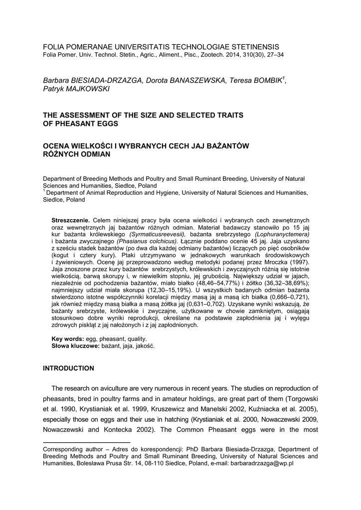 FOLIA POMERANAE UNIVERSITATIS TECHNOLOGIAE STETINENSIS Folia Pomer. Univ. Technol. Stetin., Agric., Aliment., Pisc., Zootech. 2014, 310(30), 27–34 Barbara BIESIADA-DRZAZGA, Dorota BANASZEWSKA, Teresa BOMBIK1, Patryk MAJKOWSKI1 THE ASSESSMENT OF THE SIZE AND SELECTED TRAITS OF PHEASANT EGGS OCENA WIELKOŚCI I WYBRANYCH CECH JAJ BAŻANTÓW RÓŻNYCH ODMIAN Department of Breeding Methods and Poultry and Small Ruminant Breeding, University of Natural Sciences and Humanities, Siedlce, Poland 1 Department of Animal Reproduction and Hygiene, University of Natural Sciences and Humanities, Siedlce, Poland Streszczenie. Celem niniejszej pracy była ocena wielkości i wybranych cech zewnętrznych oraz wewnętrznych jaj bażantów różnych odmian. Materiał badawczy stanowiło po 15 jaj kur bażanta królewskiego (Syrmaticusreevesii), bażanta srebrzystego (Lophuranyctemera) i bażanta zwyczajnego (Phasianus colchicus). Łącznie poddano ocenie 45 jaj. Jaja uzyskano z sześciu stadek bażantów (po dwa dla każdej odmiany bażantów) liczących po pięć osobników (kogut i cztery kury). Ptaki utrzymywano w jednakowych warunkach środowiskowych i żywieniowych. Ocenę jaj przeprowadzono według metodyki podanej przez Mroczka (1997). Jaja znoszone przez kury bażantów srebrzystych, królewskich i zwyczajnych różnią się istotnie wielkością, barwą skorupy i, w niewielkim stopniu, jej grubością. Największy udział w jajach, niezależnie od pochodzenia bażantów, miało białko (48,46–54,77%) i żółtko (36,32–38,69%); najmniejszy udział miała skorupa (12,30–15,19%). U wszystkich badanych odmian bażanta stwierdzono istotne współczynniki korelacji między masą jaj a masą ich białka (0,666–0,721), jak również między masą białka a masą żółtka jaj (0,631–0,702). Uzyskane wyniki wskazują, że bażanty srebrzyste, królewskie i zwyczajne, użytkowane w chowie zamkniętym, osiągają stosunkowo dobre wyniki reprodukcji, określane na podstawie zapłodnienia jaj i wylęgu zdrowych piskląt z jaj nałożonych i z jaj zapłodnionych. Key words: egg, pheasant, quality. Słowa kluczowe: bażant, jaja, jakość. INTRODUCTION The research on aviculture are very numerous in recent years. The studies on reproduction of pheasants, bred in poultry farms and in amateur holdings, are great part of them (Torgowski et al. 1990, Krystianiak et al. 1999, Kruszewicz and Manelski 2002, Kuźniacka et al. 2005), especially those on eggs and their use in hatching (Krystianiak et al. 2000, Nowaczewski 2009, Nowaczewski and Kontecka 2002). The Common Pheasant eggs were in the most Corresponding author – Adres do korespondencji: PhD Barbara Biesiada-Drzazga, Department of Breeding Methods and Poultry and Small Ruminant Breeding, University of Natural Sciences and Humanities, Bolesława Prusa Str. 14, 08-110 Siedlce, Poland, e-mail: [email protected] 28 B. Biesiada-Drzazga et al. researched group, eggs of others strains like the Reeve’s Pheasant and the Silver Pheasant were less common (Mróz 1998, Mróz et al. 2003). The previous own research (Biesiada-Drzazga 2009) revealed the substantial influence of the pheasants’ origin on the majority of external traits and morphological composition of their eggs. Then, the research of Krystianiak et al. (2005) revealed the influence of the shell colour of the Common Pheasant on its traits. Besides, the research showed the issue of eliminating blue eggs from those destined to incubation. The aim of the present paper was to assess the eggs size and to evaluate selected external and internal egg traits of different pheasant strains. MATERIALS AND METHODS The research material consisted of 45 eggs, 15 of each pheasant strain: the Common Pheasant, the Reeve’s Pheasant and the Silver Pheasant. Reproduction of breeding pheasants elected in May. Selected to experience pheasants were around the age of 11–12 months. The eggs were taken from 6 flocks (2 for each strain) with 5 birds: 1 male and 4 females. The birds were reared under the same environmental and nutritional conditions. In the laying period the pheasants were fed according to the guidelines (Mróz 1998). The oilseeds and grain were the main feed but root and soilage were also accessible. The endeavour of the research was to hold the daily ration on the average level of 20% albumen, up to 5% of crude and around 11,5MJ of metabolic energy. The examined eggs were layed by pheasant hens between the end of April and the end of May and they had proper morphology and shape. The eggs were examined according to Mroczek’s (1997) methodology which consists in the assessment of the whole eggs and then after breaking them up on the glass plate. The measurements were determined using electronic scales, micrometer bolt, tripod, electronic calliper, planimeter and Le Roche’s scale. The whole eggs assessment was to determine the egg weight, the longitudinal and transversal axis’es length as well as the egg shell condition and colour. The assessment of eggs after breaking them up on the glass plate embraced the following traits: the weight of egg shell, albumen and yolk as well as the egg shell thickness and the colour of yolk. On the basis of collected data it was possible to determine the egg shape index (Ik) and the yolk index (Iż) according to the following pattern: Ik = egg length / egg width Iż = yolk height / yolk diameter The received results were statistically measured by average values and coefficients of variation. The importance of statistic differences between the average values was examined with the Tukey test (StatSoft Inc. 2001). The correlation coefficients were determined for the analyzed traits. The results of different pheasant strains individual hatches were also collated. The assessment of the size 29 RESULTS AND DISCUSSION Table 1 shows the results for an average egg weight and selected external traits for the Reeve’s Pheasant, Common Pheasant and Silver Pheasant, from which 