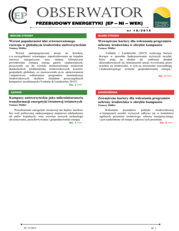OBSERWATOR PRZEBUDOWY ENERGETYKI (EP – NI – WEK) nr 13/2015 MOCNE STRONY SŁABE STRONY Wzrost popularności idei zrównoważonego rozwoju w globalnym środowisku uniwersyteckim Wewnętrzne bariery dla wdrażania programów ochrony środowiska w obrębie kampusów Tomasz Müller Tomasz Müller Wzrost antropogenicznej presji na biosferę, a w szczególności wzrastające zapotrzebowanie na kopalne surowce energetyczne oraz zmiany klimatyczne powodowane rosnącą emisją gazów cieplarnianych, przyczyniły się do wzrostu zainteresowania środowisk akademickich problematyką środowiskowych kosztów gospodarki globalnej, co zaowocowało m.in. opracowaniem i stopniowym wdrażaniem programów minimalizacji środowiskowych skutków działania poszczególnych kampusów uczelnianych (Verhulst & Lambrechts 2015)1. Str. 2 >>> Verhulst i Lambrechts (2015) wyliczają bariery tkwiące w sposobie funkcjonowania wyższych uczelni, które stoją na drodze do realizacji działań ukierunkowanych na zmniejszenie presji wywieranej przez uczelnie na środowisko, w tym na stworzenie oszczędnego i niskoemisyjnego systemu gospodarowania energią.1 Str. 2 >>> ZA ZAGROŽENIA SZANSE Kampusy uniwersyteckie jako mikrolaboratoria transformacji energetyki światowej światowych Zewnętrzne bariery dla wdrażania programów ochrony środowiska w obrębie kampusów Tomasz Müller Tomasz Müller Przeobrażenie energetyki światowej nie będzie możliwe bez woli politycznej sankcjonującej stopniowe odchodzenie od paliw kopalnych, oraz rozwoju nowych technologii otrzymywania, przechowywania i gospodarowania energią. Str. 3 >>> Nr 13/2015 Wdrażanie postulatów polityki środowiskowej w kampusach uczelni wyższych odbywa się w kontekście ogólnych przemian światowego sektora energetycznego, i jest uzależnione od tempa i zakresu tych przemian. Str. 4 >>> str. 1 OBSERWATOR PRZEBUDOWY ENERGETYKI (EP – NI – WEK) MOCNE STRONY Wzrost popularności idei zrównoważonego rozwoju w globalnym środowisku uniwersyteckim Wzrost antropogenicznej presji na biosferę, a w szczególności wzrastające zapotrzebowanie na kopalne surowce energetyczne oraz zmiany klimatyczne powodowane rosnącą emisją gazów cieplarnianych, przyczyniły się do wzrostu zainteresowania środowisk akademickich problematyką środowiskowych kosztów gospodarki globalnej, co zaowocowało m.in. opracowaniem i stopniowym wdrażaniem programów minimalizacji środowiskowych skutków działania poszczególnych kampusów uczelnianych (Verhulst & Lambrechts 2015)1. Prym we wdrażaniu tych programów, których istotną część stanowią zagadnienia polityki energetycznej, wiodą uczelnie amerykańskie i zachodnioeuropejskie, jednak działania na rzecz zmniejszenia presji środowiskowej wywieranej bezpośrednio przez kampusy uczelniane, są podejmowane także w innych częściach globu (Geng et al. 20132; Górecki et al. 20133; Jain et al. 20154; GreenestUniversities; Olsztyn_UWM). Wyrazem znaczenia nadawanego programom ograniczania presji na środowisko przez kampusy uniwersyteckie w Stanach Zjednoczonych i Kanadzie było powstanie w 2006 roku stowarzyszenia AASHE (Association for the Advancement of Sustainability in Higher Education) integrującego starania o przeobrażanie kampusów zgodnie z zasadami tzw. zrównoważonego rozwoju, zakładającego korzystanie z zasobów środowiska przyrodniczego w sposób umożliwiający ich odtwarzanie się, przy jednoczesnym zapewnieniu warunków do rozwoju organizacji we wszystkich jego aspektach [AASHE]. Odpowiednikiem AASHE w europejskim środowisku uczelnianym jest stowarzyszenie Copernicus Alliance założone w 2007 roku [Copernicus Alliance]. Proponowane lub realizowane programy uniwersyteckie koncentrują się głównie wokół trzech podstawowych zagadnień; zmniejszenia zapotrzebowania kampusów na energię, któremu towarzyszy ograniczanie proporcji energii pozyskiwanej z paliw kopalnych, rozwojowi badań nad technologiami odnawialnymi, który uzupełnia rosnąca oferta kursów dla studentów, oraz propagowaniu idei zmniejszania kosztów środowiskowych działalności człowieka, zarówno wśród społeczności uniwersyteckiej, jak i poza nią. Przemiany sposobów pozyskiwania i gospodarowania energią obejmują zarówno działania czysto techniczne jak np. zastąpienie w marcu 2011 roku ciepłowni węglowej, układem kogeneracyjnym wykorzystującym gaz ziemny w obrębie kampusu Ithaca w Cornell University, (Nowy York, USA), czy też instalacja systemu ogrzewania kampusu opartego o gruntową pompę ciepła (GSHP) w Shenyang University (Prowincja Liaoning, Chiny), jak i przedsięwzięcia sprzyjające takim zachowaniom społeczności uniwersyteckiej, które przyczyniają się do oszczędności energii. Nowy układ kogeneracyjny w Cornell University przyczynił się w dużej mierze do zmniejszenia emisji gazów cieplarnianych przez uczelnię o 32%, w stosunku do roku 2008, natomiast zmniejszenie emisji gazów cieplarnianych dzięki obecności systemu gruntowych pomp ciepła w Shenyang University szacuje się na 21 tysięcy ton w skali roku. Doświadczenia z wdrażania programów ochrony środowiska w uniwersytetach Cornell i Shenyang wskazują na wzajemne przenikanie się trzech wyróżnionych uprzednio aspektów działania; istotną częścią programów zmniejszania zapotrzebowania kampusów na energię Nr 13/2015 stanowią działania podejmowane przez członków społeczności uniwersyteckiej korzystających z energii w czasie wykonywania codziennych obowiązków, z kolei częstość zachowań przyczyniających się do oszczędnego gospodarowania energią wynika m. in. z wiedzy na temat presji człowieka na ekosystemy (Geng et al. 2013). Charakterystyczną cechą niektórych uczelnianych programów środowiskowych jest rozpisanie planowanych działań na kilka (wiele) lat do przodu – niejednokrotnie do roku 2050, oraz określenie wielu celów pośrednich wraz z harmonogramem ich realizacji (Harvard_Su