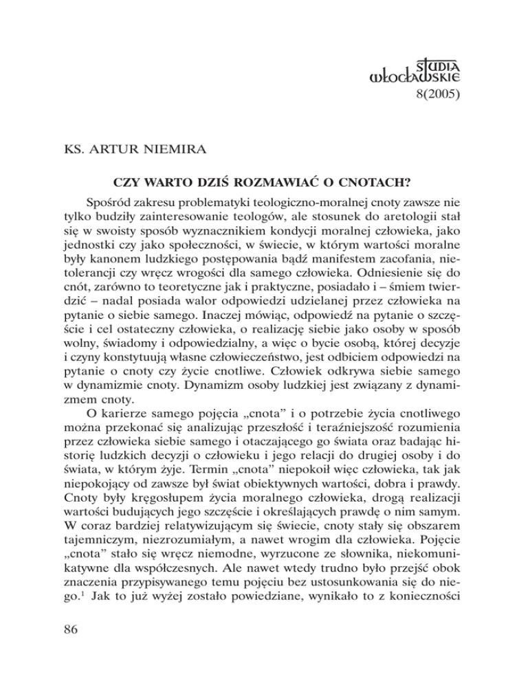 8(2005) KS. ARTUR NIEMIRA CZY WARTO DZIŚ ROZMAWIAĆ O CNOTACH? Spośród zakresu problematyki teologiczno-moralnej cnoty zawsze nie tylko budziły zainteresowanie teologów, ale stosunek do aretologii stał się w swoisty sposób wyznacznikiem kondycji moralnej człowieka, jako jednostki czy jako społeczności, w świecie, w którym wartości moralne były kanonem ludzkiego postępowania bądź manifestem zacofania, nietolerancji czy wręcz wrogości dla samego człowieka. Odniesienie się do cnót, zarówno to teoretyczne jak i praktyczne, posiadało i – śmiem twierdzić – nadal posiada walor odpowiedzi udzielanej przez człowieka na pytanie o siebie samego. Inaczej mówiąc, odpowiedź na pytanie o szczęście i cel ostateczny człowieka, o realizację siebie jako osoby w sposób wolny, świadomy i odpowiedzialny, a więc o bycie osobą, której decyzje i czyny konstytuują własne człowieczeństwo, jest odbiciem odpowiedzi na pytanie o cnoty czy życie cnotliwe. Człowiek odkrywa siebie samego w dynamizmie cnoty. Dynamizm osoby ludzkiej jest związany z dynamizmem cnoty. O karierze samego pojęcia „cnota” i o potrzebie życia cnotliwego można przekonać się analizując przeszłość i teraźniejszość rozumienia przez człowieka siebie samego i otaczającego go świata oraz badając historię ludzkich decyzji o człowieku i jego relacji do drugiej osoby i do świata, w którym żyje. Termin „cnota” niepokoił więc człowieka, tak jak niepokojący od zawsze był świat obiektywnych wartości, dobra i prawdy. Cnoty były kręgosłupem życia moralnego człowieka, drogą realizacji wartości budujących jego szczęście i określających prawdę o nim samym. W coraz bardziej relatywizującym się świecie, cnoty stały się obszarem tajemniczym, niezrozumiałym, a nawet wrogim dla człowieka. Pojęcie „cnota” stało się wręcz niemodne, wyrzucone ze słownika, niekomunikatywne dla współczesnych. Ale nawet wtedy trudno było przejść obok znaczenia przypisywanego temu pojęciu bez ustosunkowania się do niego.1 Jak to już wyżej zostało powiedziane, wynikało to z konieczności 86 dawania samemu sobie odpowiedzi na pytanie, kim jest człowiek i jak powinien żyć. Cnota zyskiwała na znaczeniu, gdy człowiek stawał w prawdzie o sobie samym, ale spychana była na margines ludzkiego życia czy stawała się przedmiotem kpiny, gdy człowiek, w imię nowoczesności i postępu, w podążaniu za wolnością zapominał o jej organicznym złączeniu z odpowiedzialnością. Na przykładzie ostatnich wydarzeń można zauważyć to napięcie, o którym mowa powyżej. Z jednej strony pojęcie „cnota” nic nie mówi współczesnemu człowiekowi, jest znaczeniowo zawężane, a nawet chorobliwie wiązane ze sferą ludzkiej miłości, dodajmy, także znaczeniowo wypaczanej, co powoduje, że postuluje się odejście od tej kategorii moralnej. Z drugiej zaś strony pojęcie to nabywa walorów w momencie, gdy kłamliwie próbuje się nieść sztandary tolerancji dla odrębnych światopoglądów i religii, i w jej imię, a tak naprawdę w imię kłamstwa, wyeliminować Chrystusa z europejskiej kultury. Spór o święta Bożego Narodzenia w 2004 roku doszedł do absurdu. We Włoszech zaproponowano, by dla uszanowania odrębności religijnej niewierzących w Chrystusa w kolędach imię Gesú (Jezus) zastąpić słowem virtú, co znaczy właśnie „cnota”. Zapytać więc trzeba o to, czym jest cnota i jakie ma ona znaczenie dla życia człowieka. Z pozycji teologa należy uściślić to pytanie o problem zbawienia, zapytać o to, czy cnota jest przestrzenią spotkania człowieka z Bogiem, wejścia w relację z Nim i drogą osiągnięcia celu ostatecznego. W zagadnieniu tym chodzi więc o prawdę o człowieku i jego życiu. 1. Czym jest cnota? Pojęcie „cnota” w rozumieniu, jakie występuje w kulturze filozoficzno-teologicznej świata zachodniego, bierze swój początek z myśli Arystotelesa i stoików oraz z jej chrześcijańskiej reinterpretacji, której najdojrzalszym rozwinięciem był system św. Tomasza z Akwinu. Cnoty w jego ujęciu stały się konstrukcją nośną całej moralności chrześcijańskiej. Zdaje się bowiem, że dla Akwinaty to one właśnie są drogą mówienia prawdy o człowieku i jego życiu.2 Rozpoczynając drugą część Sumy teologicznej, św. Tomasz napisał wstęp, który jednoznacznie wskazuje na to, że dla niego nauka o moralności jest nauką o człowieku. W konsekwencji więc cnota nie tylko jest sposobem mówienia prawdy o osobie ludzkiej, ale ma służyć temu, by człowiek stał się dobry.3 Cnota wiąże się więc z takim działaniem człowieka, poprzez które staje się on dobry. Nie można za- 87 pomnieć wreszcie, że poruszamy się na gruncie teologii moralnej, a więc stawanie się dobrym ma swój konkretny wzór w Bogu, który objawił się w Jezusie Chrystusie. Cnota ma więc ścisły związek z naśladowaniem Chrystusa, modelowaniem własnego życia tak, by było ono jak życie Chrystusa. Wymienione tutaj elementy dają konkretny obraz tego, że cnota nie jest pojęciem abstrakcyjnym, ale ma wymiar egzystencjalny. Dynamizm cnoty, jak zostało powiedziane wyżej, jest dynamizmem osoby, jej życia. Cnota jest drogą poszukiwania sensu ludzkiego życia i ludzkich czynów. To związanie cnoty z osobą i jej życiem jest niezwykle istotne. Cnota umożliwia bowiem pójście drogą, na której człowiek znajduje się już na mocy tego, że jest człowiekiem, że został stworzony przez Boga. Drogą człowieka jest więc realizacja tego, w co został z natury wyposażony, lub też pójście za skłonnością swojej natury, w którą wpisane jest powołanie do stawania się prawdziwym człowiekiem, a więc rozumna realizacja siebie, bo człowiek ma rozumną naturę.4 Cnota ukierunkowana jest na działanie rozumne, na czynienie dobra. Czyny ludzkie czy działanie człowieka wpisane są w jego egzystencję, w jego bycie człowiekiem. 