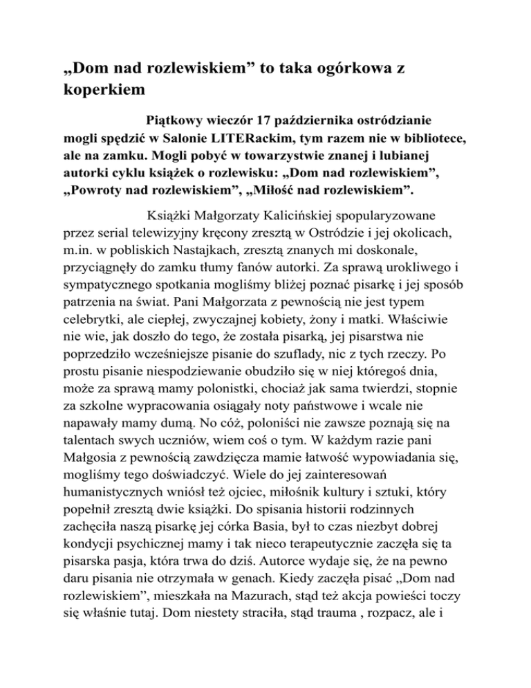 „Dom nad rozlewiskiem” to taka ogórkowa z koperkiem Piątkowy wieczór 17 października ostródzianie mogli spędzić w Salonie LITERackim, tym razem nie w bibliotece, ale na zamku. Mogli pobyć w towarzystwie znanej i lubianej autorki cyklu książek o rozlewisku: „Dom nad rozlewiskiem”, „Powroty nad rozlewiskiem”, „Miłość nad rozlewiskiem”. Książki Małgorzaty Kalicińskiej spopularyzowane przez serial telewizyjny kręcony zresztą w Ostródzie i jej okolicach, m.in. w pobliskich Nastajkach, zresztą znanych mi doskonale, przyciągnęły do zamku tłumy fanów autorki. Za sprawą urokliwego i sympatycznego spotkania mogliśmy bliżej poznać pisarkę i jej sposób patrzenia na świat. Pani Małgorzata z pewnością nie jest typem celebrytki, ale ciepłej, zwyczajnej kobiety, żony i matki. Właściwie nie wie, jak doszło do tego, że została pisarką, jej pisarstwa nie poprzedziło wcześniejsze pisanie do szuflady, nic z tych rzeczy. Po prostu pisanie niespodziewanie obudziło się w niej któregoś dnia, może za sprawą mamy polonistki, chociaż jak sama twierdzi, stopnie za szkolne wypracowania osiągały noty państwowe i wcale nie napawały mamy dumą. No cóż, poloniści nie zawsze poznają się na talentach swych uczniów, wiem coś o tym. W każdym razie pani Małgosia z pewnością zawdzięcza mamie łatwość wypowiadania się, mogliśmy tego doświadczyć. Wiele do jej zainteresowań humanistycznych wniósł też ojciec, miłośnik kultury i sztuki, który popełnił zresztą dwie książki. Do spisania historii rodzinnych zachęciła naszą pisarkę jej córka Basia, był to czas niezbyt dobrej kondycji psychicznej mamy i tak nieco terapeutycznie zaczęła się ta pisarska pasja, która trwa do dziś. Autorce wydaje się, że na pewno daru pisania nie otrzymała w genach. Kiedy zaczęła pisać „Dom nad rozlewiskiem”, mieszkała na Mazurach, stąd też akcja powieści toczy się właśnie tutaj. Dom niestety straciła, stąd trauma , rozpacz, ale i pisanie jako rodzaj terapii. Jak mówi, za namową córki postanowiła sobie napisać książkę, nie myślała o żadnej komercji. To córka zmobilizowała ją później do tego, by zainteresować książką wydawców. Pani Małgorzata ma ogromny szacunek dla czytelników i świadomość tego, że to właśnie im zawdzięcza popularność. Pokochały ją tysiące czytelników, głównie chyba czytelniczek, o czym świadczyła wysoka frekwencja na spotkaniu, a nawet obecność licznej grupy fanek z Litwy. Sama autorka unika jednak chwalenia się swoimi sukcesami literackimi, a ponieważ bardzo lubi gotować, woli w tym temacie używać metaforyki kulinarnej: „Niechcąco ugotowałam zupę, która bardzo smakuje. „Dom nad rozlewiskiem” to taka ogórkowa z koperkiem”. Jak widać, kolejne zupy też czytelnikom przypadły do gustu. Pani Małgosia dziękuje czytelnikom za to, że lubią jej kuchnię, bardzo prostą kuchnię. Autorka cyklu książek o rozlewisku jest również bardzo wrażliwa na przyrodę, mówi, że dostrzeganie piękna przyrody przychodzi z wiekiem, jako dziecko nie zauważała uroków natury. Dar wielbienia natury otrzymała, mieszkając właśnie na Mazurach. Wykorzystuje swoje fascynacje przyrodą, opisując ją w swoich książkach, czasami, ku zdziwieniu czytelników, uświadamia im piękno terenów, na których mieszkają. Zamkowe spotkanie z autorką połączone było także z promocją najnowszej książki napisanej wspólnie z córką Basią Grabowską „Kochana moja. Rozmowa przez ocean”. Wcześniej wydana została książka także pisana wspólnie- „Irena”. Jeden rozdział pisała mama, drugi córka, dzielił je ocean, bowiem córka mieszka w Australii, ale od czegóż komputery, dzisiaj to technicznie dość łatwe. Podobnie pisana była „Kochana moja”. Zawiera 20 tematów, każdemu z nich poświecony jest jeden list matki i jeden córki. Niektóre tematy są lekkie, łatwe i przyjemne, inne trudniejsze, jak chociażby poświęcone śmierci i odchodzeniu, w tym tajemniczemu pajączkowi, który przynosi wyzwolenie od cierpień. „Kochana moja” to opowieści o przyjaźni, o pięknie, kobiecej solidarności, mężczyznach, ale także tradycjach rodzinnych, o domu. Jak mówi sama autorka, dom dla niej i dla córki, to już nie miejsce, to uczucie, to tradycje, pewna nostalgia, pewne rodzinne zwyczaje, wspólne posiłki. Uważa bowiem, że wspólne posiłki są po to, byśmy ze sobą rozmawiali. Mama i córka ciągle „piszą przez ocean”, bo bardzo lubią w ten sposób ze sobą rozmawiać. Może kiedyś pani Małgosia wyjedzie do córki, nawet na stałe, twierdzi, że dziś chyba nie należy przywiązywać się do miejsca. Wbrew pewnej staroświeckości, do której się zresztą przyznaje, cechuje ją otwartość na świat. Córka Basia lubi siebie w Australii, jest jej tam dobrze i mama to rozumie. Na spotkaniu pojawiła się także producentka serialu o rozlewiskuKatarzyna Kalicińska ( zbieżność nazwisk przypadkowa). Mówiła o swojej fascynacji „Domem nad rozlewiskiem”, o trudnościach i bolączkach producenta przekładającego materię literacką na język filmu, o sentymencie do Ostródy i ostródzian. Pani Kasia wyjaśniła też, że jedynie początkowe serie serialu oparte były bezpośrednio na książkach Małgorzaty Kalicińskiej, kolejne serie łączą z jej książkami już tylko bohaterowie. Producentka wiele ciepłych słów wypowiedziała także pod adresem olsztyńskich aktorów grających w filmie i zapowiedziała piątą serię serialu. Pani Małgorzata ze swej strony dodała, że nie ingeruje w materię filmową, bo książka i film to dwa osobne produkty. To było bardzo sympatyczne i ciepłe spotkanie. Panią Małgorzatę Kalicińską zapamiętamy jako przyjazną ludziom i światu kobietę, autorkę lubianych powieści i felietonów, wrażliwą miłośniczkę natury i relacji rodzinnych. To także miłośniczka barów mlecznyc