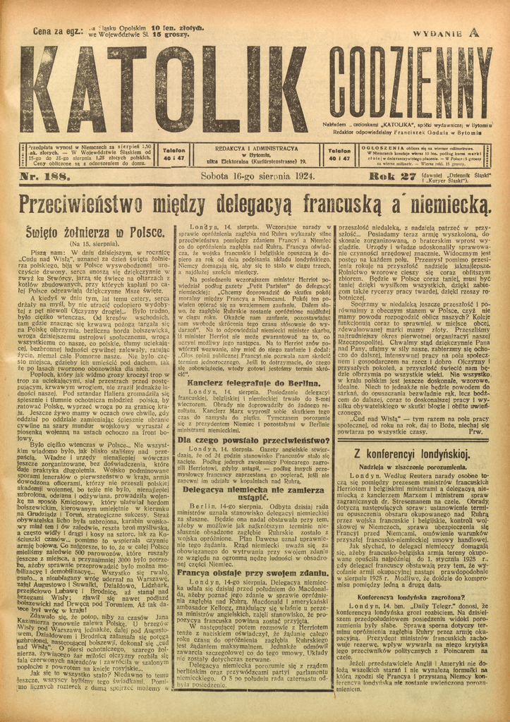 fana >a any ■ -^sku Opolskim 10 ien. złoty<6* UcOd £a cy4.. we Województwie SI. 15 groszy. WYDANIE A KATOLIK* Przedpłata wynosi w Niemczech za sierpień 1,50 ink. złotych. — W Województwie Śląskiem od 15-go do 31-go sierpnia 1,25 złotych polskich. Ceny obliczone są z odnoszeniem do domu. Telefon 40 i 47 Ufr. 188. REDAKCYA I ADMINISTRACYA w Bytomiu, ulica Elektoralna (Kurfürstenstrasse) 19. Telefon 40 I 47 Sobota 16-go sierpnia 1924. OOŁOSZ EN 1 A oblicza się na wiersze milimetrowe. W Niemczech kosztuje wiersz 10 fen. podług kursu marki zł o te j w dniu rzeczywistego płacenia. — W Polsce: 5 groszy za wiersz milimetr. — Wiersz reki. 15 groszy. Kok 27 (dawniej „Dziennik Śląski" i „Kuryer śląski“). Przeciwieństwo między delegacją francuską a niemiecką. SiDięto żołnierza w Polsce. Londyn, 14. sierpnia. Wczorajsze narady w sprawie opróżnienia zagłębia nad Ruhrą wykazały silne przeciwieństwa pomiędzy zdaniem Francy; a Niemiec co do opróżnienia zagłębia nad Ruhrą. Francya oświad cza, że wojska francuskie i belgijskie opuszczą je do piero za rok od dnia podpisania układu londyńskiego. Niemcy domagają się, aby się to stało w ciągu trzech, a najdłużej sześciu miesięcy. Na posiedzeniu wczorajszem minister Herriot po wiedział podług gazety „Petit Parisiem“ do delegacy! niemieckiej: „Chcemy doprowadzić do skutku pokój moralny między Francyą a Niemcami. Pokój ten po winien opierać się na wzajemnem zaufaniu. Dałem sło wo, że zagłębie Ruhrskie zostanie opróżnione najdłużej w ciągu roku. Okażcie nam zaufanie, pozostawiając nam swobodę skrócenia tego czasu stósownie do wy darzeń“. Na to odpowiedział niemiecki minister skarbu, iż minister Herriot nie może gwarantować za to, co uczyni możliwy jego następca. Na to Herriot znów po wtórzył wezwanie, aby mieć do niego zaufanie i dodał: „Głos opinii publicznej Francy! nie pozwala nam skrócić terminu jednorocznego. Jeśli to dotrzymacie, do czego się zobowiążecie, wtedy gotowi jesteśmy termin skró cić“. (Na 15. sierpnia). Piszą nam: W dniu dzisiejszym, w roczńicę „Cudu nad Wisłą“, uznanej za dzień święta żołnie rza polskiego, bija w Polsce wyswobodzonej uro czyście dzwony, serca unoszą się dziękczynnie w zwyż ku Stwórcy, jarzą się świece na ołtarzach z kotłów zbudowanych, przy których kapłani po ca łej Polsce odprawiają dziękczynne Msze święte. A kiedyś w dniu tym, lat temu cztery, serca drżały na myśl, by nie utracić codopiero wydoby tej z pęt niewoli Ojczyzny drogiej... Było trudno, było ciężko wtenczas. Od kresów wschodnich, tam gdzie znacząc się krwawą pożogą targała się na Polskę olbrzymia, bezliczna horda bolszewicka, wroga dzisiejszemu ustrojowi społecznemu, wroga wszystkiemu co nasze, co polskie, tłumy uciekają cej, bezbronnej ludności cywilnej zalewały, ratując życie, niemal całe Pomorze nasze. Nie było czę sto miejsca, gdzieby ich umieścić pod dachem, tak że po lasach tworzono obozowiska dla nich. Popłoch, który jak widmo grozy kroczył trop w trop za uciekającymi, siał przestrach przed postę Kanclerz felegrafnte do Berlina. pującym. krwawym wrogiem, nie zraził jednakże lu Londyn, 14. sierpnia. Posiedzenie delegacy! dności naszej. Pod sztandar Hallera gromadziła się Spiesznie i tłumnie ochotnicza młodzież polska, by francuskiej, belgijskiej i niemieckiej trwało do 8-mej ratować Polskę, wyprzeć wroga po za granicę kra wieczorem. Obrady nie doprowadziły do żadnego re ju. Jeszcze żywo mamy w oczach owe chwile, gdy zultatu. Kanclerz Marx wyprosił sobie skutkiem tego oddział po oddziale zamieniając śpiesznie ubranie czas do namysłu do piątku. Tymczasem porozumie cywilne na szary mundur wojskowy wyruszał z się z prezydentem Niemiec i pozostałymi w Berlinie piosenką wojenną na ustach ochoczo na front bo ministrami niemieckimi. jowy. Dla czego powstało przeciwieństwo? Było ciężko wtenczas w Polsce... Nie wszyst Londyn, 14. sierpnia. Gazety angielskie stwier kim wiadomo było, jak blisko staliśmy nad prze paścią. Władze i urzędy nienajlepiej wówczas dzają, że od 24 godzin stanowisko Francuzów stało się jeszcze zorganizowane, bez doświadczenia, które zacięte. Podług jednych zwolennicy Poincarego zagro daje praktyka długoletnia. Wojsko podminowane zili Herriotowi, gdyby ustąpił, — podług innych’ prze sporami jenerałów o pierwszeństwo w kraju, armja mysłowcy francuscy zaprzestaną go popierać, jeśli nie dowodzona oficerami, którzy nie przeszli polskiej zapewni im udziału w kopalniach nad Ruhrą. akademii wojennej, bo tejże nie było, nienajlepiej Delegacja niemiecka nie zamierza uzbrojona, odziana i odżywiana, prowadziła wojen ustąpić. kę na sposób Kmicicowy, który ułatwiał hordom Berlin, 14-go sierpnia. Odbyta dzisiaj rada bolszewickim, kierowanym umiejętnie w kierunku ministrów uznała stanowisko delegacy! niemieckiej na Grudziądz i Toruń, strategiczne sukcesy. Straż obywatelska licho była uzbrojona, karabin wojsko za słuszne. Będzie ona nadal obstawała przy tern, wy miał ten i ów zaledwie, reszta broń myśliwską, ażeby w możliwie jak najkrótszym terminie nie a często widły i drągi i kosy na sztorc, jak za Ko słusznie obsadzone zagłębie Ruhrskie zostało z ściuszki czasów... pomimo to wspierała czynnie wojska opróżnione. Plan Dawesa uznał uprawnie armję bojową. Co najgorsze, to to, że w całej Polsce nie tego żądania. Rząd niemiecki uważa się za linieliśmy zaledwie 500 parowozów, które ruszały obowiązanego do wytrwania przy swojem zdaniu jeszcze z miejsca, a przynajmniej 3000 było potrze ze względu na ogromną nędzę ludności w obsadzo ba, ażeby sprawnie przeprowadzić było można mo- nej części Niemiec. fbilizacyę i demobiłizacyę... Wszystko się rwało, Francya obstaje przy swojem zdaniu. psuło... a nieubłagany wróg uderzał na Warszawę, Lond