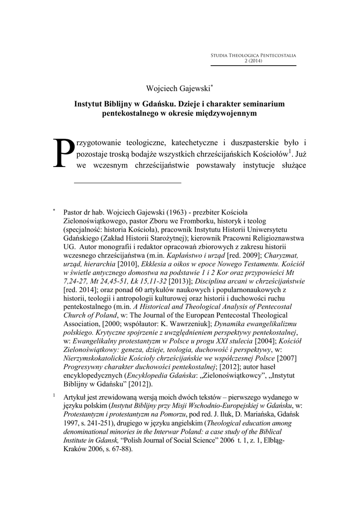 Studia Theologica Pentecostalia 2 (2014) Wojciech Gajewski* Instytut Biblijny w Gdańsku. Dzieje i charakter seminarium pentekostalnego w okresie międzywojennym P rzygotowanie teologiczne, katechetyczne i duszpasterskie było i pozostaje troską bodajże wszystkich chrześcijańskich Kościołów1. Już we wczesnym chrześcijaństwie powstawały instytucje służące * Pastor dr hab. Wojciech Gajewski (1963) - prezbiter Kościoła Zielonoświątkowego, pastor Zboru we Fromborku, historyk i teolog (specjalność: historia Kościoła), pracownik Instytutu Historii Uniwersytetu Gdańskiego (Zakład Historii Starożytnej); kierownik Pracowni Religioznawstwa UG. Autor monografii i redaktor opracowań zbiorowych z zakresu historii wczesnego chrześcijaństwa (m.in. Kapłaństwo i urząd [red. 2009]; Charyzmat, urząd, hierarchia [2010], Ekklesia a oikos w epoce Nowego Testamentu. Kościół w świetle antycznego domostwa na podstawie 1 i 2 Kor oraz przypowieści Mt 7,24-27, Mt 24,45-51, Łk 15,11-32 [2013)]; Disciplina arcani w chrześcijaństwie [red. 2014]; oraz ponad 60 artykułów naukowych i popularnonaukowych z historii, teologii i antropologii kulturowej oraz historii i duchowości ruchu pentekostalnego (m.in. A Historical and Theological Analysis of Pentecostal Church of Poland, w: The Journal of the European Pentecostal Theological Association, [2000; współautor: K. Wawrzeniuk]; Dynamika ewangelikalizmu polskiego. Krytyczne spojrzenie z uwzględnieniem perspektywy pentekostalnej, w: Ewangelikalny protestantyzm w Polsce u progu XXI stulecia [2004]; Kościół Zielonoświątkowy: geneza, dzieje, teologia, duchowość i perspektywy, w: Nierzymskokatolickie Kościoły chrześcijańskie we współczesnej Polsce [2007] Progresywny charakter duchowości pentekostalnej; [2012]; autor haseł encyklopedycznych (Encyklopedia Gdańska: „Zielonoświątkowcy”, „Instytut Biblijny w Gdańsku” [2012]). 1 Artykuł jest zrewidowaną wersją moich dwóch tekstów – pierwszego wydanego w języku polskim (Instytut Biblijny przy Misji Wschodnio-Europejskiej w Gdańsku, w: Protestantyzm i protestantyzm na Pomorzu, pod red. J. Iluk, D. Mariańska, Gdańsk 1997, s. 241-251), drugiego w języku angielskim (Theological education among denominational minories in the Interwar Poland: a case study of the Biblical Institute in Gdansk, “Polish Journal of Social Science” 2006 t. 1, z. 1, ElblągKraków 2006, s. 67-88). odpowiedniej formacji nauczająco-duszpasterskiej osób przygotowujących się do służby. Kościół korzystał z istniejących w antycznym środowisku kulturowym systemów edukacyjnych. Począwszy od judaizmu, poprzez hellenizm i ideały greckiej paidei aż po kulturę łacińską, chrześcijanie czerpali niezbędne elementy, służące do realizowania swojej misji2. Szczególnie istotnymi zjawiskami był wczesnochrześcijański katechumenat3. Był on w pierwszej kolejności formacją inicjacyjną ale jednocześnie stanowił początek systemu edukacyjnego4. Uregulowania w tej kwestii były procesem długotrwałym i zróżnicowanym5. Rolę nauczyciela i wychowawcy kadr duchownych w średniowieczu pełniły klasztory, później również szkoły parafialne, kolegiackie i wreszcie uniwersytety. Szesnastowieczna reformacja odegrała w tym procesie szczególną rolę. Z jednej strony protestanci zwrócili uwagę na konieczność podnoszenia kwalifikacji wśród swoich duchownych, z drugiej zaś reformacja dała swoisty asumpt do rozwoju seminariów duchownych w katolicyzmie6. Należy pamiętać, że poza wyznaniami 2 3 4 5 6 W. Jaeger, Wczesne chrześcijaństwo i grecka paideia, Bydgoszcz 2002. Na temat katechumenatu patrz: J. Chmiel, Pojęcie i rola kerygmatu w pierwotnym Kościele, „Ruch Biblijny i Liturgiczny” 1980 nr 33, s. 58-68; J. Daniélou, Teologia judeochrześcijańska. Historia doktryn chrześcijańskich przed soborem nicejskim, tł. S. Basista, Kraków 2002; M. Dujarier, Krótka historia katechumenatu, tł. A Świeykowska, U. Grajczak, Poznań 1990; A. Läpple, Od egzegezy do katechezy, tł., B. Bielecki, Warszawa 1986; B. Mokrzycki, Droga chrześcijańskiego wtajemniczenia, Warszawa 1983; R. Morawski, Katecheza chrzcielna w procesie wtajemniczenia chrześcijańskiego czasów apostolskich, Warszawa 1990; tenże, Wczesnochrześcijańska katecheza. Do Edyktu Mediolańskiego – 313 r., Płock 1999. W najnowszych badaniach dominuje przekonanie, że katechumenat jest znacznie starszy niż to wcześniej przyjmowano. Jego korzenie sięgają samych początków chrześcijaństwa; por.: B. Górka, Pomiędzy aktem wiary a faktem chrztu. Instytucja nawrócenia w Kościele pierwotnym, Kraków 2000; tenże, Inicjacja w życie wieczne w ewangelii św. Jana, Gdańsk 2005. Złożoność tego zjawiska jest dobrze zarysowana u H. Marrou, Historia wychowania w starożytności, Warszawa 1969, s. 435-486; por.: J Daniélou, H. I. Marrou, Historia Kościoła. Od początków do roku 600, tł. M. Tarnowska, Warszawa 1986, s. 111-117; 149-153; K. Bartnicka, I. Szybiak, Zarys historii wychowania, Warszawa 2001, s. 56. 64. W ramach Soboru Trydenckiego opracowano Dekret o seminariach (15. lipca 1563 roku) określając cele, ale także zalecając biskupom zakładanie seminariów w każdej ewangelickimi i anglikańskim w wyniku reformacji pojawiła się szeroka gama wspólnot ideowo zawiązanych z protestantyzmem7. Niektórzy badacze poza katolicyzmem, prawosławiem i protestantyzmem wymieniają tzw. wolne Kościoły (ang. Free Churches, niem. Freikirchen, w pol. - Kościoły ewangelikalne, chrześcijaństwo ewangeliczne), do których zaliczają m.in. anabaptystów, menonitów, baptystów, metodystów, wolnych chrześcijan, ewangelicznych chrześcijan i zielonoświątkowców8. Kościoły te, poza Stanami Zjednoczonymi, stanowiły mniejszościowe komponenty wchodzące w skład mapy religijnej Europy i świata. Niemniej wniosły one swój wkład w dzieje chrześcijaństwa i rozwoju edukacji religijnej. K