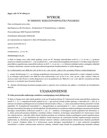 Sygn. akt VI W 2803/12 WYROK W IMIENIU RZECZYPOSPOLITEJ POLSKIEJ Dnia 15 listopada 2013 roku. Sąd Rejonowy dla Wrocławia - Śródmieścia VI Wydział Karny w składzie: Przewodniczący SSR Wojciech SAWICKI Protokolant Aleksandra DZIAŁAK po rozpoznaniu na rozprawie w dniu 08 listopada 2013 roku, sprawy przeciwko A. L. synowi S. i M., urodzonemu (...) w m. W., obwinionego o to, że: w dniu 01 lutego 2012 roku około godziny 12:50 we W. kierując samochodem m-ki S. (...) o nr rej. (...) podczas manewru cofania na jezdni ul. (...) na wysokości ul. (...) nie zachował szczególnej ostrożności, w wyniku czego uderzył w prawidłowo zaparkowany samochód osobowy m-ki F. (...) o nr rej. (...), w którym siedziała osoba a następnie odjechał z miejsca zdarzenia; czynem swoim spowodował zagrożenie bezpieczeństwa w ruchu drogowym; tj. o wykroczenie z art. 86§1 kw i art. 97 kw w zw. z art. 23 ust. 1 pkt 3 i art. 44 ustawy Prawo o ruchu drogowym: I. uznaje obwinionego A. L. za winnego popełnienia zarzucanych mu czynów opisanych w części wstępnej wyroku, tj. za winnego wykroczenia z art. 86§1 kw oraz wykroczenia z art. 97 kw w zw. z art. 44 ust. 1 pkt 1 ustawy z dnia 20 czerwca 1997 roku Prawo o ruchu drogowym i za to na podstawie art. 86§1 kw w zw. z art. 9§2 kw wymierza mu karę grzywny w wysokości 300 (trzystu) złotych; II. obciąża obwinionego kosztami postępowania w sprawie oraz wymierza mu opłatę w wysokości 30 (trzydziestu) złotych. UZASADNIENIE W toku przewodu sądowego ustalono następujący stan faktyczny: W dniu 01 lutego 2012 roku około godziny 12:50 we W.pokrzywdzony W. S.kierował swoim samochodem osobowym marki F. (...)(...) i zaparkował tenże pojazd na ul. (...)po prawej stronie jezdni (patrząc w kierunku pl. (...)II), tj. w zatoczce na miejscu parkingowym na wysokości skrzyżowania z ulicą (...)– przy czym pokrzywdzony pozostał w swoim pojeździe. W. S.zaparkował samochód F. (...)bezpośrednio za samochodem F. (...)na (...)numerach rejestracyjnych, którego nieustalony kierujący po chwili odjechał. Chwilę później na zwolnione miejsce parkingowe postanowił wjechać kierujący samochodem osobowym marki S. (...)((...)) – ustalono, iż kierującym tymże pojazdem był obwiniony A. L., który przewoził pasażera (kobietę w średnim wieku). Ustalono, iż kierujący samochodem S.w krytycznym czasie nie wykonywał tzw. zatoczki, tylko chciał wjechać przodem na zwolnione miejsce parkingowe przed zaparkowanym samochodem F. (...)i po dojechaniu do słupków został zmuszony do wykonania korekty zaplanowanego manewru parkowania, tj. obwiniony postanowił wykonać manewr cofania z jednoczesnym intensywnym skrętem przednich kół w prawo. Ustalono także, iż w krytycznym czasie kierujący samochodem S. (...)nie zachował szczególnej ostrożności w trakcie wykonywania manewru cofania, wskutek czego doszło do przypadkowego kontaktu tylnego prawego naroża bądź też prawej bocznej powierzchni tylnego zderzaka jego samochodu (ewentualnie tylnego prawego koła tegoż pojazdu) z lewą boczną powierzchnią przedniego zderzaka samochodu F.– co spowodowało w samochodzie pokrzywdzonego tym miejscu powstanie zarysowań i drobnych przetarć powłoki lakierniczej. Nie wykluczono możliwości, iż w samochodzie F.w wyniku kontaktu z samochodem S.nastąpiło także uszkodzenie osłony spryskiwacza przedniego lewego reflektora. Ponadto nie wykluczono możliwości, iż w wyniku przedmiotowej kolizji na samochodzie S.nie powstały żadne widoczne uszkodzenia powłoki lakierniczej – tak samo nie potwierdzono związku z tymże zdarzeniem drogowym pojedynczego głębokiego zarysowania powłoki lakierniczej na prawym narożu tylnego zderzaka tegoż pojazdu. Potwierdzono natomiast, iż samochód obwinionego ma zamontowany z tyłu hak holowniczy, który w krytycznym czasie nie kontaktował się z nadwoziem samochodu pokrzywdzonego – był to tzw. tarciowy mechanizm zdarzenia. Ustalono, iż w krytycznym czasie kierujący samochodem F. kilkakrotnie użył sygnału dźwiękowego, a mimo to kierujący samochodem S. mimo świadomości faktu najechania na drugi pojazd gwałtownie ruszył do przodu i ze swawoli (umyślnie) odjechał z miejsca zdarzenia – pokrzywdzony zdążył tylko zapisać numer rejestracyjny pojazdu sprawcy. Ponadto ustalono, iż jeszcze tego samego dnia W. S. pojechał do Komisariatu Policji W., gdzie złożył ustne zawiadomienie o zaistniałym zdarzeniu drogowym. (dowód: zeznania świadka W. S., karty 44-45 akt; częściowo zeznania świadka A. B., karty 42-43 akt; częściowo wyjaśnienia obwinionego, karty 8, 28, 35-36 i 38-39 akt; także: policyjne notatki urzędowe, karty 3 i 5 akt; szkic sytuacyjny wykonany przez świadka W. S., karta 41 akt; dokumentacja fotograficzna w formie wydruków, karty 9-11 akt; dokumentacja fotograficzna z (...) K. we W. na płycie CD-R, karta 52 akt; załączone akta szkodowe samochodu m-ki F. (...) z (...) we W. oraz ustalenia zawarte w pisemnej opinii biegłego sądowego D. K. z dnia 30 czerwca 2013 roku, karty 58-66 akt) Z poczynionych ustaleń wynika, iż patrząc tylko pod względem technicznym i bez dokonywania oceny osobowych źródeł dowodowych (…) nie jest możliwe wykluczenie wprost wariantu obwinionego, według którego do analizowanej kolizji w ogóle nie doszło, a wszelkie rozważania w tym względzie można traktować wyłącznie w kategoriach prawdopodobieństwa podlegającego ocenie Sądu. Z przeprowadzonej analizy wynika również, iż przebieg zdarzenia opisany przez świadka W. S. patrząc pod względem technicznym, jest możliwy, logiczny i bardzo prawdopodobny - nawet przy założeniu, iż w wyniku tej kolizji nie powstały żadne ślady trwałych uszkodzeń na samochodzie S.. Przyjmując, iż obwiniony kierując samochodem S. podczas manewru cofania uderzył w stojący samochód F. należałoby stwierdzić, iż sytuację kolizyjną wytworzyłby wyłącznie obwiniony, nie zachowują