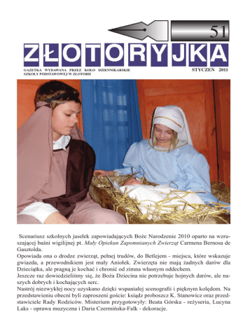 51 GAZETKA WYDAWANA PRZEZ KOŁO DZIENNIKARSKIE SZKOŁY PODSTAWOWEJ W ZŁOTORII STYCZEŃ 2011 Scenariusz szkolnych jasełek zapowiadających Boże Narodzenie 2010 oparto na wzruszającej baśni wigilijnej pt. Mały Opiekun Zapomnianych Zwierząt Carmena Bernosa de Gasztolda. Opowiada ona o drodze zwierząt, pełnej trudów, do Betlejem - miejsca, które wskazuje gwiazda, a przewodnikiem jest mały Aniołek. Zwierzęta nie mają żadnych darów dla Dzieciątka, ale pragną je kochać i chronić od zimna własnym oddechem. Jeszcze raz dowiedzieliśmy się, że Boża Dziecina nie potrzebuje hojnych darów, ale naszych dobrych i kochających serc. Nastrój niezwykłej nocy uzyskano dzięki wspaniałej scenograi i pięknym kolędom. Na przedstawieniu obecni byli zaproszeni goście: ksiądz proboszcz K. Stanowicz oraz przedstawiciele Rady Rodziców. Misterium przygotowyły: Beata Górska - reżyseria, Lucyna Laks - oprawa muzyczna i Daria Czermińska-Falk - dekoracje. Julia Foryś jako Aniołek prowadzi zwierzątka do Betlejem Sara Cyl i Iza Wojnar w roli świątecznych aniołków Bartek Idczak z matematyczką - panią Teresą Szatkowską i mamą Katarzyną Kasia Zająkała, Filip Ciepły, Krystian Dachtera, Dominik Dybcio i Szymon Żbikowski 2 Drogi Święty Mikołaju! Przez cały rok starałem się być grzeczny. Mam nadzieję, że się udało. Wiem, że masz bardzo dużo pracy, ale chyba dla mnie znajdziesz czas. Nie proszę o zabawki, chociaż przyznam, że chętnie dostałbym jakąś książkę lub grę. Proszę o spokój, szczęście i zdrowie dla mojej rodziny. Mikołaju, proszę spełnij moje życzenia, gdyż zdrowie, przyjaźń i szczęście rodzinne są dla mnie ważniejsze od zabawek. Pozdrawiam serdecznie Mateusz MAMY SZKOLNEGO MISTRZA SZACHOWNICY 2011 11 stycznia, po raz 18-ty uczniowie naszej szkoły walczyli o tytuł Szachowego Mistrza Szkoły i awans do Indywidualnych Mistrzostw Torunia Szkół Podstawowych. Do gry przystąpiło 31 zawodników. Turniej rozgrywany był systemem szwajcarskim. Każdy zawodnik zagrał 7 partii. Nad prawidłowym przebiegiem rozgrywek czuwał sędzia krajowy pan Andrzej Michalski. Mistrzostwo szkoły zdobył uczeń klasy VI a Szymon Żbikowski. Drugie miejsce zajął Krystian Dachtera z kl. VIa, a trzecie miejsce Krzysztof Kawczyński z kl. VIb. Najmłodszym zawodnikiem był Franciszek Wojnowski z oddziału przedszkolnego 0 b. Aż 10 uczniów wywalczyło awans do indywidualnych mistrzostw Torunia: Marcin Kaliński, Alicja Krajewska, Katarzyna Zająkała, Szymon Żbikowski, Krystian Dachtera, Maksymilian Serwiński, Hubert Marczuk, Marcel Kaliński, Krzysztof Kawczyński i Oliwia Jachowska. Gratulujemy i życzymy dalszych sukcesów. mgr Wiesława Geras - opiekun koła szachowego 3 PLUSZOWY MIŚ ZNA SIĘ Z DZIEĆMI NIE OD DZIŚ Światowy dzień pluszowego Misia to sympatyczne i miłe święto z radością obchodzone przez dzieci. Ustanowiono je w 2002 r. w setną rocznicę powstania popularnej maskotki misia. 1 grudnia 2010 r. biblioteka szkolna również uczciła to sympatyczne święto. Uczniowie klas 0-III obejrzeli prezentację multimedialną o historii powstania pluszowego misia, poznali i przypomnieli sobie znane misie z książek i z ekranu, wzięli udział w mini-quizie przyrodniczym na temat dwóch gatunków niedźwiedzi: koala i panda, a przede wszystkim doskonale się bawili, biorąc udział w przeróżnych konkursach i zabawach jak np. zjadanie miodu na czas, chwytanie „misiowymi łapkami” przysmaków misiowych (ich rolę pełniły wykałaczki). Imprezę „misiową” uatrakcyjnił występ dziewcząt z kl.V a, które wykonały piosenkę „O kochaniu misia”. Dzieci chętnie wypowiadały się na temat swoich pluszowych maskotek, wiele z nich wypożyczyło własne misie na wystawę. Można ją było oglądać w bibliotece do połowy grudnia. Zaprezentowano również piękne i pomysłowe prace wykonane przez dzieci biorące udział w konkursach plastycznych - kl.I -„Portret misia”, kl.II – „Figurka misia”, kl.III„Plakat przedstawiający niedźwiedzie wybranych gatunków”. Laureaci konkursów otrzymali dyplomy i nagrody rzeczowe, nie zabrakło też słodkiego upominku dla wszystkich mgr Dorota Wyszogrodzka-Trybel SUKCESY UCZNIÓW W KONKURSACH PRZEDMIOTOWYCH Co roku organizowane są konkursy przedmiotowe pod patronatem Kuratorium Oświaty. Dają one uczniom możliwość sprawdzenia swoich wiadomości i umiejętności. Na etapie szkolnym najwięcej punktów otrzymali i reprezentowali naszą szkołę w konkursie rejonowym: z języka polskiego - Katarzyna Zająkała, Beata Ptach i Marcin Kaliński z matematyki - Katarzyna Zająkała, Bartłomiej Idczak, Beata Ptach i Marcel Kaliński z przyrody - Katarzyna Zająkała i Marcel Kaliński Do etapu wojewódzkiego przeszła Beata Ptach z języka polskiego. Gratulujemy i trzymamy kciuki 4 WYNIKI W NAUCE W I OKRESIE 2010/2011 Średnia w nauce powyżej 4,75 zachowanie bardzo dobre lub wzorowe KLASA IV A Zoa Bielawska 5,64, Mateusz Orłowski 5,64, Jan Rogalski 5,55, Iga Maciejewska 5,46, Grzegorz Latowski 5,50, Łukasz Chrobak 5,27, Klaudiusz Ciesielski 5,27, Damian Kowalski 5,27, Aleksandra Wernerowicz 5,09, Adam Marczuk 5,09, Martyna Łudzińska 4,91, Samanta Cymer 4,82, Natalia Górecka 4,82, Marcin Rauhut 4,82, Przemysław Sztandarski 4,82 KLASA IV B Alicja Jędras 5,36, Oliwia Rumińska 5,18, Patrycja Wankiewicz 5,00, Oliwia Zarębska 5,00, Natalia Zielinska 5,00, Mateusz Laskowski 5,00, Eryk Cudnik 4,91, Dariusz Szatkowski 4,82 KLASA V A Marcin Kaliński 5,55, Julia Pietkiewicz 5,36, Marek Mikołajczyk 5,36, Mateusz Chrobak 5,27, Izabella Wojnar 5,18, Zuzanna Jarek 5.09, Mateusz Głąb 4,91 KLASA V B Zuzanna Koprowska 5,55, Karolina Wankiewicz 5,36, Jakub Rogoziński 5,09, Julia Dobrzyńska 5,00 KLASA VI A Katarzyna Zająkała 6,00, Alicja Krajewska 5,70, Marcel Kaliński 5,60, Maksymilian Serwiński 5,60, Szymon Żbikowski 4,90, Klaudia Laskowska 4,80, Hubert Marczuk 4,80 KLASA VI