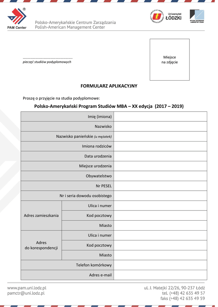 Miejsce na zdjęcie ………………………………………………….. pieczęć studiów podyplomowych FORMULARZ APLIKACYJNY Proszę o przyjęcie na studia podyplomowe: Polsko-Amerykański Program Studiów MBA – XX edycja (2017 – 2019) Imię (imiona) Nazwisko Nazwisko panieńskie (u mężatek) Imiona rodziców Data urodzenia Miejsce urodzenia Obywatelstwo Nr PESEL Nr i seria dowodu osobistego Ulica i numer Adres zamieszkania Kod pocztowy Miasto Ulica i numer Adres do korespondencji Kod pocztowy Miasto Telefon komórkowy Adres e-mail Uczelnia Wydział Kierunek Wykształcenie Rok rozpoczęcia Rok ukończenia Uzyskany tytuł Uczelnia Inne studia podyplomowe Kierunek Rok ukończenia Firma Aktualne miejsce zatrudnienia Adres siedziby Adres miejsca pracy Zajmowane stanowisko Staż pracy w latach na stanowisku kierowniczym* Znajomość języka angielskiego □A1 □A2 □B1 □B2 □C1 *kierowanie wyodrębnioną w strukturze komórką organizacyjną lub kilkuosobowym zespołem pracowników, np. projektem w ramach struktury organizacyjnej firmy. Niniejszym deklaruję, iż opłaty za studia: □ będę pokrywał/a w całości osobiście, □ sfinansuje w całości zakład pracy, □ częściowo będę pokrywał/a osobiście, a częściowo sfinansuje zakład pracy. Wyrażam zgodę na przetwarzanie moich danych osobowych niezbędnych do realizacji sprawnego funkcjonowania procesu dydaktycznego Uczelni (zgodnie z Ustawą z dn. 29.08.1997 o Ochronie Danych Osobowych Dz.U. Nr. 133, poz. 833) …………………………………………………….. …………………………………………………….. Miejscowość i data Podpis Kandydata □C2 Załączniki: 1. □ Formularz aplikacyjny 2. □ CV w języku angielskim 3. □ Personal Statement w języku angielskim 4. □ kopia dyplomu ukończenia studiów 5. □ kopia dowodu osobistego 6. □ 2 fotografie (format legitymacyjny) 7. □ dowód dokonania opłaty rekrutacyjnej Adnotacje Uczelni: Wpłynęło dnia …………………………………………………… Dokumenty numer …………………………………………………… Podpis osoby przyjmującej ……………………………………………….…..