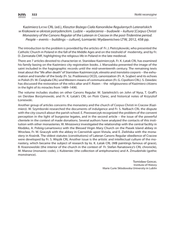 322 Notki recenzyjne Kazimierz ŁATAK CRL (ed.), Klasztor Bożego Ciała Kanoników Regularnych Laterańskich w Krakowie w okresie potrydenckim. Ludzie – wydarzenia – budowle – kultura [Corpus Christi Monastery of the Canons Regular of the Lateran in Cracow in the post-Tridentine period. People – events – buildings – culture], Łomianki: Wydawnictwo LTW, 2012, 458 pp. The introduction to the problem is provided by the articles of Fr. J. Pietrzykowski, who presented the Catholic Church in Poland in the fall of the Middle Ages and on the treshold of modernity, and by Fr. D. Zamiatała CMF, highlighting the religious life in Poland in the late medieval. There are 7 articles devoted to characterize st. Stanisław Kazimierczyk. Fr. K. Łatak CRL has examined his family basing on the Kazimierz city registration books. J. Marszalska presented the image of the saint included in the hagiographic records until the mid-seventeenth century. The remaining texts treat about the “life after death” of Stanisław Kazimierczyk; elevatio and translatio corporis – the exhumation and transfer of the body (Fr. Sz. Praśkiewicz OCD), canonization (Fr. A. Scąber) and its echoes in Polish (Fr. W. Ćwiękała CRL) and Western means of communication (Fr. G. Cipolloni CRL). S. Dziedzic has discussed the restoration of the relics altar and F. Rozen – the religiousness of Kazimierz citizens in the light of its miracles from 1489–1490. The volume includes studies on other Canons Regular: W. Szetelnicki’s on John of Nysa, T. Graff’s on Dersław Borzymowski, and Fr. K. Łatak’s CRL on Piotr Clarec, and historical notes of Krzysztof Łoniewski. Another group of articles concerns the monastery and the church of Corpus Christi in Cracow (Kazimierz). W. Szymborski researched the documents of indulgence and Fr. S. Nalbach CRL the dispute with the city council about the parish school. E. Piwowarczyk recognized the problem of the convent perception in the light of burgeoise legates, and in the second article – the issue of the powerful clientele in the context of made donations. Several authors have analyzed the contacts of this institution with other monasteries. W. Mrozowicz investigated the relationship with the central facility in Kłodzko, A. Pobóg-Lenartowicz with the Blessed Virgin Mary Church on the Piasek Island abbey in Wrocław, Fr. W. Graczyk with the abbey in Czerwińsk upon Vistula, and E. Zielińska with the monastery in Kraśnik. The oldest statutes (constitutions) of Lateran Canons Regular obedience of Cracow were developed by Fr. S. Więzik CRL Another issue is the artistic and intellectual culture of the monastery, which became the subject of research by ks. K. Łatak CRL (MB paintings famous of grace), B. Krasnowolski (the interior of the church in the context of Fr. Stefan Ranatowicz’s CRL chronicle), M. Marosz (monastic code), J. Kubieniec (the collection of antiphonaries) and A. Żmudziński (gothic monstrance). Tomisław GIERGIEL Institute of History Marie Curie Sklodowska University in Lublin