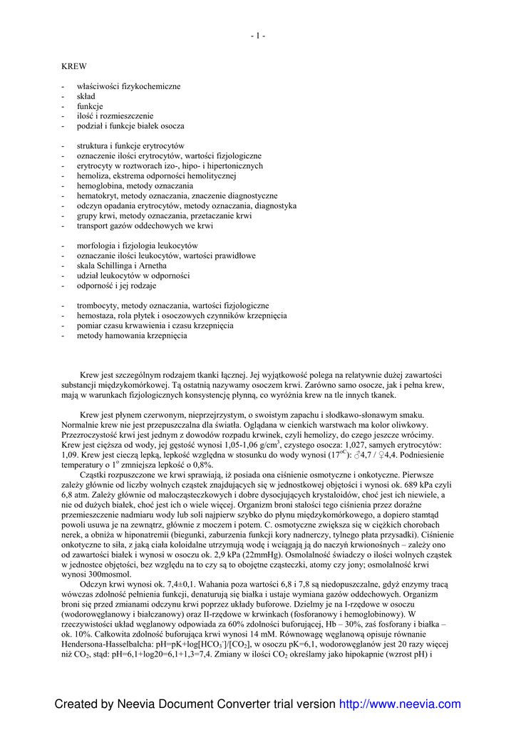 -1- KREW - właściwości fizykochemiczne skład funkcje ilość i rozmieszczenie podział i funkcje białek osocza - struktura i funkcje erytrocytów oznaczenie ilości erytrocytów, wartości fizjologiczne erytrocyty w roztworach izo-, hipo- i hipertonicznych hemoliza, ekstrema odporności hemolitycznej hemoglobina, metody oznaczania hematokryt, metody oznaczania, znaczenie diagnostyczne odczyn opadania erytrocytów, metody oznaczania, diagnostyka grupy krwi, metody oznaczania, przetaczanie krwi transport gazów oddechowych we krwi - morfologia i fizjologia leukocytów oznaczanie ilości leukocytów, wartości prawidłowe skala Schillinga i Arnetha udział leukocytów w odporności odporność i jej rodzaje - trombocyty, metody oznaczania, wartości fizjologiczne hemostaza, rola płytek i osoczowych czynników krzepnięcia pomiar czasu krwawienia i czasu krzepnięcia metody hamowania krzepnięcia Krew jest szczególnym rodzajem tkanki łącznej. Jej wyjątkowość polega na relatywnie duŜej zawartości substancji międzykomórkowej. Tą ostatnią nazywamy osoczem krwi. Zarówno samo osocze, jak i pełna krew, mają w warunkach fizjologicznych konsystencję płynną, co wyróŜnia krew na tle innych tkanek. Krew jest płynem czerwonym, nieprzejrzystym, o swoistym zapachu i słodkawo-słonawym smaku. Normalnie krew nie jest przepuszczalna dla światła. Oglądana w cienkich warstwach ma kolor oliwkowy. Przezroczystość krwi jest jednym z dowodów rozpadu krwinek, czyli hemolizy, do czego jeszcze wrócimy. Krew jest cięŜsza od wody, jej gęstość wynosi 1,05-1,06 g/cm3, czystego osocza: 1,027, samych erytrocytów: 1,09. Krew jest cieczą lepką, lepkość względna w stosunku do wody wynosi (17oC): ♂4,7 / ♀4,4. Podniesienie temperatury o 1o zmniejsza lepkość o 0,8%. Cząstki rozpuszczone we krwi sprawiają, iŜ posiada ona ciśnienie osmotyczne i onkotyczne. Pierwsze zaleŜy głównie od liczby wolnych cząstek znajdujących się w jednostkowej objętości i wynosi ok. 689 kPa czyli 6,8 atm. ZaleŜy głównie od małocząsteczkowych i dobre dysocjujących krystaloidów, choć jest ich niewiele, a nie od duŜych białek, choć jest ich o wiele więcej. Organizm broni stałości tego ciśnienia przez doraźne przemieszczenie nadmiaru wody lub soli najpierw szybko do płynu międzykomórkowego, a dopiero stamtąd powoli usuwa je na zewnątrz, głównie z moczem i potem. C. osmotyczne zwiększa się w cięŜkich chorobach nerek, a obniŜa w hiponatremii (biegunki, zaburzenia funkcji kory nadnerczy, tylnego płata przysadki). Ciśnienie onkotyczne to siła, z jaką ciała koloidalne utrzymują wodę i wciągają ją do naczyń krwionośnych – zaleŜy ono od zawartości białek i wynosi w osoczu ok. 2,9 kPa (22mmHg). Osmolalność świadczy o ilości wolnych cząstek w jednostce objętości, bez względu na to czy są to obojętne cząsteczki, atomy czy jony; osmolalność krwi wynosi 300mosmol. Odczyn krwi wynosi ok. 7,4±0,1. Wahania poza wartości 6,8 i 7,8 są niedopuszczalne, gdyŜ enzymy tracą wówczas zdolność pełnienia funkcji, denaturują się białka i ustaje wymiana gazów oddechowych. Organizm broni się przed zmianami odczynu krwi poprzez układy buforowe. Dzielmy je na I-rzędowe w osoczu (wodorowęglanowy i białczanowy) oraz II-rzędowe w krwinkach (fosforanowy i hemoglobinowy). W rzeczywistości układ węglanowy odpowiada za 60% zdolności buforującej, Hb – 30%, zaś fosforany i białka – ok. 10%. Całkowita zdolność buforująca krwi wynosi 14 mM. Równowagę węglanową opisuje równanie Hendersona-Hasselbalcha: pH=pK+log[HCO3-]/[CO2], w osoczu pK=6,1, wodorowęglanów jest 20 razy więcej niŜ CO2, stąd: pH=6,1+log20=6,1+1,3=7,4. Zmiany w ilości CO2 określamy jako hipokapnie (wzrost pH) i Created by Neevia Document Converter trial version http://www.neevia.com Created by Neevia Document Converter trial version -2- hiperkapnie (obniŜenie pH). Zaburzenia odczynu to kwasice i zasadowice – dzielimy je na oddechowe i metaboliczne, wyrównanie i nie. Pierwszy podział opiera się na określeniu który ze składników równania HH uległ zmianie – licznik czy mianownik. Drugi z kolei – czy zmienia się tylko rezerwa alkaliczna krwi, czy teŜ dochodzi do rzeczywistych zmian pH. Jak kaŜda tkanka, krew składa się z komórek, pomiędzy którymi występuje substancja międzykomórkowa. Bez zewnętrznego działania składniki te nie rozdzielają się same. Komórki stanowią około 40% krwi, pozostałą zaś część – osocze. Do problemu tego wrócimy omawiając hematokryt. Ze względu na róŜnice strukturalne i funkcjonalne krwinki dzielimy na czerwone, białe oraz płytkowe. Osocze składa się w większości z wody (90%), w której rozpuszczone są składniki organiczne i nieorganiczne. Zbytnia ilość wody prowadzi do rozwodnienia – hiperhydremii, zaś niedostateczne – do odwodnienia – hipohydremii. Składniki organiczne występują się w ilości ok. 90g/l, przy czym 70-80g/l stanowią białka. Pozostałe składniki organiczne osocza to: glukoza (5mmol/l, 90mg%), kwas mlekowy i pirogronowy (1,1mmol/l), lipidy całkowite (6g/l), trójglicerydy, fosfolipidy, cholesterol (5,2mmol/l, 200mg%), FFA, mocznik, aminokwasy, kwas moczowy, kreatyna, kreatynina, bilirubina, amoniak, barwniki, witaminy, enzymy, hormony, ciała odpornościowe, katalizatory i inhibitory. Zawartość glukozy wynosi prawidłowo 3,9-6,1 mmol/l tj. 70-100 mg%; stany patologiczne nazywamy odpowiednio hipo- i hiperglikemią. Zawartość tłuszczów zmienia się, lecz przekroczenie norm określa się jako hipo- lub hiperlipidemię. Azot pozabiałkowy, reszta azotowa lub ciała azotowe stanowią ok. 25 mmol N2 / l tj. 35mg%; zatrucie azotowe prowadzi do mocznicy – uremii. Składniki nieorganiczne krwi to głównie jony występujące w ilościach jak poniŜej: kationy aniony ultraskładniki mmol/l mg% mmol/l mg% umol/l ug% Na+ 143 330 Cl102 360 Fe 17,9 100 K+ 4,6 18 HCO326 16