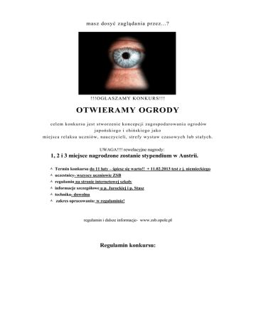 masz dosyć zaglądania przez...? !!!OGŁASZAMY KONKURS!!! OTWIERAMY OGRODY celem konkursu jest stworzenie koncepcji zagospodarowania ogrodów japońskiego i chińskiego jako miejsca relaksu uczniów, nauczycieli, strefy wystaw czasowych lub stałych. UWAGA!!!! rewelacyjne nagrody: 1, 2 i 3 miejsce nagrodzone zostanie stypendium w Austrii. Termin konkursu do 11 luty – śpiesz się warto!! + 11.02.2013 test z j. niemieckiego uczestnicy- wszyscy uczniowie ZSB regulamin na stronie internetowej szkoły informacje szczegółowe u p. Jarockiej i p. Stasz technika- dowolna zakres opracowania: w regulaminie! regulamin i dalsze informacje- www.zsb.opole.pl Regulamin konkursu: 1. Termin składania prac 11 luty 2013 r. do godz. 13.05 w sali 30 naszej szkoły. 2. Uczestnicy: wszyscy uczniowie ZSB z wyjątkiem klas kończących w tym roku szkolnym edukację w naszej szkole. 3. Technika wykonania: dowolna, czyli rysunki, szkice, wizualizacje, technika barwna lub czarno biała, kolaż itp. 4. Prace należy wykonywać indywidualnie! 5. Do składanej pracy należy dołączyć wypełnione przez uczestnika oświadczenie z załącznika 1 do regulaminu. 6. Zakres konkursu: opracowania konkursu architektur krajobrazu: a. pomysł na zagospodarowanie urządzonych terenów ogrodu japońskiego i chińskiego tak, aby służyć mogły jako przestrzeń dla uczniów ZSB, nauczycieli i odwiedzających naszą szkołę b. zaprojektowanie murka/ ogrodzenia wraz z bramą łączącą oba ogrody i oświetleniem (w miejscu obecnego szarego ogrodzenia z gotowych paneli drewnianych) c. projekt detalu małej architektury, którego zadaniem byłoby scalenie kompozycyjne obu ogrodów. test ze znajomości języka niemieckiego- termin 11.02 zgodnie z informacją w szkole 7. ocenie podlegać będzie: oryginalność w realizacji tematu, wartość estetyczna, poprawność merytoryczna, a w zakresie znajomości języka niemieckiego – ocena z języka niemieckiego i wynik testu. 8. Opis prac: na odwrocie pracy konkursowej należy umieścić metryczkę zawierającą wyłącznie: godło, hasło. Dane autora ( imię, nazwisko, klasę) należy umieścić w zaklejonej, oznaczonej godłem/hasłem kopercie, która zostanie dostarczona wraz z pracą. Godło umieszczone na pracy oraz na kopercie powinno być takie samo. Wraz z pracą należy złożyć podpisane przez uczestnika oświadczenie. 9. Posiedzenie komisji konkursowej odbędzie się 11 lutego 2013 r. Wyniki zostaną ogłoszone do 12 lutego na stronie internetowej szkoły. 10. Organizatorzy zastrzegają sobie prawo do wystawiania i publikowania nadesłanych prac. organizatorzy: Anna Stasz, Agnieszka Jarocka, Małgorzata Balcer zał. 1 Oświadczenie …................................................. …....................................... imię i nazwisko uczestnika, klasa data i miejsce Niniejszym oświadczam, że pracę, jaką składam do konkursu wykonywałem samodzielnie. Wyrażam zgodę na jej prezentowanie i publikowanie ….............................................. data, podpis