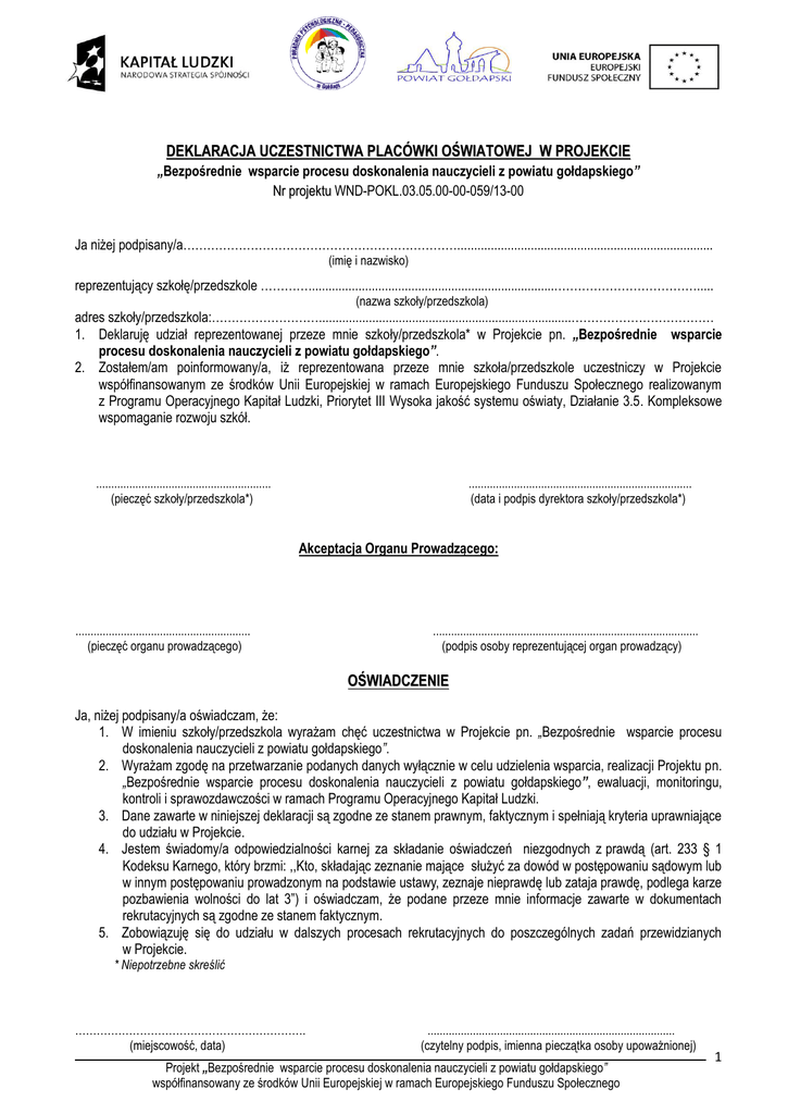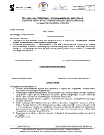 DEKLARACJA UCZESTNICTWA PLACÓWKI OŚWIATOWEJ W PROJEKCIE „Bezpośrednie wsparcie procesu doskonalenia nauczycieli z powiatu gołdapskiego” Nr projektu WND-POKL.03.05.00-00-059/13-00 Ja niżej podpisany/a……………………………………………………………............................................................................. (imię i nazwisko) reprezentujący szkołę/przedszkole …………..........................................................................………………………………..... (nazwa szkoły/przedszkola) adres szkoły/przedszkola:………………………............................................................................……………………………… 1. Deklaruję udział reprezentowanej przeze mnie szkoły/przedszkola* w Projekcie pn. „Bezpośrednie wsparcie procesu doskonalenia nauczycieli z powiatu gołdapskiego”. 2. Zostałem/am poinformowany/a, iż reprezentowana przeze mnie szkoła/przedszkole uczestniczy w Projekcie współfinansowanym ze środków Unii Europejskiej w ramach Europejskiego Funduszu Społecznego realizowanym z Programu Operacyjnego Kapitał Ludzki, Priorytet III Wysoka jakość systemu oświaty, Działanie 3.5. Kompleksowe wspomaganie rozwoju szkół. .......................................................... (pieczęć szkoły/przedszkola*) .......................................................................... (data i podpis dyrektora szkoły/przedszkola*) Akceptacja Organu Prowadzącego: .......................................................... (pieczęć organu prowadzącego) ........................................................................................ (podpis osoby reprezentującej organ prowadzący) OŚWIADCZENIE Ja, niżej podpisany/a oświadczam, że: 1. W imieniu szkoły/przedszkola wyrażam chęć uczestnictwa w Projekcie pn. „Bezpośrednie wsparcie procesu doskonalenia nauczycieli z powiatu gołdapskiego”. 2. Wyrażam zgodę na przetwarzanie podanych danych wyłącznie w celu udzielenia wsparcia, realizacji Projektu pn. „Bezpośrednie wsparcie procesu doskonalenia nauczycieli z powiatu gołdapskiego”, ewaluacji, monitoringu, kontroli i sprawozdawczości w ramach Programu Operacyjnego Kapitał Ludzki. 3. Dane zawarte w niniejszej deklaracji są zgodne ze stanem prawnym, faktycznym i spełniają kryteria uprawniające do udziału w Projekcie. 4. Jestem świadomy/a odpowiedzialności karnej za składanie oświadczeń niezgodnych z prawdą (art. 233 § 1 Kodeksu Karnego, który brzmi: ,,Kto, składając zeznanie mające służyć za dowód w postępowaniu sądowym lub w innym postępowaniu prowadzonym na podstawie ustawy, zeznaje nieprawdę lub zataja prawdę, podlega karze pozbawienia wolności do lat 3”) i oświadczam, że podane przeze mnie informacje zawarte w dokumentach rekrutacyjnych są zgodne ze stanem faktycznym. 5. Zobowiązuję się do udziału w dalszych procesach rekrutacyjnych do poszczególnych zadań przewidzianych w Projekcie. * Niepotrzebne skreślić ………………………………………………………. (miejscowość, data) .................................................................................. (czytelny podpis, imienna pieczątka osoby upoważnionej) Projekt „Bezpośrednie wsparcie procesu doskonalenia nauczycieli z powiatu gołdapskiego” współfinansowany ze środków Unii Europejskiej w ramach Europejskiego Funduszu Społecznego 1 Część II. DANE PLACÓWKI OŚWIATOWEJ BIORĄCEJ UDZIAŁ W PROJEKCIE REALIZOWANYM W RAMACH PROGRAMU OPERACYJNEGO KAPITAŁ LUDZKI Lp. Informacje dotyczące projektu 1 Tytuł projektu: „Bezpośrednie wsparcie procesu doskonalenia nauczycieli z powiatu gołdapskiego” 2 Nr projektu: WND-POKL.03.05.00-00-059/13 3 Priorytet III Wysoka jakość systemu oświaty 4 Działanie 3.5. Kompleksowe wspomaganie rozwoju szkół Dane instytucji, która otrzymuje wsparcie w ramach EFS Lp. Nazwa Dane podstawowe Dane teleadresowe instytucji Osoba wyznaczona do kontaktów roboczych w w/w projekcie 1 Nazwa placówki 2 NIP 3 REGON 4 Typ placówki 5 6 7 8 9 Ulica Nr budynku Nr lokalu Miejscowość Obszar 10 Kod pocztowy 11 12 Województwo Powiat 13 Telefon kontaktowy 14 Adres poczty elektronicznej (e-mail) wiersze nr 16-18 wypełnia Realizator projektu szkoła podstawowa szkoła gimnazjalna szkoła ponadgimnazjalna przedszkole publiczne/niepubliczne Obszar miejski Obszar wiejski - @ Imię i nazwisko 15 Telefon Adres e-mailowy 16 Szczegóły wsparcia 17 18 19 Rodzaj przyznanego wsparcia Data rozpoczęcia udziału w projekcie (data rozpoczęcia szkolenia – pierwszy dzień) Data zakończenia udziału w projekcie (data zakończenia szkolenia – ostatni dzień) Czy wsparciem zostali objęci pracownicy placówki .............................................................. (pieczęć szkoły/przedszkola) / dzień / miesiąc / dzień rok / miesiąc Nie rok Tak ...................................................................... (podpis dyrektora szkoły/przedszkola*) Projekt „Bezpośrednie wsparcie procesu doskonalenia nauczycieli z powiatu gołdapskiego” współfinansowany ze środków Unii Europejskiej w ramach Europejskiego Funduszu Społecznego 2