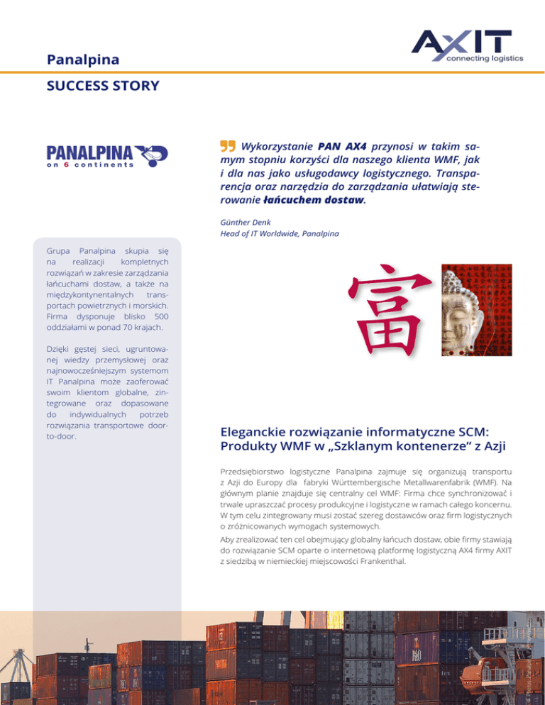 Panalpina SUCCESS STORY Wykorzystanie PAN AX4 przynosi w takim samym stopniu korzyści dla naszego klienta WMF, jak i dla nas jako usługodawcy logistycznego. Transparencja oraz narzędzia do zarządzania ułatwiają sterowanie łańcuchem dostaw. Günther Denk Head of IT Worldwide, Panalpina Grupa Panalpina skupia się na realizacji kompletnych rozwiązań w zakresie zarządzania łańcuchami dostaw, a także na międzykontynentalnych transportach powietrznych i morskich. Firma dysponuje blisko 500 oddziałami w ponad 70 krajach. Eleganckie rozwiązanie informatyczne SCM: Produkty WMF w „Szklanym kontenerze” z Azji Przedsiębiorstwo logistyczne Panalpina zajmuje się organizują transportu z Azji do Europy dla fabryki Württembergische Metallwarenfabrik (WMF). Na głównym planie znajduje się centralny cel WMF: Firma chce synchronizować i trwale upraszczać procesy produkcyjne i logistyczne w ramach całego koncernu. W tym celu zintegrowany musi zostać szereg dostawców oraz firm logistycznych o zróżnicowanych wymogach systemowych. Aby zrealizować ten cel obejmujący globalny łańcuch dostaw, obie firmy stawiają do rozwiązanie SCM oparte o internetową platformę logistyczną AX4 firmy AXIT z siedzibą w niemieckiej miejscowości Frankenthal. Photos: Panalpina, Panthermedia Dzięki gęstej sieci, ugruntowanej wiedzy przemysłowej oraz najnowocześniejszym systemom IT Panalpina może zaoferować swoim klientom globalne, zintegrowane oraz dopasowane do indywidualnych potrzeb rozwiązania transportowe doorto-door. Panalpina SUCCESS STORY WMF jest wiodącym na świecie dostawcą produktów i usług dla stołu oraz kuchni. Firma produkuje artykuły gospodarstwa domowego, artykuły gastronomiczne i hotelowe ze szkła oraz metalu, między innymi naczynia kuchenne, urządzenia kuchenne, sztućce, szklanki i ekspresy do kawy. Zatrudniając blisko 6,0 tys. osób, z czego 8 procent w Azji, firma WMF jest obecna na wielu międzynarodowych rynkach. Wsparciem ma być systematyczne ujednolicanie oraz optymalizacja procesów logistycznych. Istotnym aspektem jest zarządzanie transportem od dostawcy przez Azję do centrum logistycznego WMF w Geislingen. Panalpina jest dla WMF odpowiednim partnerem do realizacji tego projektu. Trzon tych procesów stanowi PAN AX4. Dostosowana specjalnie do firmy Panalpina wersja AX4 jest użytkowana od 2006 roku i powstała w ścisłej współpracy między firmą logistyczną, a firmą AXIT. WYMAGANIA „Szklany kontener” zamiast „czarnej skrzyni”. W celu zapewnienia przejrzystego łańcucha dostaw z Azji do niemieckiego magazynu centralnego konieczna jest nie tylko pełna kontrola trasy każdego pojedynczego kontenera, lecz również szczegółowe określenie jego zawartości. To ostanie jest szczególnie istotne dla procesów logistycznych już w porcie odbioru w Niemczech. Dzięki precyzyjnej wiedzy na temat ładunku znajdującego się w pojemniku transportowym można uniknąć zbędnych działań poszukiwawczych, zorganizować właściwiej rozładunek oraz efektywniej zaplanować dalszy transport lądowy. Ponadto załadowca dąży do przyspieszenia procesów transportowych, na przykład oclenie. Zoptymalizowany przepływ danych ma umożliwiać zbieranie danych oraz ich weryfikację pod względem kompletności i treści. Na tej podstawie możliwe jest sporządzenie ważnych statystyk, które przyczynią się do lepszego planowania łańcucha dostaw i sterowania nim. ROZWIĄZANIE Proces rozpoczyna się od przekazania zamówień z systemu SAP firmy WMF do platformy PAN AX4. W tym miejscu do dyspozycji dostawców z dalekiego Wschodu znajdują się dane w formie spersonalizowanych kont internetowych, które mogą zostać przez nich potwierdzone, odrzucone bądź zmodyfikowane. Na podstawie opracowanych danych dostawcy z Azji sporządzają listy przewozowe oraz przesyłki, które są niezwłocznie przekazywane do ośmiu zintegrowanych oddziałów firmy Panalpina w Azji i Niemczech. W procesie biorą udział, oprócz firmy Panalpina, również inni usługodawcy logistyczni. Wszyscy partnerzy logistyczni przekazują ze swoich systemów do PAN AX4 dane lokalizacyjne dotyczące całego przebiegu transportu. Te jednorodne informacje są na platformie ujednolicane. Dzięki temu termin wyjścia towaru od dostawcy oraz przewidywany termin jego dotarcia do portu odbioru są znane od ręki wszystkim uczestnikom. Dzięki docierającym szybko informacjom istotnie przyspieszony zostaje proces oclenia oraz transport z portu do centrum logistycznego. Specjalne funkcje zarządzania umożliwiają spojrzenie z góry w celu ciągłego ulepszania łańcucha dostaw, np. proaktywne informowanie o opóźnieniach bądź innych nieprawidłowościach. Ponadto WMF uzyskuje różnego rodzaju statystyki. REZULTAT Kontakt: Daniel Kucner Firma Panalpina dostarcza WMF w oparciu o PAN AX4 dopasowaną do potrzeb kombinację transportowo-informatyczną w jednym miejscu, z której obie strony czerpią w tym samym stopniu korzyści. Centralna platforma danych gwarantuje wysoką transparencję, inteligentne narzędzia do zarządzania ułatwiają sterowania łańcuchem dostaw, a nowy sposób zarządzania transportami przynosi efekty w postaci konsolidacji. Kosztowne akcje specjalne przeprowadzane w ostatniej chwili należą do przeszłości: Dzięki lepszemu planowaniu dostaw towaru oraz redukcji transportów specjalnych możliwe jest obniżenie zasobów oraz kosztów transportu. E-Mail: [email protected] Tel.: +48 660 419 682 Obie strony są wysoce zadowolone i przeprowadziły już integrację kolejnych spółek zależnych WMF. Version: 04/2015 AXIT Sp. z o.o. . ul. Swobodna 1 . 50-088 Wroclaw . www.axit.pl
