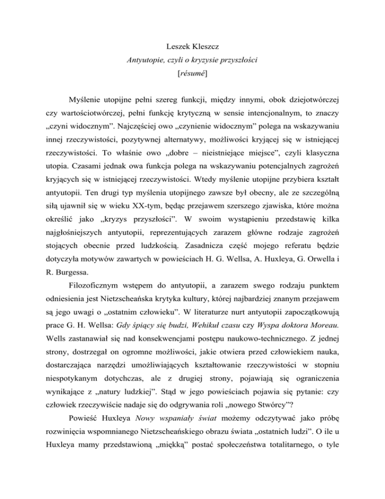 Leszek Kleszcz Antyutopie, czyli o kryzysie przyszłości [résumé