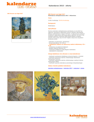 Kalendarze 2015 - oferta 006 Vincent van Gogh 2017 006 Vincent van Gogh 2017 Kalendarze wieloplanszowe 2017 | Malarstwo Cena: 23,90 zł netto/egz. 29,40 zł brutto/egz. Dostępność: Niedostępny Specyfikacja: Ścienny kalendarz wieloplanszowy spiralowany na rok 2017 ze zdjęciami reprodukcji najbardziej znanych obrazów VAN GOGHA. Obrazy wydrukowane w dużym formacie, na błyszczącym papierze kredowym, będą piękną dekoracją salonu, gabinetu czy biura. Dla każdego miłośnika malarstwa VAN GOGHA będzie to idealny prezent, który przez cały rok 2017 będzie cieszył oko wszystkich amatorów sztuki. - kalendarz 13-planszowy, spiralowany - format kalendarza: 42 x 56 cm - dodatkowe miejsce na całoroczny nadruk reklamowy: 42 x 6 cm - drukowany na papierze kredowym - okładka zdobiona lakierem UV - kartonowy podkład na całej długości kalendarza - kalendarium uniwersalne Usługi dodatkowe (nie wliczone w cenę kalendarza): - możliwość zamówienia dodatkowo sztywnej koperty z mikrofali - możliwość wykonania nadruku reklamowego sitodrukiem (kolorystyka Pantone) - możliwość wykonania nadruku reklamowego w pełnym kolorze (kolorystyka CMYK) - możliwość wydruku kalendarza autorskiego (indywidualnego) Zobacz również podobne kalendarze: kalendarz wieloplanszowy | kalendarz 2017 | malarstwo | sztuka www.kalendarzenaczas.pl Kalendarze 2015 - oferta www.kalendarzenaczas.pl Kalendarze 2015 - oferta Inne przykładowe kalendarze z tej samej kategorii www.kalendarzenaczas.pl Kalendarze 2015 - oferta www.kalendarzenaczas.pl