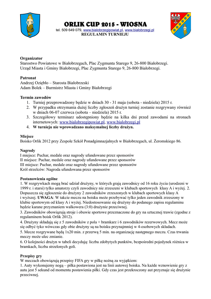 ORLIK CUP 2015 - WIOSNA tel. 509 649 079, www.bialobrzegipowiat.pl, www.bialobrzegi.pl REGULAMIN TURNIEJU Organizator Starostwo Powiatowe w Białobrzegach, Plac Zygmunta Starego 9, 26-800 Białobrzegi. Urząd Miasta i Gminy Białobrzegi, Plac Zygmunta Starego 9, 26-800 Białobrzegi. Patronat Andrzej Oziębło – Starosta Białobrzeski Adam Bolek – Burmistrz Miasta i Gminy Białobrzegi Termin zawodów 1. Turniej przeprowadzony będzie w dniach 30 - 31 maja (sobota - niedziela) 2015 r. 2. W przypadku otrzymania dużej liczby zgłoszeń drużyn turniej zostanie rozgrywany również w dniach 06-07 czerwca (sobota – niedziela) 2015 r. 3. Szczegółowy terminarz udostępniony będzie na kilka dni przed zawodami na stronach internetowych: www.bialobrzegipowiat.pl, www.bialobrzegi.pl 4. W turnieju nie wprowadzano maksymalnej liczby drużyn. Miejsce Boisko Orlik 2012 przy Zespole Szkół Ponadgimnazjalnych w Białobrzegach, ul. Żeromskiego 86. Nagrody I miejsce: Puchar, medale oraz nagrody ufundowane przez sponsorów II miejsce: Puchar, medale oraz nagrody ufundowane przez sponsorów III miejsce: Puchar, medale oraz nagrody ufundowane przez sponsorów Król strzelców: Nagroda ufundowana przez sponsorów Postanowienia ogólne 1. W rozgrywkach mogą brać udział drużyny, w których grają zawodnicy od 16 roku życia (urodzeni w 1999 r. i starsi) tylko amatorzy czyli zawodnicy nie zrzeszeni w klubach sportowych klasy A i wyżej. 2. Dopuszcza się zgłoszenie do drużyny 2 zawodników zrzeszonych w klubach sportowych klasy A i wyższej. UWAGA: W takcie meczu na boisku może przebywać tylko jeden zawodnik zrzeszony w klubie sportowym od klasy A i wyżej. Niedostosowanie się drużyny do podanego zapisu regulaminu będzie karane przyznaniem walkowera (3:0) drużynie przeciwnej. 3. Zawodników obowiązują stroje i obuwie sportowe przeznaczone do gry na sztucznej trawie (zgodne z regulaminem boisk Orlik 2012). 4. Drużyny składają się z 5 zawodników z pola + bramkarz i 6 zawodników rezerwowych. Mecz może się odbyć tyko wówczas gdy obie drużyny są na boisku przynajmniej w 4-osobowych składach. 5. Mecze rozgrywane będą 1x20 min. z przerwą 5 min. na organizację następnego meczu. Czas trwania meczy może ulec zmianie. 6. O kolejności drużyn w tabeli decydują: liczba zdobytych punktów, bezpośredni pojedynek różnica w bramkach, liczba strzelonych goli. Przepisy gry W meczach obowiązują przepisy FIFA gry w piłkę nożną za wyjątkiem: 1. Auty wykonujemy nogą – piłka postawiona jest na linii autowej boiska. Na każde wznowienie gry z autu jest 5 sekund od momentu postawienia piłki. Gdy czas jest przekroczony aut przyznaje się drużynie przeciwnej. ORLIK CUP 2015 - WIOSNA tel. 509 649 079, www.bialobrzegipowiat.pl, www.bialobrzegi.pl REGULAMIN TURNIEJU 2. Zabronione jest wykonywanie wślizgów przez zawodników. Jedynie bramkarz w obrębie swojego pola karnego może wykonać wślizg zgodny z przepisami. Wślizg karany jest rzutem wolnym pośrednim i 1 min karą dla zawodnika. 3. Odległość zawodnika od piłki przy wznawianiu gry wynosi 3 m. 4. Zmiany dokonywane są bez przerywania gry w obrębie ławki rezerwowych na swojej połowie. 5. Niestawienie się drużyny na mecz karane jest przyznaniem walkowera (3-0) drużynie przeciwnej. 6. Bramkarz dokonuje wznowienia gry po aucie bramkowym wyrzucając piłkę ręką lub z piłki stojącej w polu bramkowym nogą. 7. W grze nie stosuje się przepisu o spalonym. Upomnienia i kary 1. Za grę niezgodną z przepisami zawodnik może zostać upomniany czasowym wykluczeniem z gry (2 min lub 5 min) lub w przypadku gry brutalnej, niesportowego zachowania lub nagminnego łamania przepisów całkowitym usunięciem z danego meczu (na jego miejsce wchodzi gracz rezerwowy) do zawieszenia na kilka meczów włącznie. 2. Niewłaściwe zachowanie drużyny lub jej członków poza boiskiem (szatnia, trybuny) może stanowić podstawę do wykluczenia jej z ligi (wyniki meczów są anulowane). Przepisy porządkowe 1. W sprawach budzących wątpliwości, możliwość rozmowy z sędziami zawodów ma tylko kapitan drużyny. Orzeczenie sędziów jest ostateczne. 2. Po każdym meczu kapitan drużyny odpowiedzialny jest za zwrot znaczników do sędziów zawodów. 3. Po strzelonej bramce kapitan drużyny lub strzelec bramki ma obowiązek podania imienia i nazwiska sędziom, celem zanotowania w protokole. 4. Nie dopuszcza się przełożenie meczu na inny termin niż wynikający z terminarza. 5. W sprawach budzących wątpliwości drużyna ma prawo wnieść protest do organizatora. Postanowienie organizatora jest ostateczne. 6. Organizator zastrzega sobie prawo weryfikacji nazw drużyn. 7. Osoby nieletnie biorące udział w zawodach zobowiązane są dostarczyć zgodę rodziców oraz ich oświadczenie o stanie zdrowia dziecka (wzór do pobrania na www.bialobrzegi.pl, www.bialobrzegipowiat.pl ). Zgłoszenie do zawodów. 1. Zawodnicy zgłoszeni do jednej drużyny nie mogą grać w innej drużynie w czasie trwania turnieju. Złamanie tego przepisu karane jest walkowerem dla drużyny, w której zawodnik wystąpił oraz dyskwalifikacją zawodnika łamiącego ten przepis. Karta zgłoszenia do pobrania na www.bialobrzegi.pl www.bialobrzegipowiat.pl . 2. Dopisywanie, zamiana zawodników do składu drużyn może odbywać się tylko do momentu rozpoczęcia turnieju. UWAGA! Za przedmioty pozostawione lub zaginione podczas turnieju organizator nie odpowiada. Wszystkie cenne przedmioty kapitan drużyny może zebrać i zdeponować na czas meczu u sędziów zawodów.