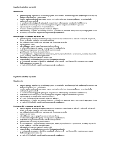 przestrzegamy regulaminu określonego przez przewoźnika oraz bezwzględnie podporządkowujemy się poleceniom kierowcy i opiekunów swoim zachowaniem nie narażamy się na niebezpieczeństwo; nie manipulujemy przy drzwiach, uchwytach, przewodach o wszelkich niepokojących sytuacjach natychmiast informujemy opiekunów lub kierowcę natychmiast informujemy o łamaniu regulaminu przez innych uczestników wycieczki zgłaszamy złe samopoczucie swoje lub innych w czasie podróży przebywamy na własnym miejscu nie śmiecimy, odpadki wyrzucamy do kosza, pod żadnym pozorem nie wyrzucamy niczego przez okno w razie jakichkolwiek wątpliwości zgłaszamy je opiekunom przestrzegamy przepisy ruchu drogowego, zachowujemy ostrożność na ulicach i w innych miejscach, gdzie może nam zagrażać niebezpieczeństwo na szlakach górskich idziemy w grupie, nie zbaczamy ze szlaku zachowujemy ciszę nie oddalamy się od grupy bez zezwolenia opiekuna w schroniskach przestrzegamy wewnętrznych regulaminów natychmiast zgłaszamy chorobę lub złe samopoczucie punktualnie stawiamy się na zbiórkach w razie zgubienia się pozostajemy na miejscu, nawiązujemy kontakt z opiekunem, staramy się ustalić, gdzie jesteśmy, czekamy na opiekunów nie nawiązujemy przygodnych znajomości odpowiednio wcześniej zgłaszamy chęć dokonania zakupów w restauracji, muzeum, w kościele, obiektach zabytkowych – czyli wszędzie -przestrzegamy zasad kulturalnego zachowania się w razie jakichkolwiek wątpliwości zgłaszamy je opiekunom przestrzegamy regulaminu określonego przez przewoźnika oraz bezwzględnie podporządkowujemy się poleceniom kierowcy i opiekunów swoim zachowaniem nie narażamy się na niebezpieczeństwo; nie manipulujemy przy drzwiach, uchwytach, przewodach o wszelkich niepokojących sytuacjach natychmiast informujemy opiekunów lub kierowcę natychmiast informujemy o łamaniu regulaminu przez innych uczestników wycieczki zgłaszamy złe samopoczucie swoje lub innych w czasie podróży przebywamy na własnym miejscu nie śmiecimy, odpadki wyrzucamy do kosza, pod żadnym pozorem nie wyrzucamy niczego przez okno w razie jakichkolwiek wątpliwości zgłaszamy je opiekunom przestrzegamy przepisy ruchu drogowego, zachowujemy ostrożność na ulicach i w innych miejscach, gdzie może nam zagrażać niebezpieczeństwo na szlakach górskich idziemy w grupie, nie zbaczamy ze szlaku zachowujemy ciszę nie oddalamy się od grupy bez zezwolenia opiekuna w schroniskach przestrzegamy wewnętrznych regulaminów natychmiast zgłaszamy chorobę lub złe samopoczucie punktualnie stawiamy się na zbiórkach w razie zgubienia się pozostajemy na miejscu, nawiązujemy kontakt z opiekunem, staramy się ustalić, gdzie jesteśmy, czekamy na opiekunów nie nawiązujemy przygodnych znajomości odpowiednio wcześniej zgłaszamy chęć dokonania zakupów w restauracji, muzeum, w kościele, obiektach zabytkowych – czyli wszędzie -przestrzegamy zasad kulturalnego zachowania się w razie jakichkolwiek wątpliwości zgłaszamy je opiekunom