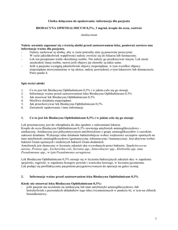 Ulotka dołączona do opakowania: informacja dla pacjenta BIODACYNA OPHTHALMICUM 0,3%, 3 mg/ml, krople do oczu, roztwór Amikacinum Należy uważnie zapoznać się z treścią ulotki przed zastosowaniem leku, ponieważ zawiera ona informacje ważne dla pacjenta. Należy zachować tę ulotkę, aby w razie potrzeby móc ją ponownie przeczytać. W razie jakichkolwiek wątpliwości należy zwrócić się do lekarza lub farmaceuty. Lek ten przepisano ściśle określonej osobie. Nie należy go przekazywać innym. Lek może zaszkodzić innej osobie, nawet jeśli objawy jej choroby są takie same. Jeśli u pacjenta wystąpią jakiekolwiek objawy niepożądane, w tym wszelkie objawy niepożądane niewymienione w tej ulotce, należy powiedzieć o tym lekarzowi lub farmaceucie. Patrz punkt 4. Spis treści ulotki 1. 2. 3. 4. 5. 6. Co to jest lek Biodacyna Ophthalmicum 0,3% i w jakim celu się go stosuje Informacje ważne przed zastosowaniem leku Biodacyna Ophthalmicum 0,3% Jak stosować lek Biodacyna Ophthalmicum 0,3% Możliwe działania niepożądane Jak przechowywać lek Biodacyna Ophthalmicum 0,3% Zawartość opakowania i inne informacje 1. Co to jest lek Biodacyna Ophthalmicum 0,3% i w jakim celu się go stosuje Lek przeznaczony jest do wkraplania do oka zgodnie z zaleceniami lekarza. Krople do oczu Biodacyna Ophthalmicum 0,3% zawierają antybiotyk aminoglikozydowy amikacynę. Amikacyna jest półsyntetycznym antybiotykiem z grupy aminoglikozydów o szerokim zakresie działania. Wykazuje silne działanie bakteriobójcze wobec większości szczepów opornych na inne antybiotyki aminoglikozydowe (gentamycynę, tobramycynę i kanamycynę). Jest aktywna wobec bakterii Gram-ujemnych i niektórych bakterii Gram-dodatnich. Antybiotyk jest skuteczny w leczeniu zakażeń oka wywołanych przez bakterie: Staphylococcus aureus, Proteus spp., Escherichia coli, Serratia spp., Enterobacter spp., Klebsiella spp. oraz Pseudomonas spp., w tym Pseudomonas aeruginosa. Lek Biodacyna Ophthalmicum 0,3% stosuje się w leczeniu bakteryjnych zakażeń oka: w zapaleniu spojówki, rogówki, w zapaleniu brzegów powiek i woreczka łzowego, w leczeniu jęczmienia. Lek podaje się profilaktycznie pacjentom przygotowywanym do operacji na gałce ocznej. 2. Informacje ważne przed zastosowaniem leku Biodacyna Ophthalmicum 0,3% Kiedy nie stosować leku Biodacyna Ophthalmicum 0,3%: - jeśli pacjent ma uczulenie na amikacynę lub inne antybiotyki aminoglikozydowe, lub którykolwiek z pozostałych składników tego leku (wymienionych w punkcie 6), w tym na chlorek benzalkoniowy. 1 Ostrzeżenia i środki ostrożności Przed rozpoczęciem stosowania leku Biodacyna Ophthalmicum 0,3% należy omówić to z lekarzem lub farmaceutą. Jeśli stosowanie leku wywoła niepokojące objawy podrażnienia oka (świąd, pieczenie lub obrzęk powiek), należy natychmiast skontaktować się z lekarzem. Jeżeli kilkudniowe leczenie nie powoduje poprawy, należy skontaktować się z lekarzem. Leku nie stosować dłużej niż zaleca lekarz; po długotrwałym stosowaniu antybiotyku może nastąpić rozwój szczepów opornych i wtórne nadkażenie bakteryjne lub grzybicze. Nie należy dotykać końcówką kroplomierza do powierzchni oka. W przypadku zakażenia oka noszenie soczewek kontaktowych nie jest zalecane. Antybiotyki aminoglikozydowe mogą powodować nieodwracalną, częściową lub całkowitą głuchotę, kiedy podawane są ogólnoustrojowo lub kiedy są stosowane miejscowo na otwarte rany lub uszkodzoną skórę. Ten efekt jest zależny od dawki i zwiększa się w przypadku niewydolności nerek lub wątroby. Lek Biodacyna Ophthalmicum 0,3% a inne leki Należy powiedzieć lekarzowi lub farmaceucie o wszystkich lekach stosowanych przez pacjenta obecnie lub ostatnio, a także o lekach, które pacjent planuje przyjmować. W ciężkich zakażeniach wywołanych przez bakterie Pseudomonas aeruginosa lekarz może zalecić amikacynę w postaci roztworu do wstrzykiwań i inne leki podawane do oka. W przypadku równoczesnego stosowania kropli Biodacyna Ophthalmicum 0,3% i innego preparatu do oczu należy zachować pomiędzy ich podaniami co najmniej kilka minut przerwy, tak aby kropla rozpłynęła się po rogówce w stanie nierozcieńczonym kroplą innego leku. Ciąża i karmienie piersią Jeśli pacjentka jest w ciąży lub karmi piersią, przypuszcza że może być w ciąży lub gdy planuje mieć dziecko, powinna poradzić się lekarza lub farmaceuty przed zastosowaniem tego leku. Prowadzenie pojazdów i obsługiwanie maszyn Objawy choroby oraz wystąpienie działań niepożądanych leku mogą uniemożliwiać prowadzenie pojazdów i obsługiwanie maszyn. Biodacyna Ophthalmicum 0,3% zawiera chlorek benzalkoniowy Lek może powodować podrażnienie oczu. Należy unikać kontaktu leku z miękkimi soczewkami kontaktowymi. Należy usunąć soczewki kontaktowe przed zakropleniem i odczekać co najmniej 15 minut przed ponownym ich nałożeniem. Substancja zmienia zabarwienie soczewek kontaktowych. 3. Jak stosować lek Biodacyna Ophthalmicum 0,3% Ten lek należy zawsze stosować zgodnie z zaleceniami lekarza lub farmaceuty. W razie wątpliwości należy zwrócić się do lekarza lub farmaceuty. Należy wkraplać 1–2 krople leku 3 lub 4 razy na dobę do worka spojówkowego (odchylając lekko dolną powiekę) zwykle przez okres 7 do 10 dni, tak jak zalecił lekarz. Sposób stosowania: 1. Należy umyć ręce i przyjąć wygodną pozycję siedzącą lub stojącą. 2. Odkręcić zakrętkę. 2 3. Nie wolno dotykać końcówką kroplomierza do jakiejkolwiek powierzchni, ponieważ może to spowodować zakażenie kropli. Stosowanie zakażonych kropli może prowadzić do niebezpiecznych powikłań a nawet do utraty wzroku. 4. Ostrożnie odciągnąć czubkiem palca dolną powiekę chorego oka w dół. 5. Trzymać górną część kroplomierza blisko oka, nie dotykając oka. Delikatnie nacisnąć butelkę tak, aby do oka wpadła jedna kropla. Należy upewnić się, że 