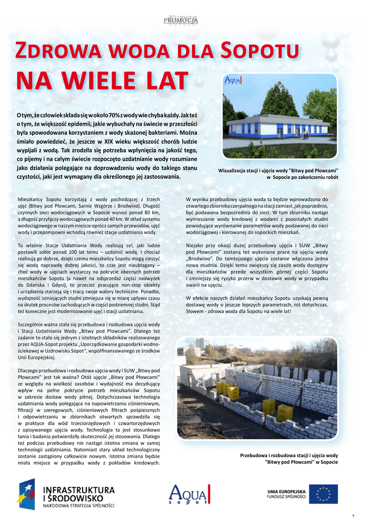 promocja Zdrowa woda dla Sopotu na wiele lat O tym, że człowiek składa się w około 70% z wody wie chyba każdy. Jak też o tym, że większość epidemii, jakie wybuchały na świecie w przeszłości była spowodowana korzystaniem z wody skażonej bakteriami. Można śmiało powiedzieć, że jeszcze w XIX wieku większość chorób ludzie wypijali z wodą. Tak zrodziła się potrzeba wpłynięcia na jakość tego, co pijemy i na całym świecie rozpoczęto uzdatnianie wody rozumiane jako działania polegające na doprowadzeniu wody do takiego stanu czystości, jaki jest wymagany dla określonego jej zastosowania. Mieszkańcy Sopotu korzystają z wody pochodzącej z trzech ujęć (Bitwy pod Płowcami, Sarnie Wzgórze i Brodwino). Długość czynnych sieci wodociągowych w Sopocie wynosi ponad 80 km, a długość przyłączy wodociągowych ponad 40 km. W skład systemu wodociągowego w naszym mieście oprócz samych przewodów, ujęć wody i przepompowni wchodzą również stacje uzdatniania wody. To właśnie Stacje Uzdatniania Wody realizują cel, jaki ludzie postawili sobie ponad 100 lat temu – uzdatnić wodę. I chociaż realizują go dobrze, dzięki czemu mieszkańcy Sopotu mogą cieszyć się wodą naprawdę dobrej jakości, to czas jest nieubłagany – choć wody w ujęciach wystarczy na pokrycie obecnych potrzeb mieszkańców Sopotu (a nawet na odsprzedaż części nadwyżek do Gdańska i Gdyni), to przecież pracujące non-stop obiekty i urządzenia starzeją się i tracą swoje walory techniczne. Ponadto, wydajność istniejących studni zmniejsza się w miarę upływu czasu na skutek procesów zachodzących w części podziemnej studni. Stąd też konieczne jest modernizowanie ujęć i stacji uzdatniania. Wizualizacja stacji i ujęcia wody "Bitwy pod Płowcami" w Sopocie po zakończeniu robót W wyniku przebudowy ujęcia woda ta będzie wprowadzona do otwartego zbiornika czerpalnego na stacji zamiast, jak poprzednio, być podawana bezpośrednio do sieci. W tym zbiorniku nastąpi wymieszanie wody kredowej z wodami z pozostałych studni powodujące wyrównanie parametrów wody podawanej do sieci wodociągowej i kierowanej do sopockich mieszkań. Niejako przy okazji dużej przebudowy ujęcia i SUW „Bitwy pod Płowcami” zostaną też wykonane prace na ujęciu wody „Brodwino”. Do tamtejszego ujęcia zostanie włączona jedna nowa studnia. Dzięki temu zwiększy się zasób wody dostępny dla mieszkańców przede wszystkim górnej części Sopotu i zmniejszy się ryzyko przerw w dostawie wody w przypadku awarii na ujęciu. W efekcie naszych działań mieszkańcy Sopotu uzyskają pewną dostawę wody o jeszcze lepszych parametrach, niż dotychczas. Słowem - zdrowa woda dla Sopotu na wiele lat! Szczególnie ważna stała się przebudowa i rozbudowa ujęcia wody i Stacji Uzdatniania Wody „Bitwy pod Płowcami”. Dlatego też zadanie to stało się jednym z istotnych składników realizowanego przez AQUA-Sopot projektu „Uporządkowanie gospodarki wodnościekowej w Uzdrowisku Sopot”, współfinansowanego ze środków Unii Europejskiej. Dlaczego przebudowa i rozbudowa ujęcia wody i SUW „Bitwy pod Płowcami” jest tak ważna? Otóż ujęcie „Bitwy pod Płowcami” ze względu na wielkość zasobów i wydajność ma decydujący wpływ na pełne pokrycie potrzeb mieszkańców Sopotu w zakresie dostaw wody pitnej. Dotychczasowa technologia uzdatniania wody polegająca na napowietrzaniu ciśnieniowym, filtracji w szeregowych, ciśnieniowych filtrach pośpiesznych i odpowietrzaniu w zbiornikach otwartych sprawdziła się w praktyce dla wód trzeciorzędowych i czwartorzędowych z opisywanego ujęcia wody. Technologia ta jest stosunkowo tania i badania potwierdziły skuteczność jej stosowania. Dlatego też podczas przebudowy nie nastąpi istotna zmiana w samej technologii uzdatniania. Natomiast stary układ technologiczny zostanie zastąpiony całkowicie nowym. Istotna zmiana będzie miała miejsce w przypadku wody z pokładów kredowych. Kuryer Sopocki Przebudowa i rozbudowa stacji i ujęcia wody "Bitwy pod Płowcami" w Sopocie 9