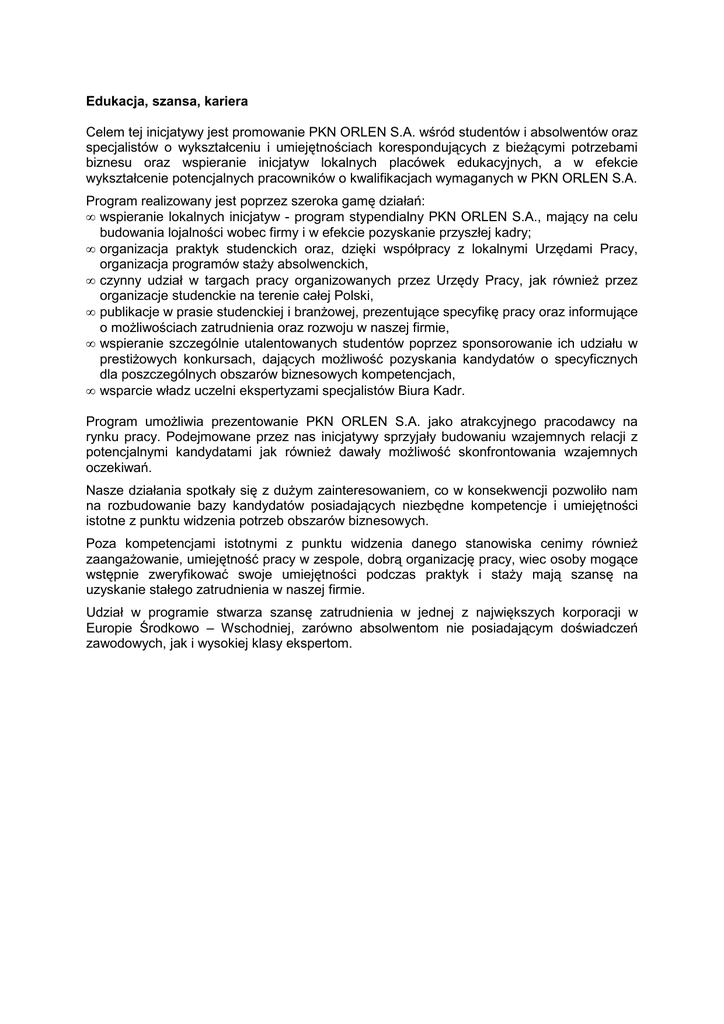 Edukacja, szansa, kariera Celem tej inicjatywy jest promowanie PKN ORLEN S.A. wśród studentów i absolwentów oraz specjalistów o wykształceniu i umiejętnościach korespondujących z bieŜącymi potrzebami biznesu oraz wspieranie inicjatyw lokalnych placówek edukacyjnych, a w efekcie wykształcenie potencjalnych pracowników o kwalifikacjach wymaganych w PKN ORLEN S.A. Program realizowany jest poprzez szeroka gamę działań: • wspieranie lokalnych inicjatyw - program stypendialny PKN ORLEN S.A., mający na celu budowania lojalności wobec firmy i w efekcie pozyskanie przyszłej kadry; • organizacja praktyk studenckich oraz, dzięki współpracy z lokalnymi Urzędami Pracy, organizacja programów staŜy absolwenckich, • czynny udział w targach pracy organizowanych przez Urzędy Pracy, jak równieŜ przez organizacje studenckie na terenie całej Polski, • publikacje w prasie studenckiej i branŜowej, prezentujące specyfikę pracy oraz informujące o moŜliwościach zatrudnienia oraz rozwoju w naszej firmie, • wspieranie szczególnie utalentowanych studentów poprzez sponsorowanie ich udziału w prestiŜowych konkursach, dających moŜliwość pozyskania kandydatów o specyficznych dla poszczególnych obszarów biznesowych kompetencjach, • wsparcie władz uczelni ekspertyzami specjalistów Biura Kadr. Program umoŜliwia prezentowanie PKN ORLEN S.A. jako atrakcyjnego pracodawcy na rynku pracy. Podejmowane przez nas inicjatywy sprzyjały budowaniu wzajemnych relacji z potencjalnymi kandydatami jak równieŜ dawały moŜliwość skonfrontowania wzajemnych oczekiwań. Nasze działania spotkały się z duŜym zainteresowaniem, co w konsekwencji pozwoliło nam na rozbudowanie bazy kandydatów posiadających niezbędne kompetencje i umiejętności istotne z punktu widzenia potrzeb obszarów biznesowych. Poza kompetencjami istotnymi z punktu widzenia danego stanowiska cenimy równieŜ zaangaŜowanie, umiejętność pracy w zespole, dobrą organizację pracy, wiec osoby mogące wstępnie zweryfikować swoje umiejętności podczas praktyk i staŜy mają szansę na uzyskanie stałego zatrudnienia w naszej firmie. Udział w programie stwarza szansę zatrudnienia w jednej z największych korporacji w Europie Środkowo – Wschodniej, zarówno absolwentom nie posiadającym doświadczeń zawodowych, jak i wysokiej klasy ekspertom.