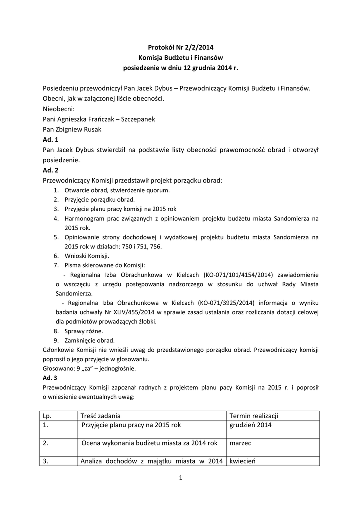Protokół Nr 2/2/2014 Komisja Budżetu i Finansów posiedzenie w dniu 12 grudnia 2014 r. Posiedzeniu przewodniczył Pan Jacek Dybus – Przewodniczący Komisji Budżetu i Finansów. Obecni, jak w załączonej liście obecności. Nieobecni: Pani Agnieszka Frańczak – Szczepanek Pan Zbigniew Rusak Ad. 1 Pan Jacek Dybus stwierdził na podstawie listy obecności prawomocność obrad i otworzył posiedzenie. Ad. 2 Przewodniczący Komisji przedstawił projekt porządku obrad: 1. 2. 3. 4. Otwarcie obrad, stwierdzenie quorum. Przyjęcie porządku obrad. Przyjęcie planu pracy komisji na 2015 rok Harmonogram prac związanych z opiniowaniem projektu budżetu miasta Sandomierza na 2015 rok. 5. Opiniowanie strony dochodowej i wydatkowej projektu budżetu miasta Sandomierza na 2015 rok w działach: 750 i 751, 756. 6. Wnioski Komisji. 7. Pisma skierowane do Komisji: - Regionalna Izba Obrachunkowa w Kielcach (KO-071/101/4154/2014) zawiadomienie o wszczęciu z urzędu postępowania nadzorczego w stosunku do uchwał Rady Miasta Sandomierza. - Regionalna Izba Obrachunkowa w Kielcach (KO-071/3925/2014) informacja o wyniku badania uchwały Nr XLIV/455/2014 w sprawie zasad ustalania oraz rozliczania dotacji celowej dla podmiotów prowadzących żłobki. 8. Sprawy różne. 9. Zamknięcie obrad. Członkowie Komisji nie wnieśli uwag do przedstawionego porządku obrad. Przewodniczący komisji poprosił o jego przyjęcie w głosowaniu. Głosowano: 9 „za” – jednogłośnie. Ad. 3 Przewodniczący Komisji zapoznał radnych z projektem planu pacy Komisji na 2015 r. i poprosił o wniesienie ewentualnych uwag: Lp. 1. Treść zadania Przyjęcie planu pracy na 2015 rok Termin realizacji grudzień 2014 2. Ocena wykonania budżetu miasta za 2014 rok marzec 3. Analiza dochodów z majątku miasta w 2014 kwiecień 1 4. 6. 7. 9. 10. 11. 12. 13. roku Ocena ściągalności podatków. Informacja o umorzeniach z tytułu podatków i opłat w 2014 roku Informacja o stanie wykonania dochodów i wydatków za I półrocze 2015 roku. Informacja o stanie zobowiązań finansowych miasta w 2015 roku Analiza i opiniowanie stawek opłat lokalnych Opiniowanie projektu budżetu miasta na 2016 rok oraz Wieloletniej Prognozy Finansowej Gminy Sandomierz Opracowanie sprawozdania z prac Komisji w 2015 roku Opiniowanie projektów uchwał związanych z gospodarką finansową miasta. Rozpatrywanie spraw kierowanych do Komisji przez Przewodniczącego Rady Miasta maj/czerwiec lipiec sierpień na bieżąco grudzień grudzień na bieżąco na bieżąco Radni nie wnieśli uwag. Przyjęli przedstawiony wyżej plan pracy Komisji Budżetu i Finansów na 2015 rok przez aklamację. Ad. 4 Pan Jacek Dybus przedstawił w skrócie procedurę uchwalania budżetu miasta Sandomierza zgodnie z przyjętą uchwałą Rady Miasta Sandomierza (Uchwała Nr LII/421/2010 z dnia 28 lipca 2010 r. w sprawie procedury uchwalania budżetu oraz rodzajów i szczegółowości materiałów informacyjnych towarzyszących projektowi budżetu miasta Sandomierza). Przewodniczący obrad zasugerował ostateczny termin – 20 grudnia br. - na opracowanie opinii i wniosków do projektu budżetu przez wszystkie komisje stałe. Do dnia 22 grudnia br. Komisja Budżetu i Finansów odbędzie posiedzenie podsumowujące, przeanalizuje przedstawione opinie i wnioski. Radni przyjęli powyższe propozycje bez uwag. Przewodniczący poszczególnych komisji ustalili terminy posiedzeń swoich komisji. Ad. 5 Pan Jacek Dybus przypomniał, że Komisja Budżetu i Finansów opiniuje działy: 750 – Administracja publiczna, 751 – Urzędy naczelnych organów władzy państwowej, kontroli i ochrony prawa oraz sądownictwa, 756 – dochody od osób prawnych, od osób fizycznych i od innych jednostek nie posiadających osobowości prawnej. Przewodniczący komisji poprosił obecnego na posiedzeniu Pana Cezarego Gradzińskiego – Skarbnika Miasta o przedstawienie radnym projektu uchwały budżetowej oraz udzielanie odpowiedzi radnym zabierającym głos w dyskusji. Mówca wskazał, między innymi że: „projekt budżetu miasta zakłada dochody w kwocie 89 421 961,00zł natomiast wydatki w wysokości 89 443 476,00 zł. Deficyt budżetu miasta w wysokości 21.515,00 zł. Zadłużenie miasta wynosi 37 000 000,00 zł co stanowi około 40% budżetu” 2 Członkowie komisji omówili dane Działu 750, 751, 756 po stronie dochodowej i wydatkowej – Załączniki Nr 1 i 2 projektu. Radni nie wnieśli uwag do tej części projektu budżetu. Pan Jacek Dybus poprosił o wyrażenie pozytywnej opinii do projektu uchwały budżetowej na 2015 rok i zapytał kto jest „za”? Głosowano: 9 „za” – jednogłośnie – opinia pozytywna. Ad. 6 Komisja nie opracowała wniosków. Ad. 7 Komisja zapoznała się z treścią pism: 1. Regionalnej Izby Obrachunkowej w Kielcach (znak: KO-071/101/4154/2014) zawiadomienie o wszczęciu z urzędu postępowania nadzorczego w stosunku do następujących uchwał Rady Miasta Sandomierza: - Nr XLV/452/2014 z dn. 12.11.2014 r. w sprawie zmiany WPF Gminy Sandomierz na lata 2014-2026, - Nr XLV/450/2014 z dn. 12.11.2014 r. w sprawie zmiany w budżecie miasta na 2014 rok, - Nr XLV/450/2014 z dn. 12.11.2014 r. w sprawie emisji obligacji komunalnych oraz określenia zasad ich zbywania, nabywania i wykupu. 2. Regionalnej Izby Obrachunkowej w Kielcach ( znak: KO-071/3925/2014) informacja o wyniku badania uchwały Nr XLIV/455/2014 w sprawie zasad ustalania oraz rozliczania dotacji celowej dla podmiotów prowadzących żłobki. Uchwała jest legalna. Ad. 8 Członkowie Komisji nie zgłosili uwag. Ad. 9 Pan Jacek Dybus stwierdził wyczerpanie porządku obrad i zamknął posiedzenie. Jacek Dybus Przewodniczący Komisji Budżetu i Finansów Protokołowała: Renata Tkacz 3