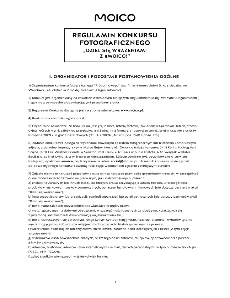 REGULAMIN KONKURSU FOTOGRAFICZNEGO ,,DZIEL SIĘ WRAŻENIAMI Z #MOICO!” I. ORGANIZATOR I POZOSTAŁE POSTANOWIENIA OGÓLNE 1) Organizatorem konkursu fotograficznego ”Próbuj nowego” jest firma Internet Union S. A. z siedzibą we Wrocławiu, ul. Złotnicka 28 (dalej zwanym: „Organizatorem”). 2) Konkurs jest organizowany na zasadach określonych niniejszym Regulaminem (dalej zwanym: „Regulaminem”) i zgodnie z powszechnie obowiązującymi przepisami prawa. 3) Regulamin Konkursu dostępny jest na stronie internetowej www.moico.pl. 4) Konkurs ma charakter ogólnopolski. 5) Organizator oświadcza, że Konkurs nie jest grą losową, loterią fantową, zakładem wzajemnym, loterią promocyjną, których wynik zależy od przypadku, ani żadną inną formą gry losowej przewidzianej w ustawie z dnia 19 listopada 2009 r. o grach hazardowych (Dz. U. z 2009r., Nr 201, poz. 1540 z późn. zm.). 6) Zadanie konkursowe polega na wykonaniu dowolnym aparatem fotograficznym lub telefonem komórkowym zdjęcia, z dowolnej imprezy z cyklu Moico Enjoy Music #3. Do cyklu należą koncerty: 24.11 Kari w Klubogalerii Szajba, 27.11 Fair Weather Friends w Sanatorium Kultury, 4.12 Coals w pubie Nietota, 6.12 Swayzak w klubie BauBar oraz finał cyklu 13.12 w Browarze Mieszczańskim. Zdjęcie powinno być opublikowane w serwisie Instagram, opatrzone #moico, bądź wysłane na adres [email protected]. Uczestnik konkursu może zgłosić do poszczególnego konkursu dowolną ilość zdjęć wykonanych zgodnie z niniejszym punktem. 7) Zdjęcie nie może naruszać przepisów prawa ani też naruszać praw osób (podmiotów) trzecich, w szczególności nie może zawierać zarówno na pierwszym, jak i dalszych (innych) planach: a) znaków towarowych lub innych treści, do których prawa przysługują osobom trzecim, w szczególności produktów markowych, znaków promocyjnych, oznaczeń handlowych i firmowych (nie dotyczy partnerów akcji ”Dziel się wrażeniami”), b) loga przedsiębiorstw lub organizacji, symboli organizacji lub partii politycznych (nie dotyczy partnerów akcji ”Dziel się wrażeniami”), c) treści naruszających powszechnie obowiązujące przepisy prawa, d) treści sprzecznych z dobrymi obyczajami, w szczególności uznanych za obelżywe, kojarzących się z przemocą, rasizmem lub dyskryminacją na jakimkolwiek tle, e) treści odnoszących się do polityki, religii (w tym symboli religijnych), hazardu, alkoholu, wyrobów tytoniowych, mogących urazić uczucia religijne lub dotyczących działań sprzecznych z prawem, f) wizerunków osób nagich lub częściowo rozebranych, zarówno osób dorosłych jak i dzieci (w tym zdjęć artystycznych), g) wizerunków osób powszechnie znanych, w szczególności aktorów, muzyków, sportowców oraz postaci z filmów animowanych, h) adresów, telefonów, adresów stron internetowych i e-mail, danych personalnych, w tym numerów takich jak PESEL, NIP, REGON, i) zdjęć środków pieniężnych w jakiejkolwiek formie. 1 REGULAMIN KONKURSU FOTOGRAFICZNEGO ,,DZIEL SIĘ WRAŻENIAMI Z #MOICO!” II. UCZESTNICY KONKURSU 1) W Konkursie może wziąć udział każda osoba, która w czasie trwania konkursu wyśle fotografię zgodną z tematyką konkursu. W Konkursie mogą wziąć udział zarówno osoby zajmujące się fotografią amatorsko, jak i zawodowo (dalej zwany: „Uczestnikiem”). 2) W konkursie może wziąć udział każda osoba fizyczna, która łącznie: a) posiada miejsce zamieszkania na terenie Polski, b) posiada autorskie prawa majątkowe do zgłoszonego zdjęcia wykonanego przez siebie dowolnym aparatem fotograficznym lub dowolnym telefonem komórkowym. 3) Warunkiem uczestnictwa w Konkursie jest wysłanie fotografii na adres [email protected]. na adres [email protected], lub opublikowanie jej w serwisie Instagram z oznaczeniem #moico. III. WARUNKI PRZYSTĄPIENIA DO KONKURSU, TERMINARZ 1) Konkurs trwa od 24 listopada do 15 grudnia 2014 r. 2) Warunkiem uczestnictwa w Konkursie jest: a) opublikowanie bądź przesłanie fotografii zgodnej z tematyką konkursu, podczas jego trwania; b) zaakceptowanie warunków uczestnictwa w Konkursie. 3) W Konkursie wezmą udział prace fotograficzne, które w terminie wskazanym w Regulaminie zostaną przesłane do Organizatora, tj. najpóźniej do 15 grudnia 2014 roku (włącznie) znajdą się w posiadaniu Organizatora. 4) Przesłanie zdjęć możliwe jest poprzez serwisy Instagram oraz Facebook (konieczne opatrzenie zdjęcia #moico), bądź drogą mailową na adres [email protected] 5) Poprzez opublikowanie lub przesłanie zdjęcia (lub zdjęć) na Konkurs, Uczestnik potwierdza, że zapoznał się z Regulaminem oraz akceptuje jego postanowienia. 6) Post zgłoszeniowy do konkursu powinien: a) zawierać zdjęcie (do którego autorskie prawa osobiste oraz majątkowe winny przysługiwać Uczestnikowi), b) oznaczenie #moico aby ułatwić odnalezienie zdjęcia przez Organizatora, c) być opublikowany (i upubliczniony) na serwisasch Instagram lub Facebook, d) aby ułatwić Organizatorowi znalezienie zdjęcia można wysłać link w prywatnej wiadomości w serwisie Facebook na www.facebook.pl/moico_enjoy. 7) Mail zgłoszeniowy do konkursu powinien zawierać następujące dane: a) imię i nazwisko, b) adres zamieszkania i nr telefonu, c) adres e-mail, d) zdjęcie/zdjęcia (do którego autorskie prawa osobiste oraz majątkowe winny przysługiwać Uczestnikowi), 2 REGULAMIN KONKURSU FOTOGRAFICZNEGO ,,DZIEL SIĘ WRAŻENIAMI Z #MOICO!” 8) Zgłoszenie udziału w konkursie oznacza, że Uczestnik zapoznał się z jego zasadami i je akceptuje. 9) Poprzez przesłanie prac konkursowych Uczestnik wyraża zgodę na zamieszczenie zdjęcia/zdjęć na stronie internetowej www.moico.pl i w aplikacji w serwisie społecznościowym Facebook pod adresem www.facebook.com/EnjoyMoico 10) Poprzez przesłanie prac konkursowych Uczestnicy konkursu upoważniają Organizatora (udzielają licencji) na zasadzie wyłączności, do nieodpłatnego korzysta