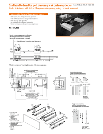 Szuflada Modern Box pod zlewozmywak (pełne wycięcie) Index: PB-D-ZLE-450, PB-D-ZLE-500 Under sink drawer with full cut / Выдвижной ящик под мойку с полной выемкой Cechy produktu / Features / Характеристика товара: • Pełny wysuw / Full sliding / Полное выдвижение • Cichy domyk / Quiet shut / Бесшумное закрывание • Pełna regulacja (pion i poziom) Full adjustment (vertically and horizontally) Полное регулирование (по диагонали и вертикали) NL=450, 500 Pozycje mocowania prowadnic w korpusie Mounting positions in the drawer body Крепление направляющих к корпусу Krawędź korpusu / Drawer body edge / Края корпуса 9 9 37 32 9 NL 9 9 9 32 9 9 450 500 37 128 224 9 Wymiary dna i tyłu szuflady Drawers bottom and back dimensions Размеры дна и задней стенки ящика F E 16 NL-24 9 16 min 33 15.5 42.5 J=D-55 H=C-55 G=LW-31-C-D Szerokość panelu dolnego = LW-86 Bottom panel width = LW-86 ширина нижней панели = LW-86 Szerokość zewnętrzna korpusu External body width внешняя ширина корпуса NL-24 32 20 32 Panel tylny / Back panel / Задняя стенка 16 47.5 93.5 84 min 63.5 (min 103.5) Szerokość wewnętrzna korpusu Drawer body width внутренняя ширина корпуса D=J+55 C=H+55 E=H-11 F=J-11 84 Dla szuflady wewnętrznej For internal drawer Для внутреннего ящика Wymiary montażowe / mounting dimensions / Монтажные размеры Panel dolny Bottom panel Нижняя панель Pozycje mocowania frontu Mounting positions front panel Позиции крепления фасадной части 2- 2 32 min 47.5 1. Prowadnice L/P Slides L/R Направляющие Л/П 2. Zaślepki L/P Plugs L/R Заглушки Л-П 3. Złączki tylne L/P Back connectors L/R Фронтовые соединители Л-П 4. Mocowania frontu Front mounting Крепления фасадной части 5. Boki L/P Sides L/R Бока Л-П or 10 12 Panel frontowy Front panel Фасадная панель