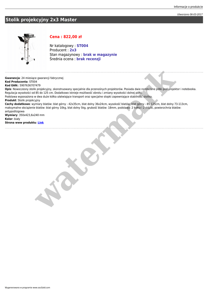 Informacje o produkcie Utworzono 06-03-2017 Stolik projekcyjny 2x3 Master Cena : 822,00 zł Nr katalogowy : ST004 Producent : 2x3 Stan magazynowy : brak w magazynie Średnia ocena : brak recenzji w at er m ar k Gwarancja: 24 miesiące gwarancji fabrycznej Kod Producenta: ST004 Kod EAN:: 5907636707479 Opis: Nowoczesny stolik projekcyjny, skonstruowany specjalnie dla przenośnych projektorów. Posiada dwie rozkładane półki pod projektor i notebooka. Regulacja wysokości od 85 do 125 cm. Dodatkowo istnieje możliwość obrotu i zmiany wysokości dolnej półki. Podstawa wyposażona w dwa duże kółka ułatwiające transport oraz specjalne stopki zapewniające stabilność stolika. Produkt: Stolik projekcyjny Cechy dodatkowe: wymiary blatów: blat górny - 42x35cm, blat dolny 36x24cm, wysokość blatów: blat górny - 85-125cm, blat dolny 73-113cm, maksymalne obciążenie blatów: blat górny 10kg, blat dolny 5kg, grubość blatów: 18mm, podstawa: 2 kółka i 2 stópki, powierzchnia blatów: antypoślizgowa Wymiary: 350x423,6x240 mm Kolor: biały Strona www produktu: Link Wygenerowano w programie www.oscGold.com