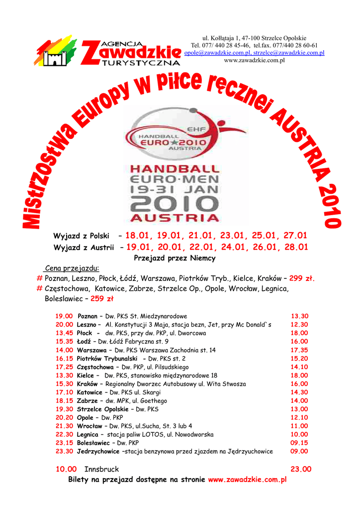 ul. Kołłątaja 1, 47-100 Strzelce Opolskie Tel. 077/ 440 28 45-46, tel.fax. 077/440 28 60-61 [email protected], [email protected] www.zawadzkie.com.pl Wyjazd z Polski – 18.01, 19.01, 21.01, 23.01, 25.01, 27.01 Wyjazd z Austrii – 19.01, 20.01, 22.01, 24.01, 26.01, 28.01 Przejazd przez Niemcy Cena przejazdu: # Poznan, Leszno, Płock, Łódź, Warszawa, Piotrków Tryb., Kielce, Kraków – 299 zł. # Częstochowa, Katowice, Zabrze, Strzelce Op., Opole, Wrocław, Legnica, Boleslawiec – 259 zł 19.00 20.00 13.45 15.35 14.00 16.15 17.25 13.30 15.30 17.10 18.15 19.30 20.20 21.30 22.30 23.15 23.30 Poznan – Dw. PKS St. Miedzynarodowe Leszno – Al. Konstytucji 3 Maja, stacja bezn, Jet, przy Mc Donald`s Płock - dw. PKS, przy dw. PKP, ul. Dworcowa Łodź – Dw. Łódź Fabryczna st. 9 Warszawa – Dw. PKS Warszawa Zachodnia st. 14 Piotrków Trybunalski - Dw. PKS st. 2 Częstochowa – Dw. PKP, ul. Pilsudskiego Kielce – Dw. PKS, stanowisko międzynarodowe 18 Kraków – Regionalny Dworzec Autobusowy ul. Wita Stwosza Katowice – Dw. PKS ul. Skargi Zabrze – dw. MPK, ul. Goethego Strzelce Opolskie – Dw. PKS Opole – Dw. PKP Wrocław – Dw. PKS, ul.Sucha, St. 3 lub 4 Legnica – stacja paliw LOTOS, ul. Nowodworska Bolesławiec – Dw. PKP Jedrzychowice –stacja benzynowa przed zjazdem na Jędrzyuchowice 13.30 12.30 18.00 16.00 17.35 15.20 14.10 18.00 16.00 14.30 14.00 13.00 12.10 11.00 10.00 09.15 09.00 10.00 Innsbruck 23.00 Bilety na przejazd dostępne na stronie www.zawadzkie.com.pl
