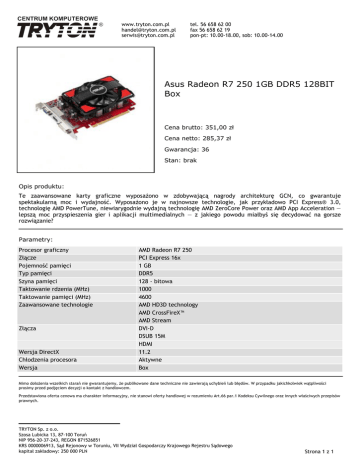 www.tryton.com.pl [email protected] [email protected] tel. 56 658 62 00 fax 56 658 62 19 pon-pt: 10.00-18.00, sob: 10.00-14.00 Asus Radeon R7 250 1GB DDR5 128BIT Box Cena brutto: 351,00 zł Cena netto: 285,37 zł Gwarancja: 36 Stan: brak Opis produktu: Te zaawansowane karty graficzne wyposażono w zdobywającą nagrody architekturę GCN, co gwarantuje spektakularną moc i wydajność. Wyposażono je w najnowsze technologie, jak przykładowo PCI Express® 3.0, technologię AMD PowerTune, niewiarygodnie wydajną technologię AMD ZeroCore Power oraz AMD App Acceleration — lepszą moc przyspieszenia gier i aplikacji multimedialnych — z jakiego powodu miałbyś się decydować na gorsze rozwiązanie? Parametry: Procesor graficzny Złącze Pojemność pamięci Typ pamięci Szyna pamięci Taktowanie rdzenia (MHz) Taktowanie pamięci (MHz) Zaawansowane technologie Złącza Wersja DirectX Chłodzenia procesora Wersja AMD Radeon R7 250 PCI Express 16x 1 GB DDR5 128 - bitowa 1000 4600 AMD HD3D technology AMD CrossFireX™ AMD Stream DVI-D DSUB 15M HDMI 11.2 Aktywne Box Mimo dołożenia wszelkich starań nie gwarantujemy, że publikowane dane techniczne nie zawierają uchybień lub błędów. W przypadku jakichkolwiek wątpliwości prosimy przed podjęciem decyzji o kontakt z handlowcem. Przedstawiona oferta cenowa ma charakter informacyjny, nie stanowi oferty handlowej w rozumieniu Art.66 par.1 Kodeksu Cywilnego oraz innych właściwych przepisów prawnych. TRYTON Sp. z o.o. Szosa Lubicka 13, 87-100 Toruń NIP 956-20-37-243, REGON 871526851 KRS 0000006913, Sąd Rejonowy w Toruniu, VII Wydział Gospodarczy Krajowego Rejestru Sądowego kapitał zakładowy: 250 000 PLN Strona 1 z 1