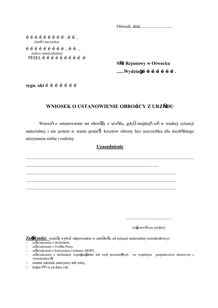 Otwock, dnia............................. ………………………..…….. (imię i nazwisko) ………………………...…….. (adres zamieszkania) PESEL ……………………….… Sąd Rejonowy w Otwocku ......Wydział …………………. sygn. akt ………………… WNIOSEK O USTANOWIENIE OBROŃCY Z URZĘDU Wnoszę o ustanowienie mi obrońcy z urzędu, gdyż znajduję się w trudnej sytuacji materialnej i nie jestem w stanie ponieść kosztów obrony bez uszczerbku dla niezbędnego utrzymania siebie i rodziny. Uzasadnienie ......................................................................................................................................................... ......................................................................................................................... ......................................................................................................................................... ......................................................................................................................................... ......................................................................................................................................... ......................................... (własnoręczny podpis) Załączniki: (należy wybrać odpowiednie w zależności od sytuacji materialnej wnioskodawcy) - - zaświadczenie o dochodach, zaświadczenie z Urzędu Pracy, zaświadczenie o korzystaniu z pomocy MOPS, zaświadczenie o dochodach współmałżonka lub osób pozostających wnioskodawcą, ostatni odcinek emerytury lub renty, kopia PIT-u za dany rok. we wspólnym gospodarstwie domowym z