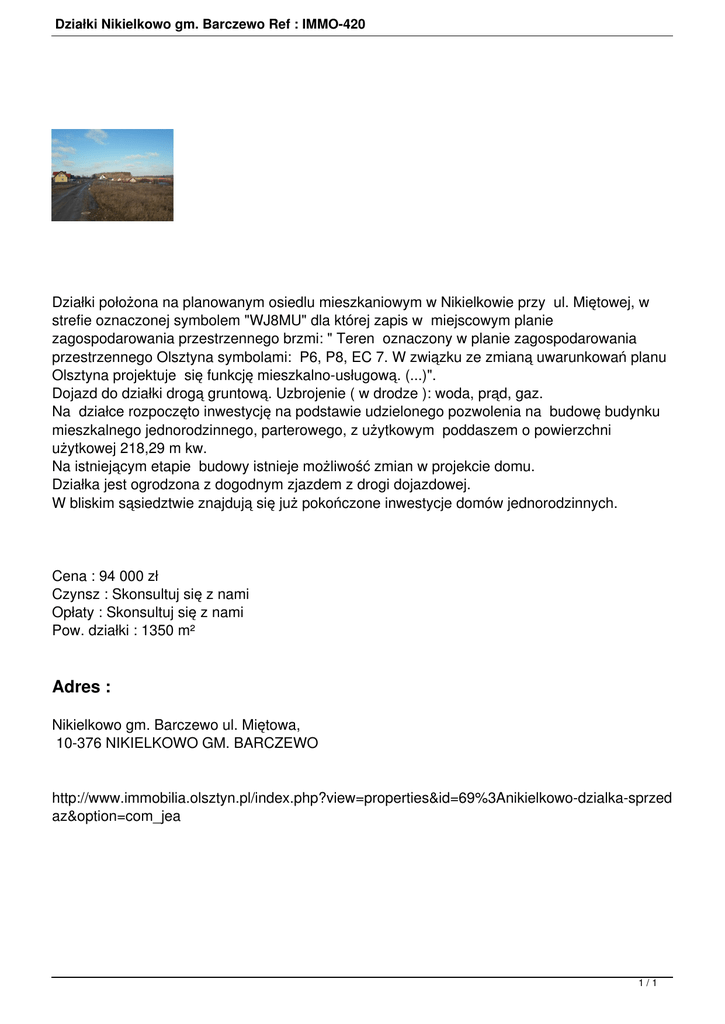 Działki Nikielkowo gm. Barczewo Ref : IMMO-420 Działki położona na planowanym osiedlu mieszkaniowym w Nikielkowie przy ul. Miętowej, w strefie oznaczonej symbolem "WJ8MU" dla której zapis w miejscowym planie zagospodarowania przestrzennego brzmi: " Teren oznaczony w planie zagospodarowania przestrzennego Olsztyna symbolami: P6, P8, EC 7. W związku ze zmianą uwarunkowań planu Olsztyna projektuje się funkcję mieszkalno-usługową. (...)". Dojazd do działki drogą gruntową. Uzbrojenie ( w drodze ): woda, prąd, gaz. Na działce rozpoczęto inwestycję na podstawie udzielonego pozwolenia na budowę budynku mieszkalnego jednorodzinnego, parterowego, z użytkowym poddaszem o powierzchni użytkowej 218,29 m kw. Na istniejącym etapie budowy istnieje możliwość zmian w projekcie domu. Działka jest ogrodzona z dogodnym zjazdem z drogi dojazdowej. W bliskim sąsiedztwie znajdują się już pokończone inwestycje domów jednorodzinnych. Cena : 94 000 zł Czynsz : Skonsultuj się z nami Opłaty : Skonsultuj się z nami Pow. działki : 1350 m² Adres : Nikielkowo gm. Barczewo ul. Miętowa, 10-376 NIKIELKOWO GM. BARCZEWO http://www.immobilia.olsztyn.pl/index.php?view=properties&id=69%3Anikielkowo-dzialka-sprzed az&option=com_jea 1/1