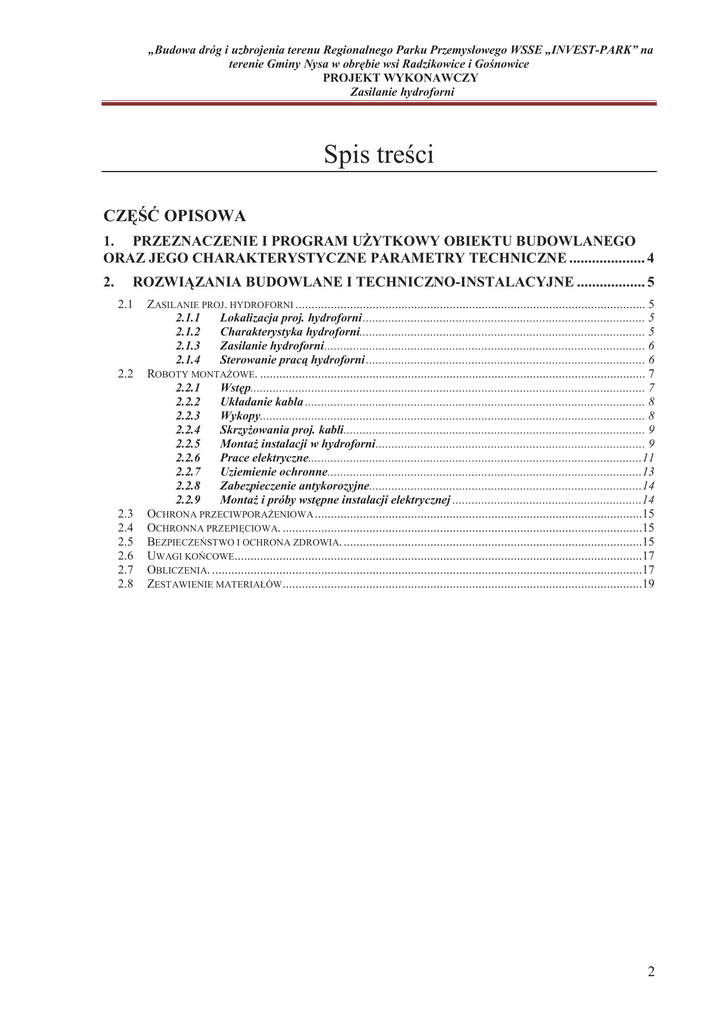 „Budowa dróg i uzbrojenia terenu Regionalnego Parku Przemysłowego WSSE „INVEST-PARK” na terenie Gminy Nysa w obrębie wsi Radzikowice i Gośnowice PROJEKT WYKONAWCZY Zasilanie hydroforni Spis treści CZĘŚĆ OPISOWA 1. PRZEZNACZENIE I PROGRAM UśYTKOWY OBIEKTU BUDOWLANEGO ORAZ JEGO CHARAKTERYSTYCZNE PARAMETRY TECHNICZNE .................... 4 2. ROZWIĄZANIA BUDOWLANE I TECHNICZNO-INSTALACYJNE .................. 5 2.1 2.2 2.3 2.4 2.5 2.6 2.7 2.8 ZASILANIE PROJ. HYDROFORNI ............................................................................................................. 5 2.1.1 Lokalizacja proj. hydroforni ........................................................................................ 5 2.1.2 Charakterystyka hydroforni......................................................................................... 5 2.1.3 Zasilanie hydroforni .................................................................................................... 6 2.1.4 Sterowanie pracą hydroforni ....................................................................................... 6 ROBOTY MONTAśOWE. ........................................................................................................................ 7 2.2.1 Wstęp........................................................................................................................... 7 2.2.2 Układanie kabla .......................................................................................................... 8 2.2.3 Wykopy........................................................................................................................ 8 2.2.4 SkrzyŜowania proj. kabli.............................................................................................. 9 2.2.5 MontaŜ instalacji w hydroforni .................................................................................... 9 2.2.6 Prace elektryczne........................................................................................................11 2.2.7 Uziemienie ochronne..................................................................................................13 2.2.8 Zabezpieczenie antykorozyjne.....................................................................................14 2.2.9 MontaŜ i próby wstępne instalacji elektrycznej ...........................................................14 OCHRONA PRZECIWPORAśENIOWA ......................................................................................................15 OCHRONNA PRZEPIĘCIOWA. ................................................................................................................15 BEZPIECZEŃSTWO I OCHRONA ZDROWIA. .............................................................................................15 UWAGI KOŃCOWE...............................................................................................................................17 OBLICZENIA. ......................................................................................................................................17 ZESTAWIENIE MATERIAŁÓW ................................................................................................................19 2 „Budowa dróg i uzbrojenia terenu Regionalnego Parku Przemysłowego WSSE „INVEST-PARK” na terenie Gminy Nysa w obrębie wsi Radzikowice i Gośnowice PROJEKT WYKONAWCZY Zasilanie hydroforni CZĘŚĆ GRAFICZNA Rys. nr: 1.1-1.2 E Rys. nr: 2 E Rys. nr: 3 E Rys. nr: 4 E Rys. nr: 5 E Rys. nr: 6 E Rys. nr: 7 E PZT – Zasilanie hydroforni Schemat ideowy zasilania hydroforni Zasilanie hydroforni Schemat instalacji elektrycznej w hydroforni Przekroje poprzeczne skrzyŜowań – zasilanie hydroforni Sposób układania kabli w ziemi Rysunek poglądowy do obliczeń – zasilanie hydroforni 3 „Budowa dróg i uzbrojenia terenu Regionalnego Parku Przemysłowego WSSE „INVEST-PARK” na terenie Gminy Nysa w obrębie wsi Radzikowice i Gośnowice PROJEKT WYKONAWCZY Zasilanie hydroforni CZĘŚĆ OPISOWA 1. PRZEZNACZENIE I PROGRAM UśYTKOWY OBIEKTU BUDOWLANEGO ORAZ JEGO CHARAKTERYSTYCZNE PARAMETRY TECHNICZNE Cel przedsięwzięcia: Zakres przedsięwzięcia będący przedmiotem niniejszego opracowania ma na celu uzbrojenie terenu Wałbrzyskiej Specjalnej Strefy Ekonomicznej - Regionalnego Parku Przemysłowego WSSE „INVEST-PARK” planowanej do realizacji w obrębach wsi Radzikowice i Goświnowice, zgodnie z obowiązującymi przepisami oraz wydanymi warunkami i dokonanymi uzgodnieniami. Przedmiot opracowania: projekt wykonawczy branŜy elektrycznej stanowiący element projektu budowlanego „Budowa dróg i uzbrojenia terenu Regionalnego Parku Przemysłowego WSSE „INVEST-PARK” na terenie Gminy Nysa, w obrębach wsi Radzikowice i Goświnowice” –Tom 3b, Tom 3b – Zasilanie energetyczne obiektów wodno-kanalizacyjnych oraz kanalizacja teletechniczna i rury ochronne dla kabli energetycznych średniego napięcia. Niniejsze opracowanie stanowi projekt wykonawczy dla opracowania Tom 3b projektu budowlanego – Projekt architektoniczno budowlany „Zasilanie energetyczne obiektów wodno-kanalizacyjnych oraz kanalizacja teletechniczna i rury ochronne dla kabli energetycznych średniego napięcia”. Planowane przedsięwzięcie inwestycyjne będące przedmiotem opracowania projektu wykonawczego zasilania hydroforni obejmuje: − zasilaniem energetycznym proj. hydroforni w miejscowości Skorochów Rodzaj opracowania: opracowanie stanowi projekt wykonawczy branŜy elektrycznej. Lokalizacja obszaru objętego przedmiotowym opracowaniem: województwo opolskie, powiat nyski, gmina Nysa, miejscowości Radzikowice, Goświnowice, Skorochów. Obowiązujący dla zakresu przedsięwzięcia objętego opracowaniem miejscowy plan zagospodarowania przestrzennego: − miejscowy plan zagospodarowania przestrzennego uchwalony w dniu 26 maja 2011r. przez Radę Miasta Nysy Uchwała XVIII/127/11 (działki nr: 355/2, 355/3, 355/5, 355/7, 355/8 obręb-
