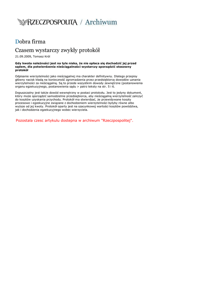 Dobra firma Czasem wystarczy zwykły protokół 21.09.2009, Tomasz Król Gdy kwota naleŜności jest na tyle niska, Ŝe nie opłaca się dochodzić jej przed sądem, dla potwierdzenia nieściągalności wystarczy sporządzić stosowny protokół Odpisanie wierzytelności jako nieściągalnej ma charakter definitywny. Dlatego przepisy główny nacisk kładą na konieczność zgromadzenia przez przedsiębiorcę dowodów uznania wierzytelności za nieściągalną. Są to przede wszystkim dowody zewnętrzne (postanowienia organu egzekucyjnego, postanowienia sądu > patrz teksty na str. 5 i 6. Dopuszczalny jest takŜe dowód wewnętrzny w postaci protokołu. Jest to jedyny dokument, który moŜe sporządzić samodzielnie przedsiębiorca, aby nieściągalną wierzytelność zaliczyć do kosztów uzyskania przychodu. Protokół ma stwierdzać, Ŝe przewidywane koszty procesowe i egzekucyjne związane z dochodzeniem wierzytelności byłyby równe albo wyŜsze od jej kwoty. Protokół oparty jest na szacunkowej wartości kosztów powództwa, jak i dochodzenia egzekucyjnego wobec wierzyciela. Pozostala czesc artykulu dostepna w archiwum "Rzeczpospolitej".