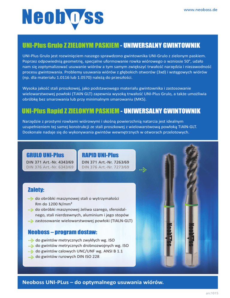 UNI-Plus Grulo Z ZIELONYM PASKIEM - UNIWERSALNY GWINTOWNIK UNI-Plus Grulo jest rozwinięciem naszego sprawdzono gwintownika UNI-Grulo z zielonym paskiem. Poprzez odpowiednią geometrię, specjalne uformowanie rowka wiórowego o wzniosie 50°, udało nam się zoptymalizować usuwanie wiórów a tym samym zwiększyć trwałość narzędzia i niezawodność procesu gwintowania. Problemy usuwania wiórów z głębokich otworów (3xd) i wstęgowych wiórów (np. dla materiału 1.0116 lub 1.0570) należą do przeszłości. Wysoka jakość stali proszkowej, jako podstawowego materiału gwintownika i zastosowanie wielowarstwowej powłoki (TiAlN GLT) zapewnia wysoką trwałość UNI-Plus Grulo, a także umożliwia obróbkę bez smarowania lub przy minimalnym smarowaniu (MKS). UNI-Plus Rapid Z ZIELONYM PASKIEM - UNIWERSALNY GWINTOWNIK Narzędzie z prostymi rowkami wiórowymi i skośną powierzchnią natarcia jest idealnym uzupełnieniem tej samej konstrukcji ze stali proszkowej z wielowarstwową powłoką TiAlN-GLT. Doskonale nadaje się do wykonywania gwintów wewnętrznych w otworach przelotowych. GRULO UNI-Plus RAPID UNI-Plus DIN 371 Art.-Nr. 4343/69 DIN 376 Art.-Nr. 6343/69 DIN 371 Art.-Nr. 7263/69 DIN 376 Art.-Nr. 7273/69 Zalety: do obróbki maszynowej stali o wytrzymałości Rm do 1200 N/mm² do obróbki maszynowej żeliwa szarego, sferoidalnego, stali nierdzewnych, aluminium i jego stopów zastosowanie wielowarstwowej powłoki (TIALN-GLT) Neoboss – program dostaw: do gwintów metrycznych zwykłych wg. ISO do gwintów metrycznych drobnozwojnych wg. ISO do gwintów calowych UNC/UNF wg. ANSI B 1.1 do gwintów rurowych DIN ISO 228 Neoboss UNI-PLus – do optymalnego usuwania wiórów. arc1015 WYKAZ NAJWAŻNIEJSZYCH MATERIAŁÓW: UNI-PLUS jest uniwersalnym narzędziem do obróbki stali o wytrzymałości na rozciąganie do 1200 N/mm2, żeliwa sferoidalnego, żeliwa szarego, stali nierdzewnych, aluminium jak i stopów aluminium. Określenie materiału Wg. DIN. Wytrzymałość Rm (N/mm2) Twardość HB AISI/SAE/ASTM A262 Stal konstrucyjna St37-3 1.0116 370-450 110-130 Stal konstrucyjna St52-3 1.0570 450-680 140-210 Stal do ulepszania cieplnego C45 1.0503 650-850 190-250 1045 Stal do ulepszania cieplnego 42CrMo4 1.7225 800-1.000 240-300 4140 Stal do nawęglania 16MnCr5 1.7131 500-700 160-210 5115 Stal automatowa 95Mn28 1.0715 390-580 110-170 1213 Stal konstrukcyjna (do spawania) StE500 1.8907 560-800 166-238 Stal nierdzewna X12CrS13 1.4005 tal nierdzewna X5CrNi189 1.4301 500-700 160-210 304 Żeliwo sferoidalne GGG50 0.7050 500 160 EN-GJS-500-7 Stopy aluminium G-AlSi6Cu 3.2151 160-200 50-60 416 PORÓWNANIE WYNIKÓW »PRZED I PO« ZASTOSOWANIU GWINTOWNIKA UNI-PLUS: Scenariusz »przed«: Proces przedstawiony po przez zastosowanie zwykłego narzędzia handlowego. Już po kilku zabiegach gwintowania następuje spiętrzenie wiórów. Proces musi zostać przerwany. Należy usunąć wióry. W przeciwnym przypadku narzędzie może ulec awarii a obrabiany detal poważnie uszkodzony. Wynik: Brak bezpieczeństwa procesu, wysokie ryzyko dla obrabianego detalu (możliwość zniszczenia narzędzia), wydłużenie czasu maszynowego, co prowadzi do zwiększenia kosztów. Scenariusz »po«: Znakomite wyniki przy użyciu nowego UNI Plus Grulo TiAlN-GLT. Po przez połączenie 50-stopniowej spirali i specjalnej konstrukcji rowka uzyskano ewakuację wiórów w bok pod większym kątem. Wynik: Brak piętrzenia wiórów wokół chwytu narzędzia, przewidywalna trwałość narzędzia (według normatywu zużycia), przewidywalne i krótsze czasy produkcji a tym samym obniżka kosztów. Neoboss GmbH · Im Brühl 12 · D-72406 Bisingen · tel. +49 (0)7476 9451-0 Jakob Boss Polska · 00-382 Warszawa ul. Solec 85/3 · tel. +48 22 622 35 86 · [email protected] arc1015