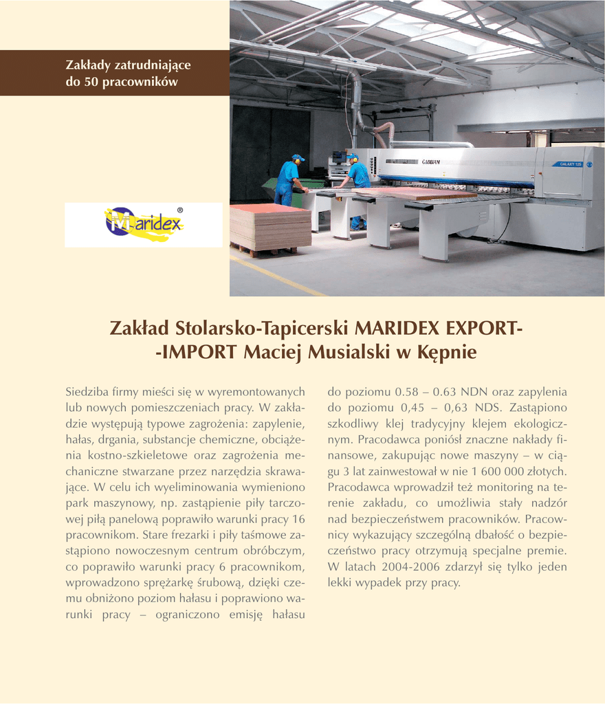 Zakady zatrudniajce do 50 pracowników Zakad Stolarsko-Tapicerski MARIDEX EXPORT-IMPORT Maciej Musialski w Kpnie Siedziba firmy mieci si w wyremontowanych lub nowych pomieszczeniach pracy. W zakadzie wystpuj typowe zagroenia: zapylenie, haas, drgania, substancje chemiczne, obcienia kostno-szkieletowe oraz zagroenia mechaniczne stwarzane przez narzdzia skrawajce. W celu ich wyeliminowania wymieniono park maszynowy, np. zastpienie piy tarczowej pi panelow poprawio warunki pracy 16 pracownikom. Stare frezarki i piy tamowe zastpiono nowoczesnym centrum obróbczym, co poprawio warunki pracy 6 pracownikom, wprowadzono sprark rubow, dziki czemu obniono poziom haasu i poprawiono warunki pracy – ograniczono emisj haasu do poziomu 0.58 – 0.63 NDN oraz zapylenia do poziomu 0,45 – 0,63 NDS. Zastpiono szkodliwy klej tradycyjny klejem ekologicznym. Pracodawca poniós znaczne nakady finansowe, zakupujc nowe maszyny – w cigu 3 lat zainwestowa w nie 1 600 000 zotych. Pracodawca wprowadzi te monitoring na terenie zakadu, co umoliwia stay nadzór nad bezpieczestwem pracowników. Pracownicy wykazujcy szczególn dbao o bezpieczestwo pracy otrzymuj specjalne premie. W latach 2004-2006 zdarzy si tylko jeden lekki wypadek przy pracy. Warto inwestowa Do udziau w konkursie Pastwowej Inspekcji Pracy „Pracodawca – organizator pracy bezpiecznej” skonia mnie ch poddania si obiektywnej ocenie. Chciaem sprawdzi, czy obrany blisko 11 lat temu kierunek rozwoju zakadu zostanie pozytywnie oceniony przez profesjonalistów w tym zakresie. Ponadto uczestnictwo w konkursie, a zwaszcza uzyskanie dobrego wyniku, dodaje prestiu zakadowi. Inwestowanie w popraw warunków pracy jest niezbdnym czynnikiem rozwoju zakadu. Obecnie rynek pracy bardzo si rozwija. Trudno dzisiaj znale pracowników do obsugi niebezpiecznych maszyn obrabiajcych drewno lub pyty wiórowe. Dlatego wymiana obrabiarek starszego typu na nowoczesne, zapewniajce pene zabezpieczenie pracowników obsugi przed urazami, to konieczno. Tym bardziej, e poprawa bezpieczestwa pracy idzie w parze z uzyskaniem lepszej jakoci produkowanych wyrobów. Z pewnoci mog powiedzie, e inwestycja w bezpieczestwo i higien pracy po prostu si opaca. Maciej Musialski – waciciel Pidziesit wzorów mebli Zakad stolarsko-tapicerski MARIDEX powsta w 1996 roku. Dziaalno rozpocz w adaptowanym na warsztat budynku gospodarczym, gdzie z pófabrykatów montowane byy awostoy. Pierwsi pracownicy zostali zatrudnieni w 1997 roku. Wtedy te, uywajc prostych maszyn do obróbki drewna, rozpoczto produkcj drobnych mebli z pyt laminowanych. Obecnie zakad produkuje okoo 50 wzorów mebli mieszkaniowych, takich jak biurka, garderoby, komody, meblocianki. Zakad zatrudnia 35 pracowników, w tym 7 kobiet. Waciciel zakadu dba o bezpieczestwo, higien i ergonomi pracy, wdraajc programy prewencyjne. Ich czci jest ocena ryzyka, ograniczenie jego wystpowania, a take informowanie pracowników o moliwych zagroeniach i sposobach zapobiegania wypadkom.