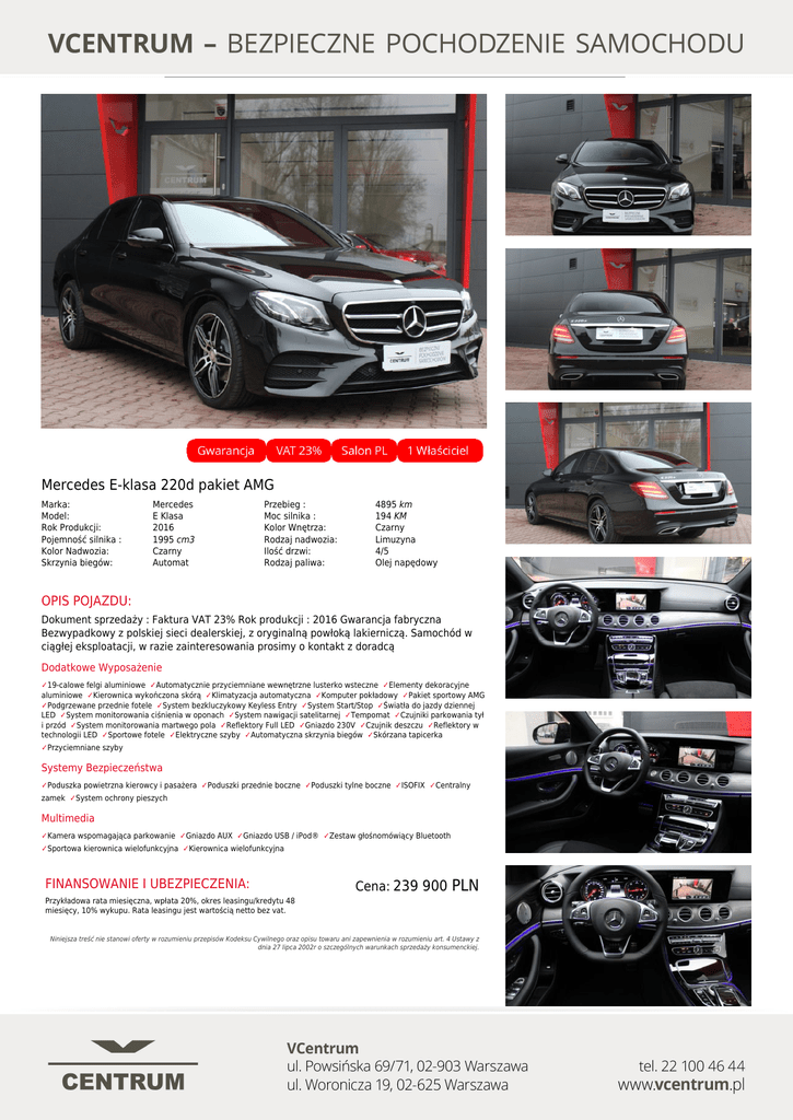 Mercedes E-klasa 220d pakiet AMG Marka: Model: Rok Produkcji: Pojemność silnika : Kolor Nadwozia: Skrzynia biegów: Mercedes E Klasa 2016 1995 cm3 Czarny Automat Przebieg : Moc silnika : Kolor Wnętrza: Rodzaj nadwozia: Ilość drzwi: Rodzaj paliwa: 4895 km 194 KM Czarny Limuzyna 4/5 Olej napędowy OPIS POJAZDU: Dokument sprzedaży : Faktura VAT 23% Rok produkcji : 2016 Gwarancja fabryczna Bezwypadkowy z polskiej sieci dealerskiej, z oryginalną powłoką lakierniczą. Samochód w ciągłej eksploatacji, w razie zainteresowania prosimy o kontakt z doradcą Dodatkowe Wyposażenie ✓19-calowe felgi aluminiowe ✓Automatycznie przyciemniane wewnętrzne lusterko wsteczne ✓Elementy dekoracyjne aluminiowe ✓Kierownica wykończona skórą ✓Klimatyzacja automatyczna ✓Komputer pokładowy ✓Pakiet sportowy AMG ✓Podgrzewane przednie fotele ✓System bezkluczykowy Keyless Entry ✓System Start/Stop ✓Światła do jazdy dziennej LED ✓System monitorowania ciśnienia w oponach ✓System nawigacji satelitarnej ✓Tempomat ✓Czujniki parkowania tył i przód ✓System monitorowania martwego pola ✓Reflektory Full LED ✓Gniazdo 230V ✓Czujnik deszczu ✓Reflektory w technologii LED ✓Sportowe fotele ✓Elektryczne szyby ✓Automatyczna skrzynia biegów ✓Skórzana tapicerka ✓Przyciemniane szyby Systemy Bezpieczeństwa ✓Poduszka powietrzna kierowcy i pasażera ✓Poduszki przednie boczne ✓Poduszki tylne boczne ✓ISOFIX ✓Centralny zamek ✓System ochrony pieszych Multimedia ✓Kamera wspomagająca parkowanie ✓Gniazdo AUX ✓Gniazdo USB / iPod® ✓Zestaw głośnomówiący Bluetooth ✓Sportowa kierownica wielofunkcyjna ✓Kierownica wielofunkcyjna FINANSOWANIE I UBEZPIECZENIA: Cena: 239 900 PLN Przykładowa rata miesięczna, wpłata 20%, okres leasingu/kredytu 48 miesięcy, 10% wykupu. Rata leasingu jest wartością netto bez vat. Niniejsza treść nie stanowi oferty w rozumieniu przepisów Kodeksu Cywilnego oraz opisu towaru ani zapewnienia w rozumieniu art. 4 Ustawy z dnia 27 lipca 2002r o szczególnych warunkach sprzedaży konsumenckiej. Powered by TCPDF (www.tcpdf.org)
